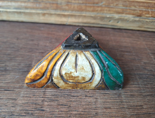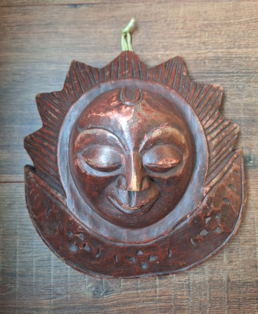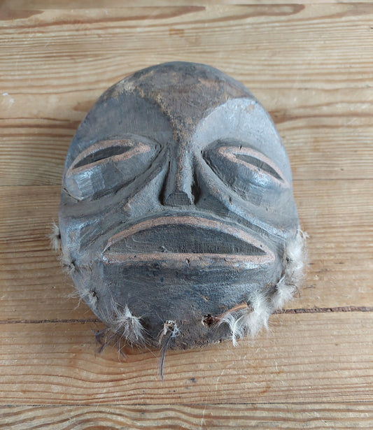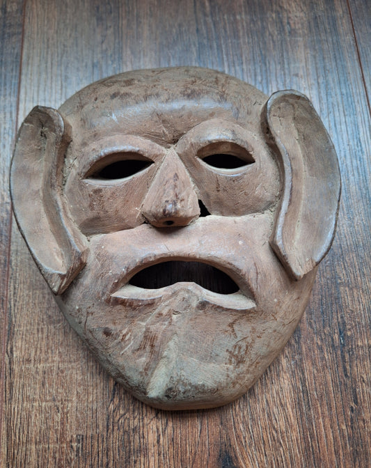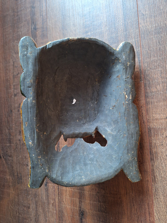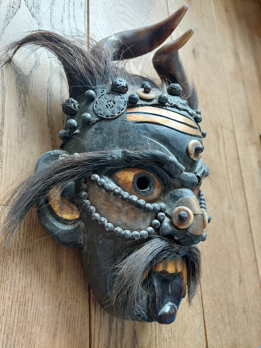 Vintage wooden wrathful spirit mask with beads, metal plating and yak hair #1