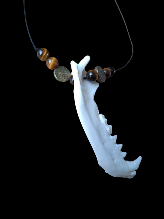 Badger jaw bone and tiger's eye amulet necklace
