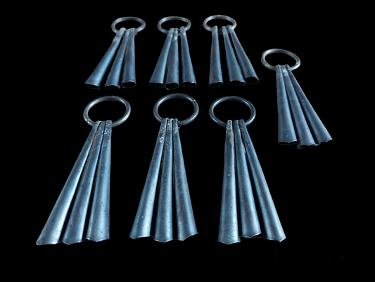 Bells in shamanism serve multiple purposes. Their sounds and vibrations cleanse space and energyfields, they call in the helpfull spirits and drive out the heavy ones. They can be seen as complete spirithouses themselves, or for that purpose been sewn on ritual costumes, attributes and spirit dolls. Their sounds are the voices of the spirits inhabiting them.