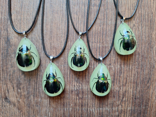 Beetle in glow-in-the-dark resin necklace