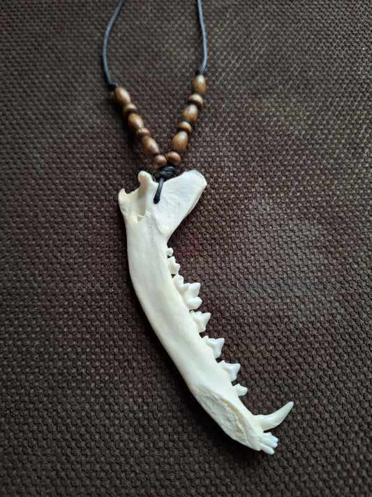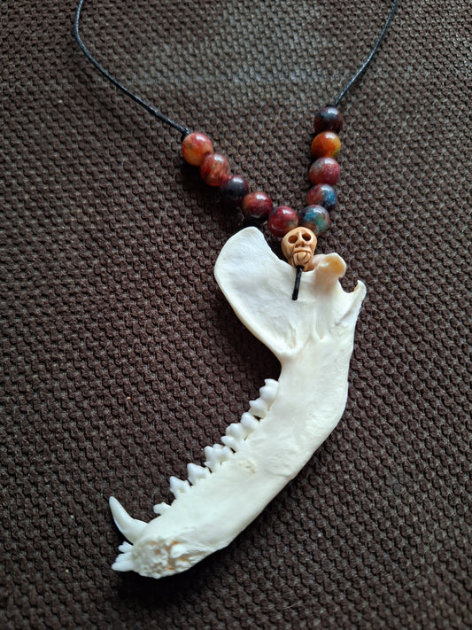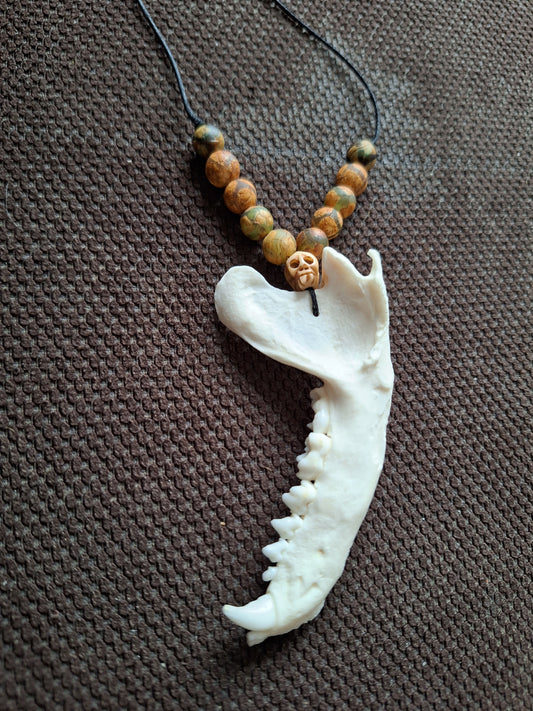 Racoon jaw bone with yak bone skull and wooden beads amulet necklace
