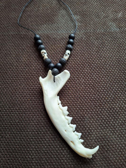 Fox jaw bone with obsidian, lava stone and yak bone skulls amulet necklace