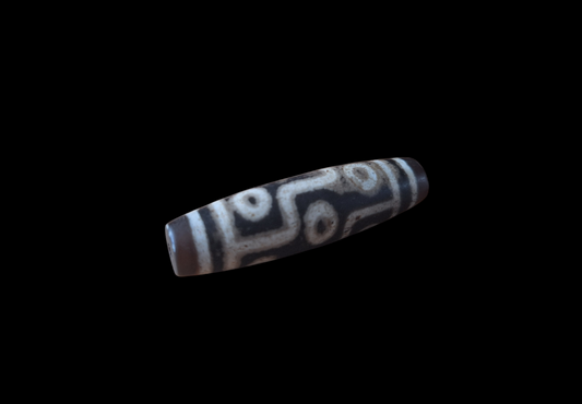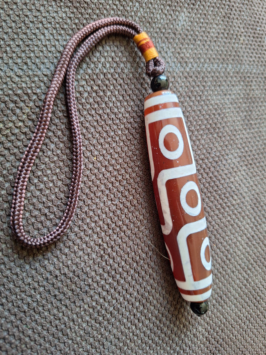Dzi beads are amulets, mostly made from agate and often with symbols etched in them. They are said to be 'beetles from heaven', sent down by the gods to the human world to help, protect and bring prosperity. Every dzi bead is unique and has different meanings depending on the symbols upon it.