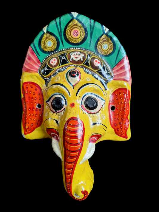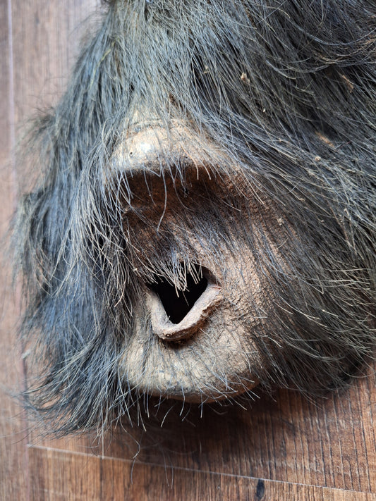Antique Nepalese wooden mask with rudraksha and yak hide