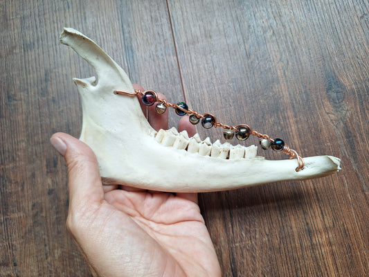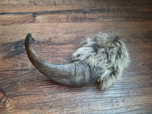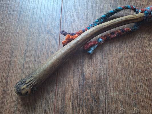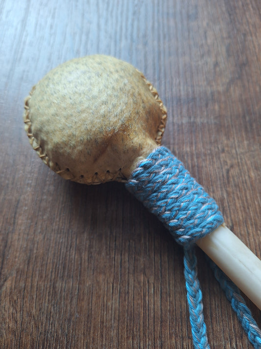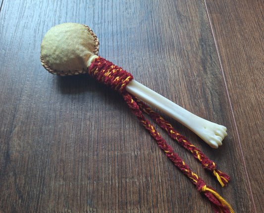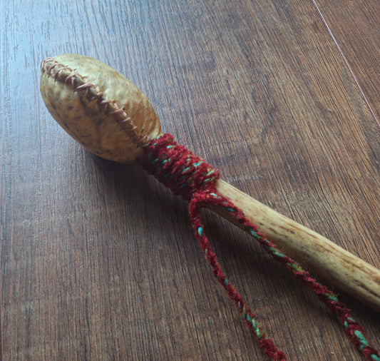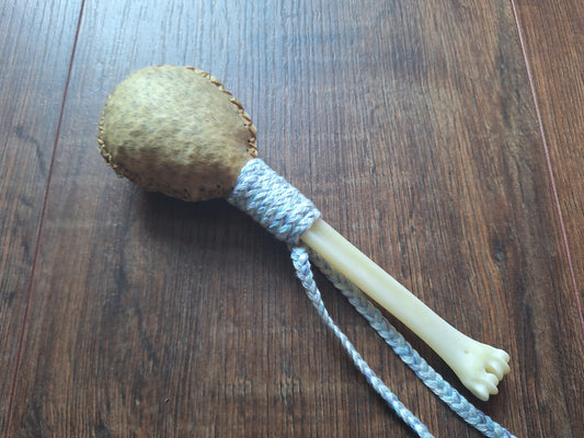 The rattles here in our shop are mostly from the 'closed container' kind; they consist of a container made from rawhide, filled with rattling ingredients, attached to some sort of handle from wood, bone or antler.