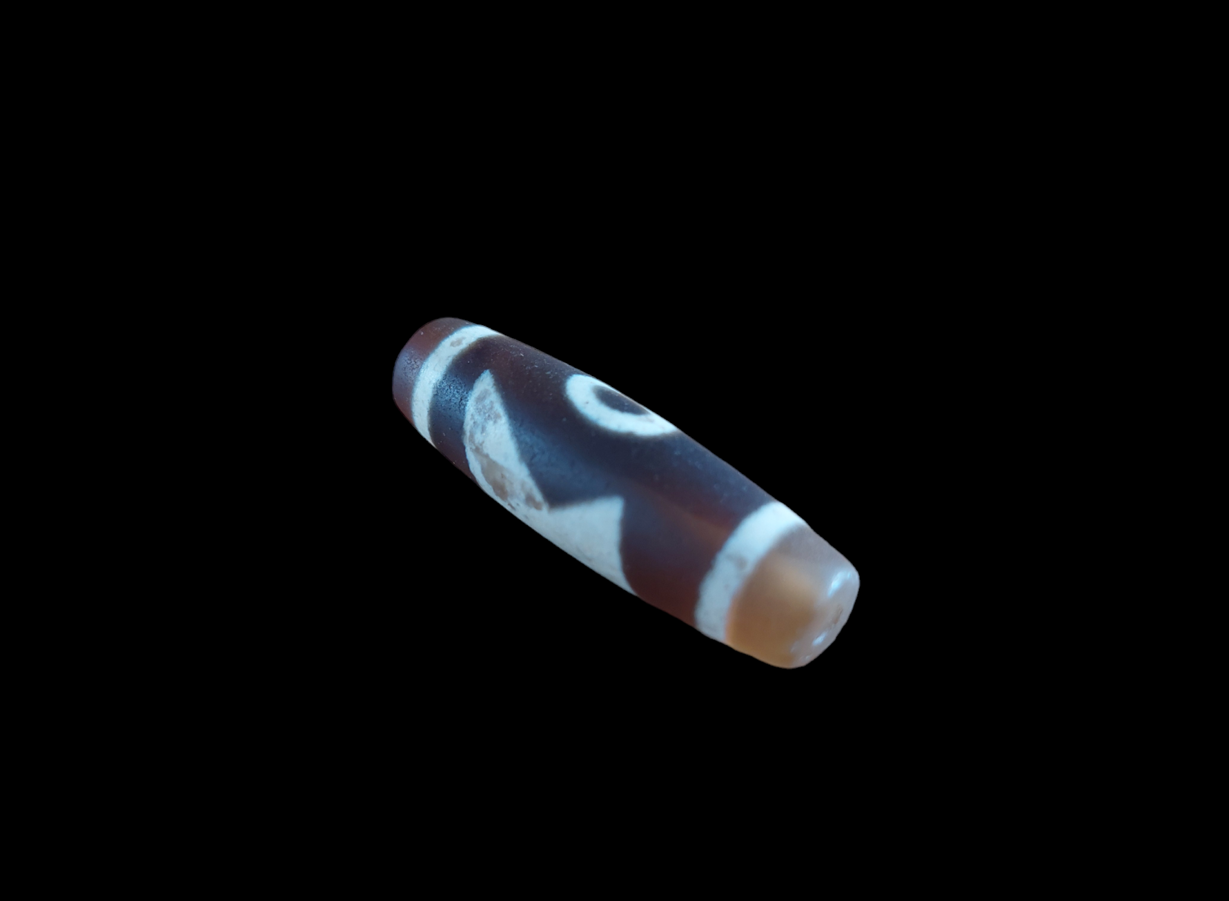 This dzi bead is decorated with two symbols; on one side 5 circles in the pattern of a cross can be seen, and on the other side a lightning flash.