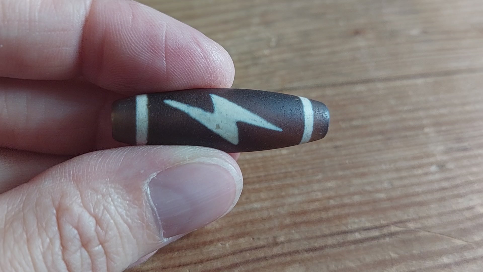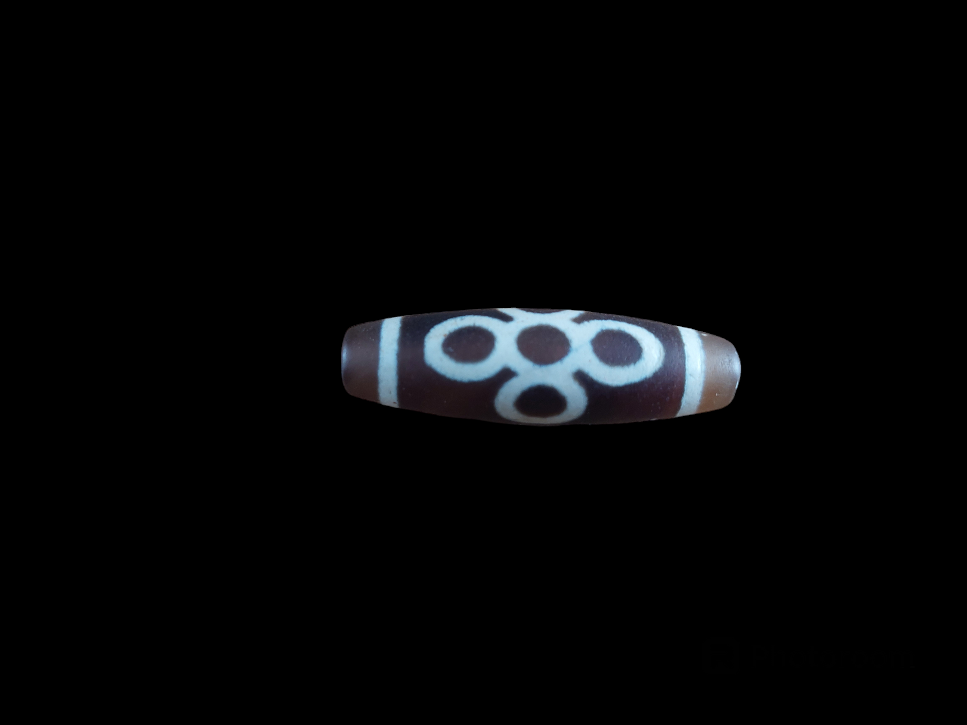 This dzi bead is decorated with two symbols; on one side 5 circles in the pattern of a cross can be seen, and on the other side a lightning flash.