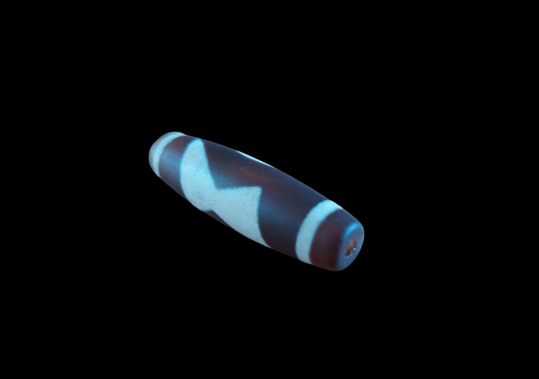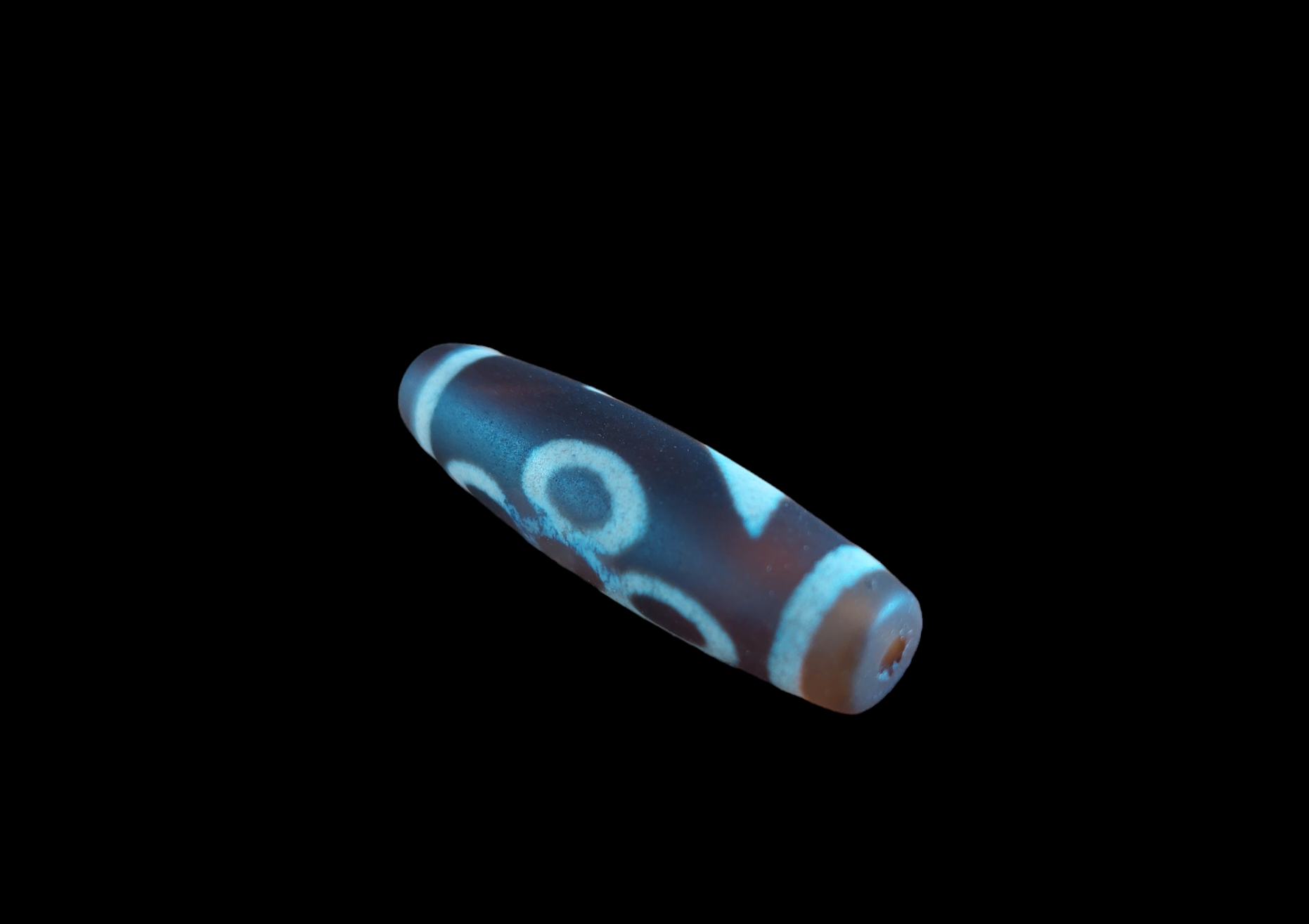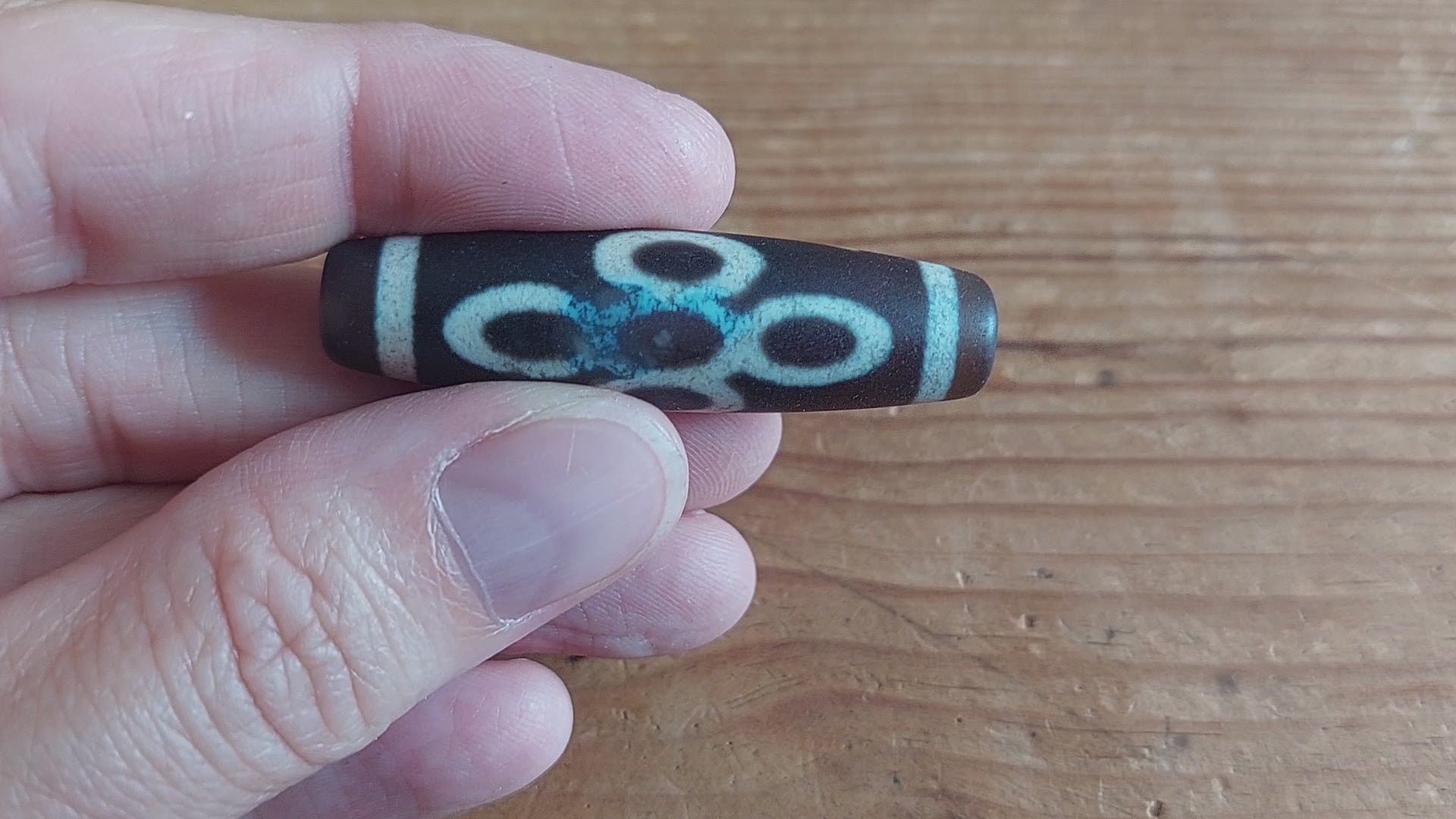 This dzi bead is decorated with two symbols; on one side 5 circles in the pattern of a cross can be seen, and on the other side a lightning flash.