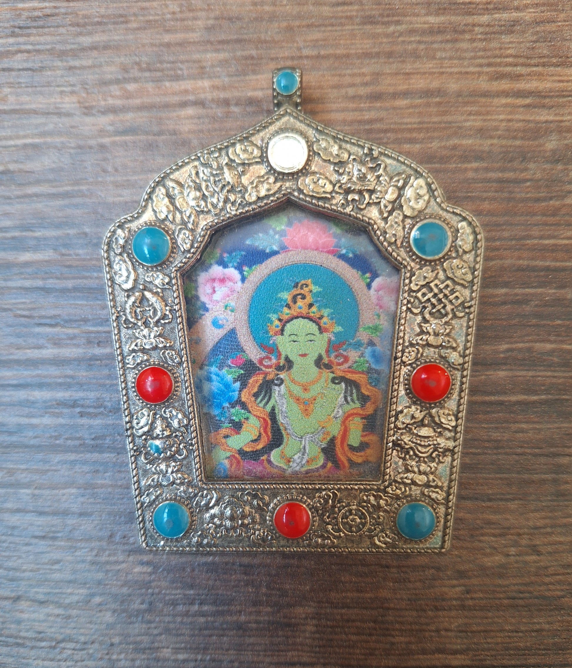 This gau holds the image of Green Tara, printed on a piece of thick, durable nylon fabric. Green Tara is one of the most important, dynamic and highly-revered manifestations of the buddhist deity Tara, the female counterpart of the boddhisattva Avalokiteshvara. One of the stories about her origin tells how she was born from his stream of tears when he looked down from heaven and saw the increasing sufferings of humanity. One of Green Tara’s main goals is thus to relieve sufferings and aid human beings to achieve enlightenment.