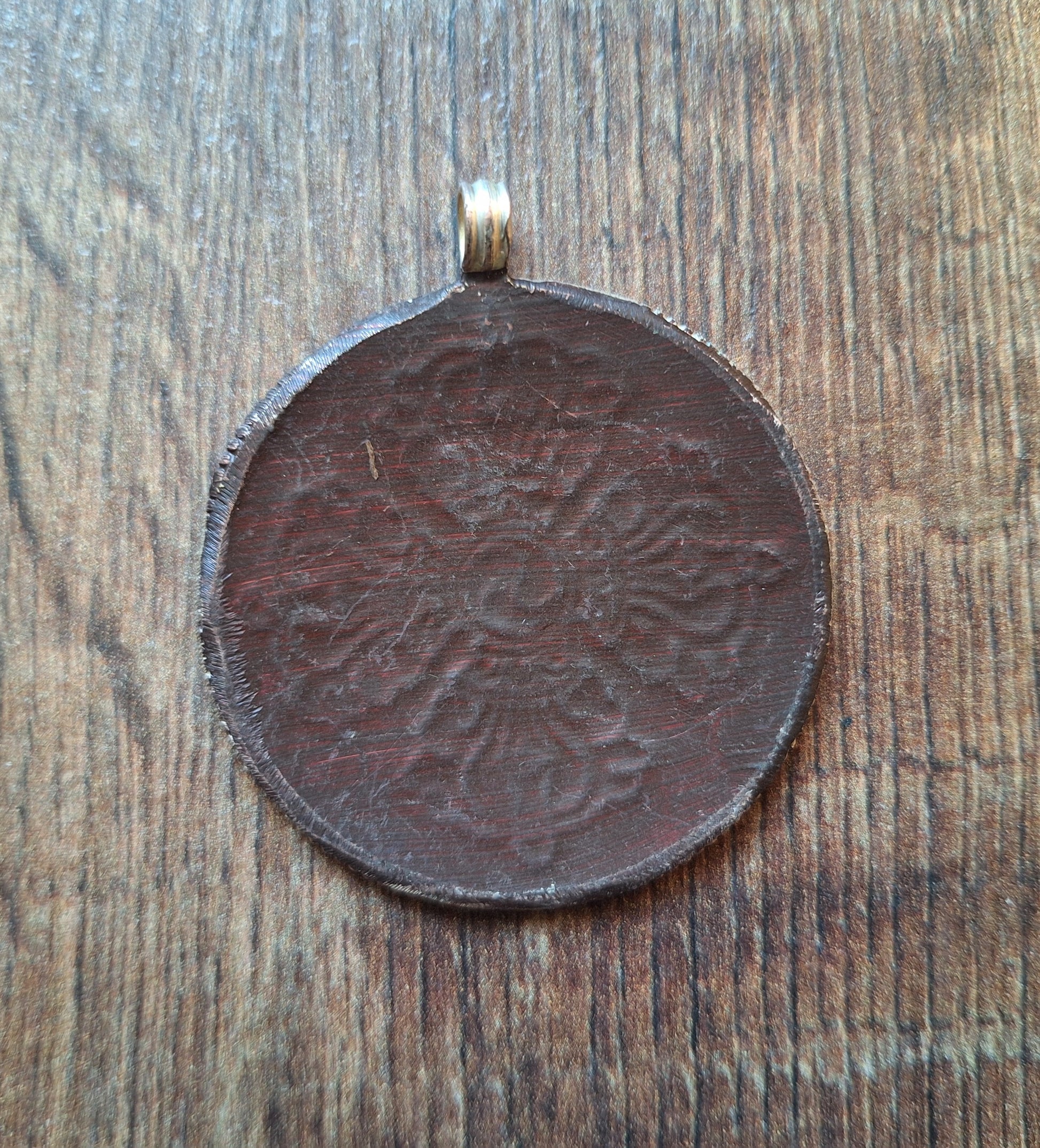 The silvery alpaca metal base has been painted with a dark red-brown color. On the frontside, the symbol of a double dorje can be seen.