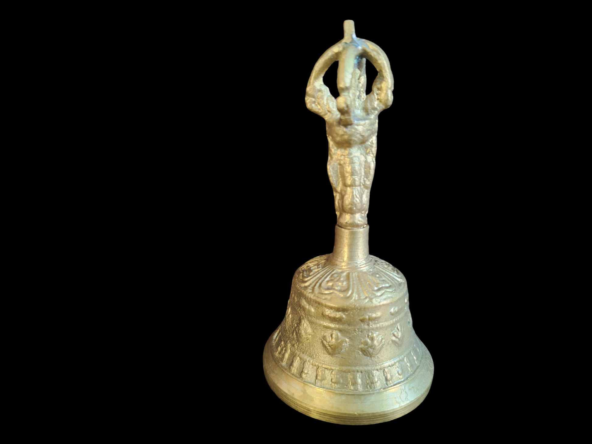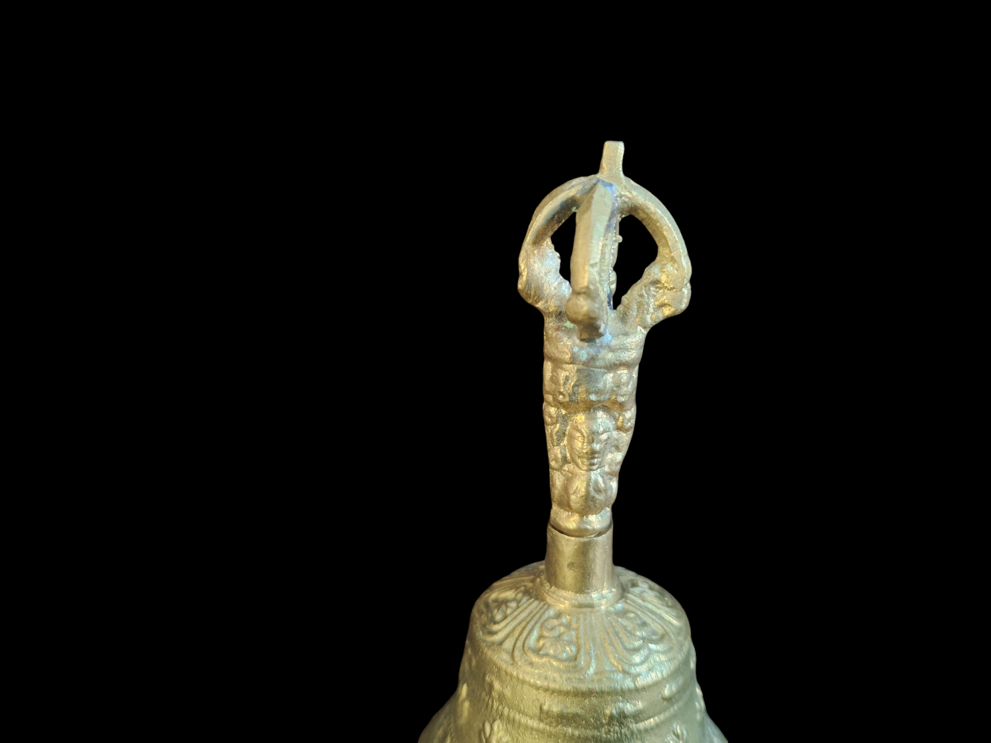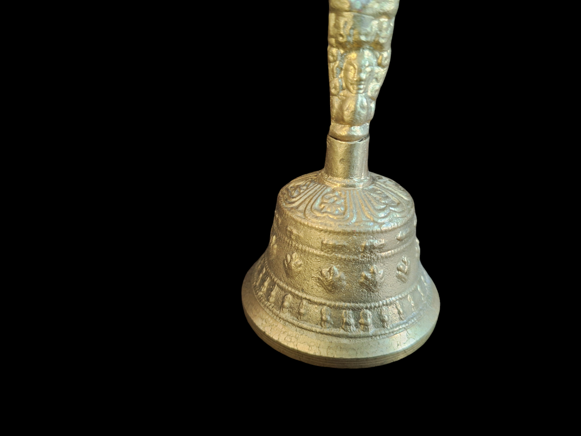 Also the handle of the bell is filled with symbolism; the face is that of the Great Mother Prajnaparamita. The shapes in the stem below her represent the earth and a vase of treasures. Above the face of the Mother, a lotus pedestal forms the base for the crown of a five-pronged dorje.