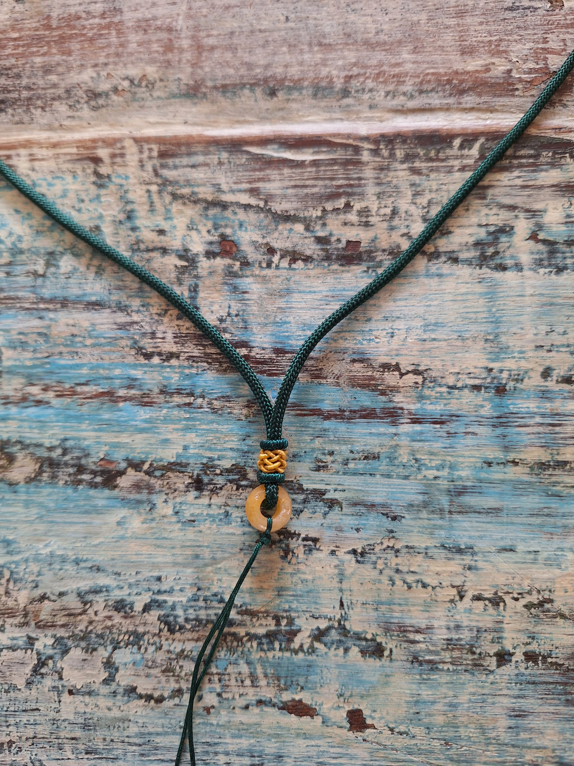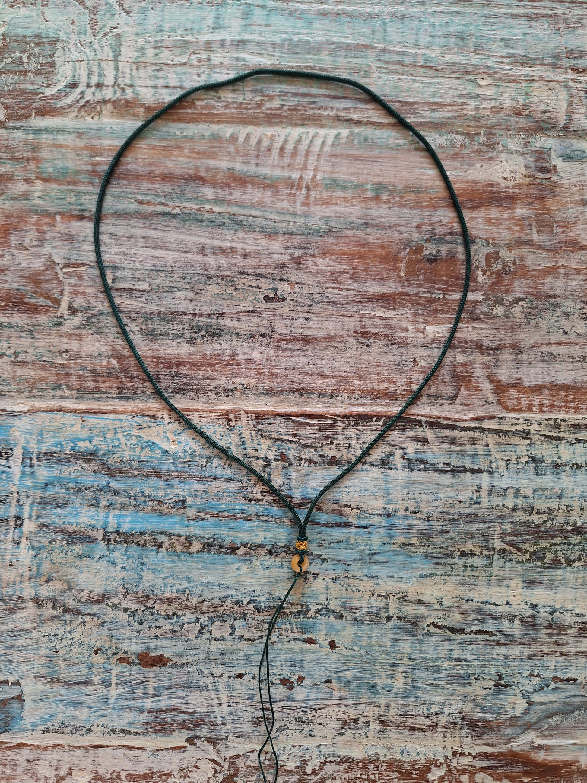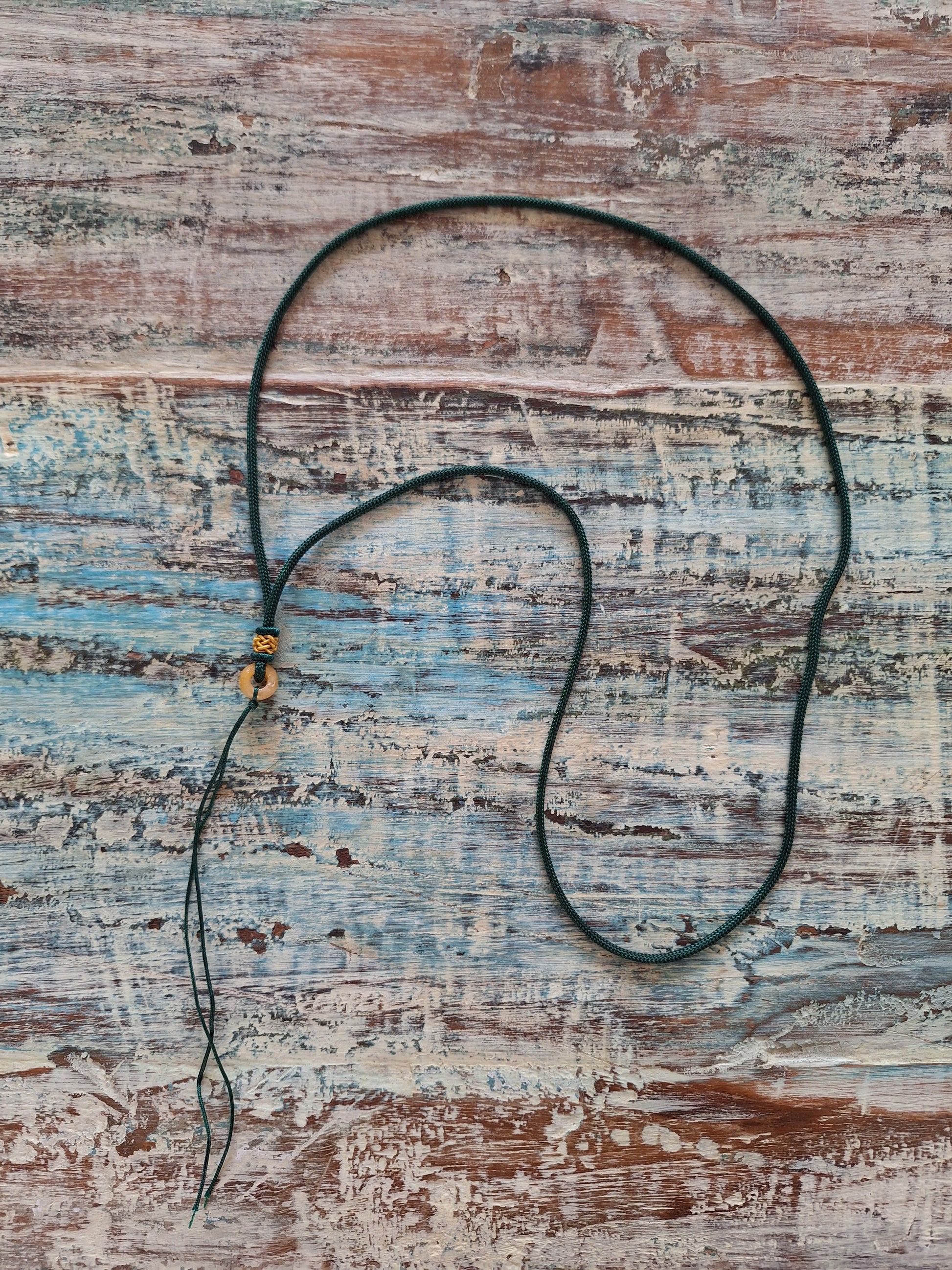 This cord is made from a good quality, lightweight and durable nylon in a dark green color. In the center there's a small decoration of an endless-knot weaving in a contrasting orange color and a honey-yellow donut-shaped jade bead (size of this bead is approximately 1 centimeters diameter and 5 millimeters thick).