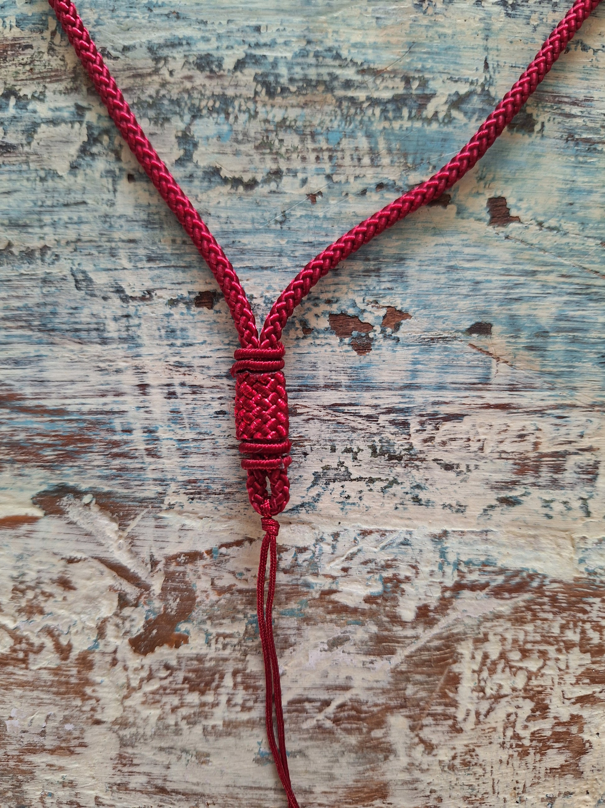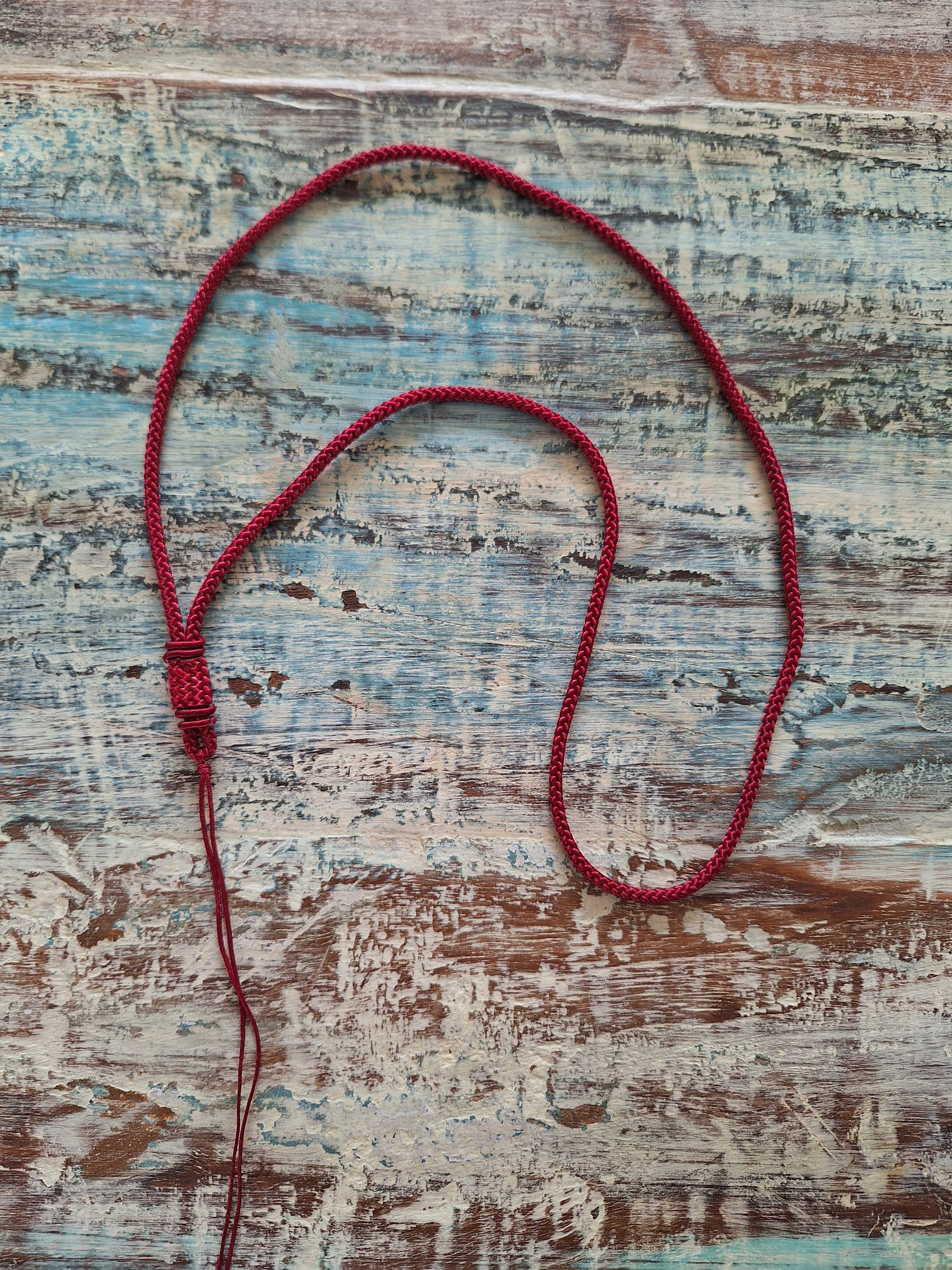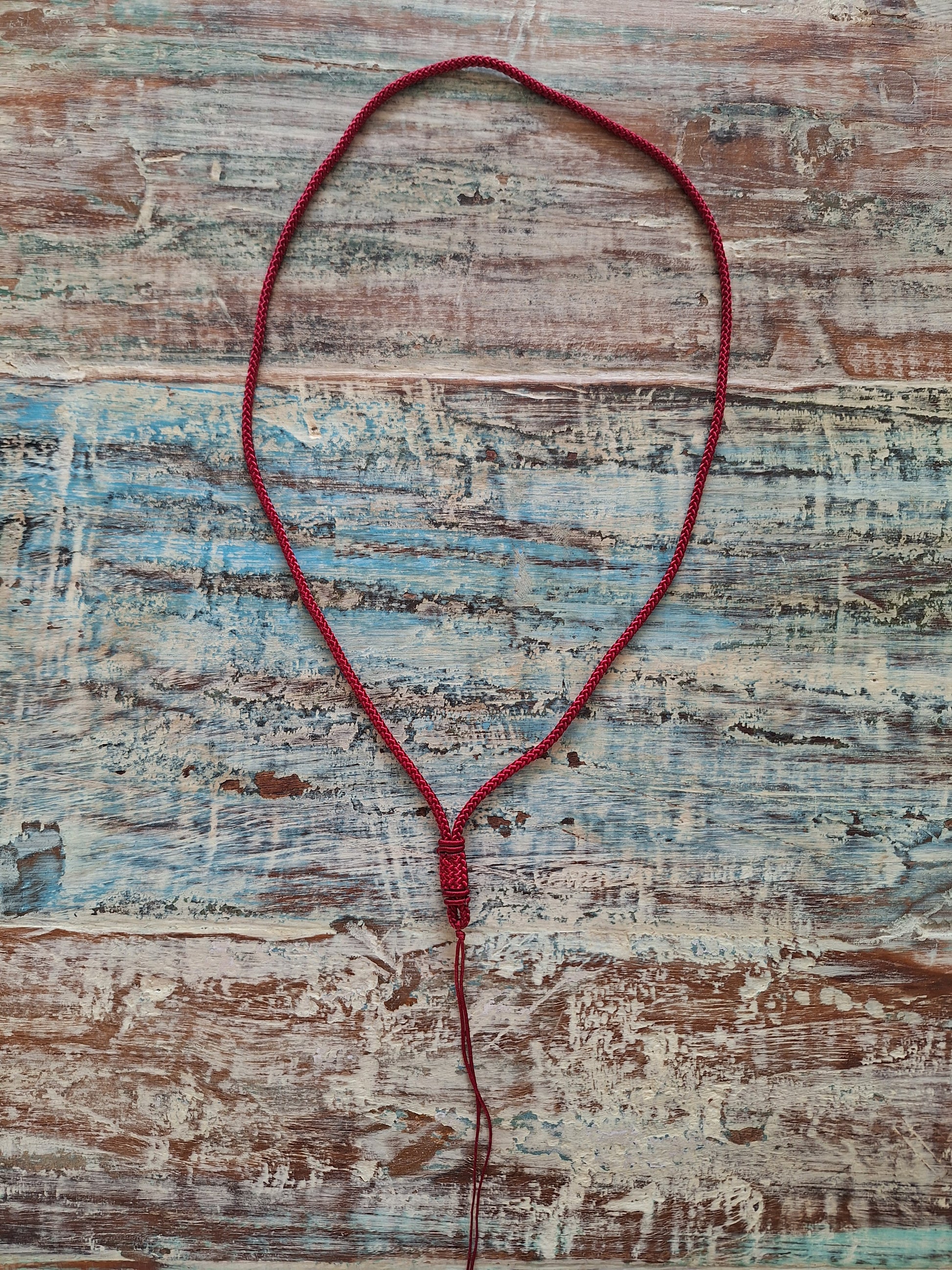 This cord is made from a good quality, lightweight and durable nylon in a burgundy red color. In the center there's a subtle decoration of an endless-knot weaving.