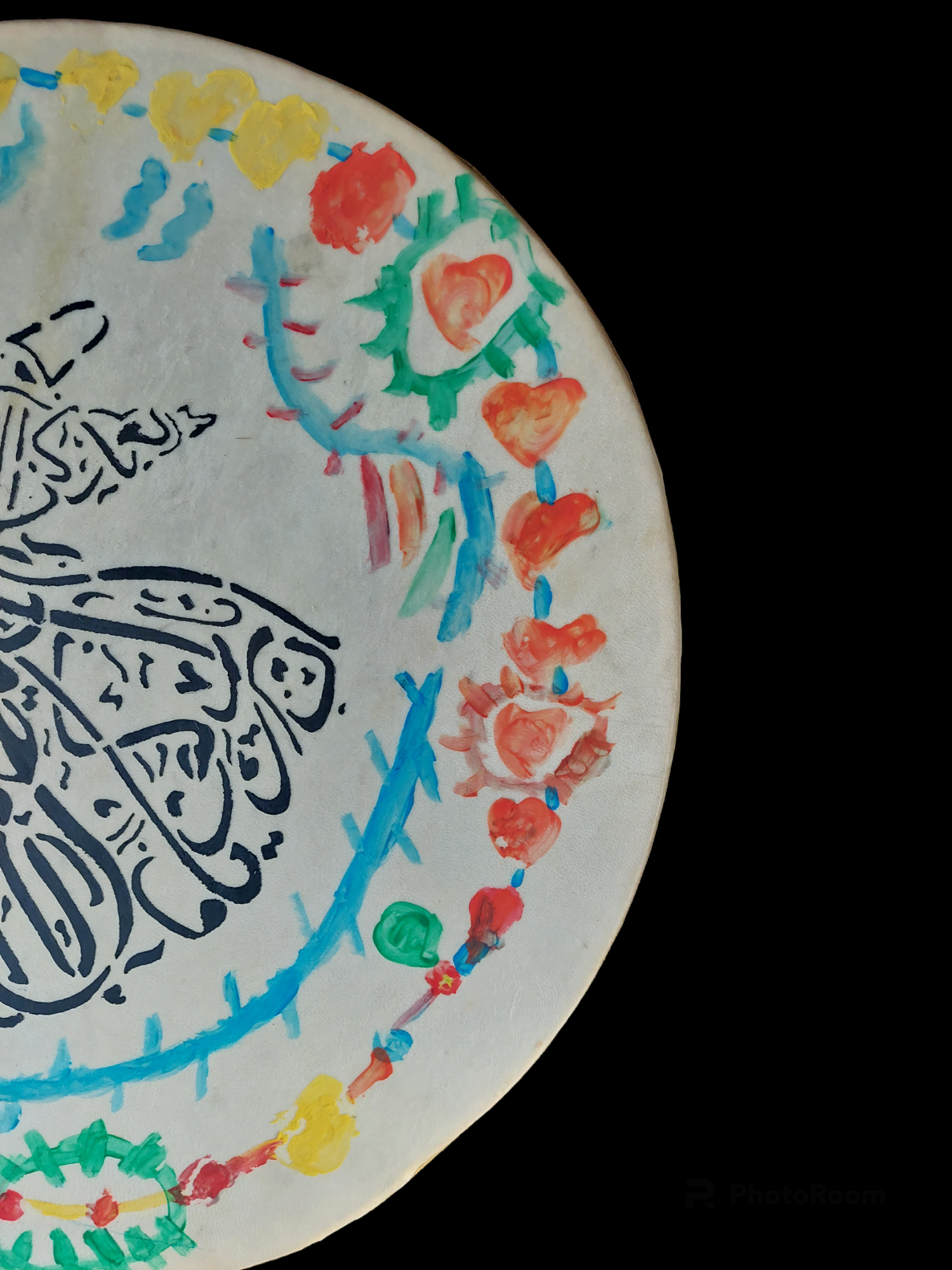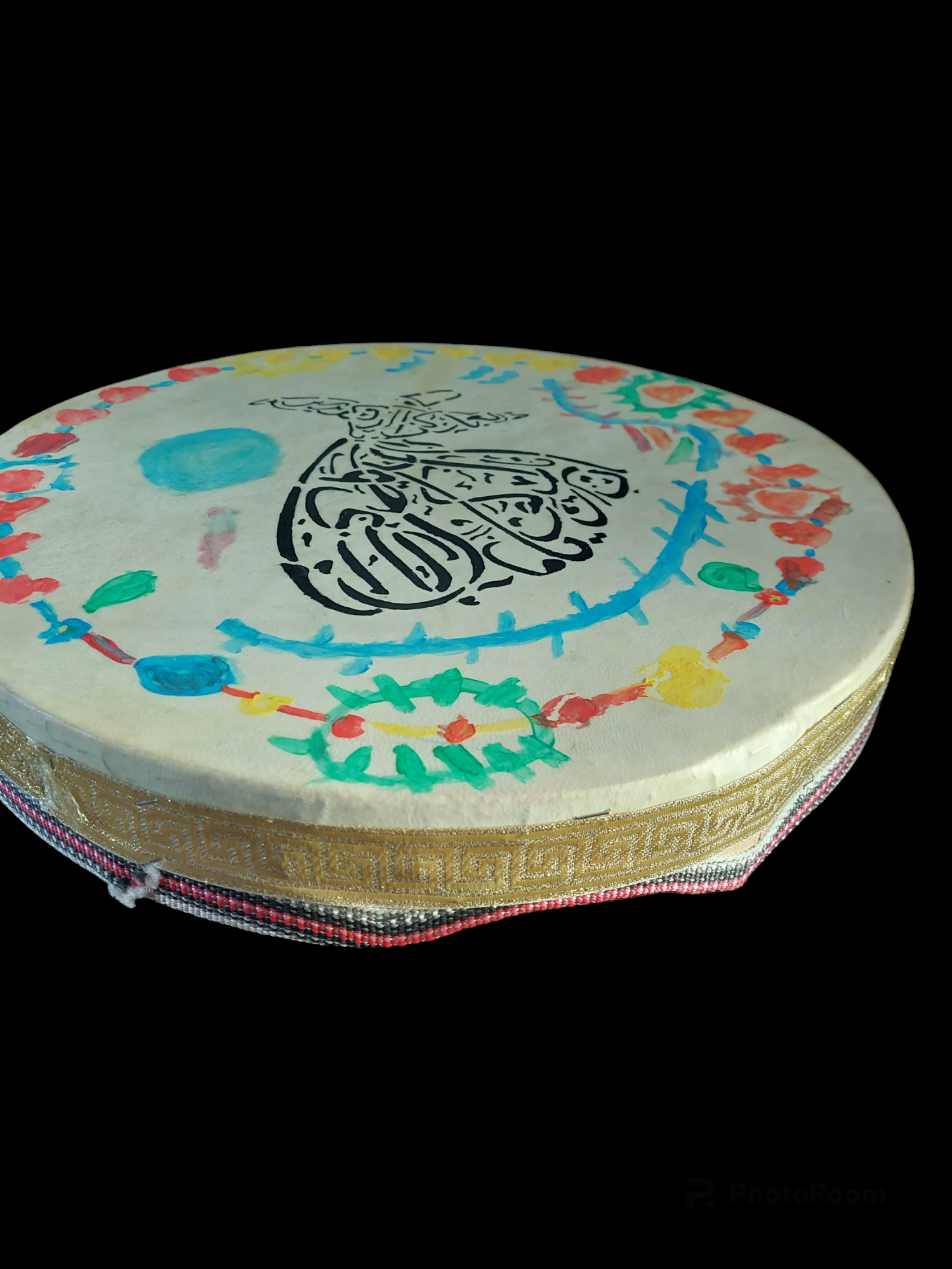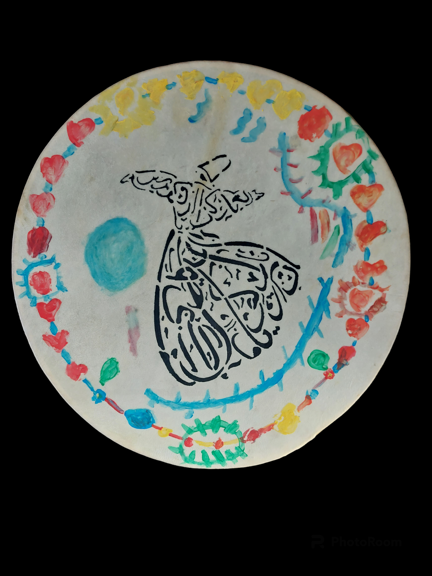 Frame drum made in Anatolia with colorful paintings depicting a dervish dancer. This drum is played with fingers/hand, while holding it with the other hand at the crescent-shaped cutout in the frame. Inside the frame metal rings are hung, to give an extra rattle/jingle effect while drumming.