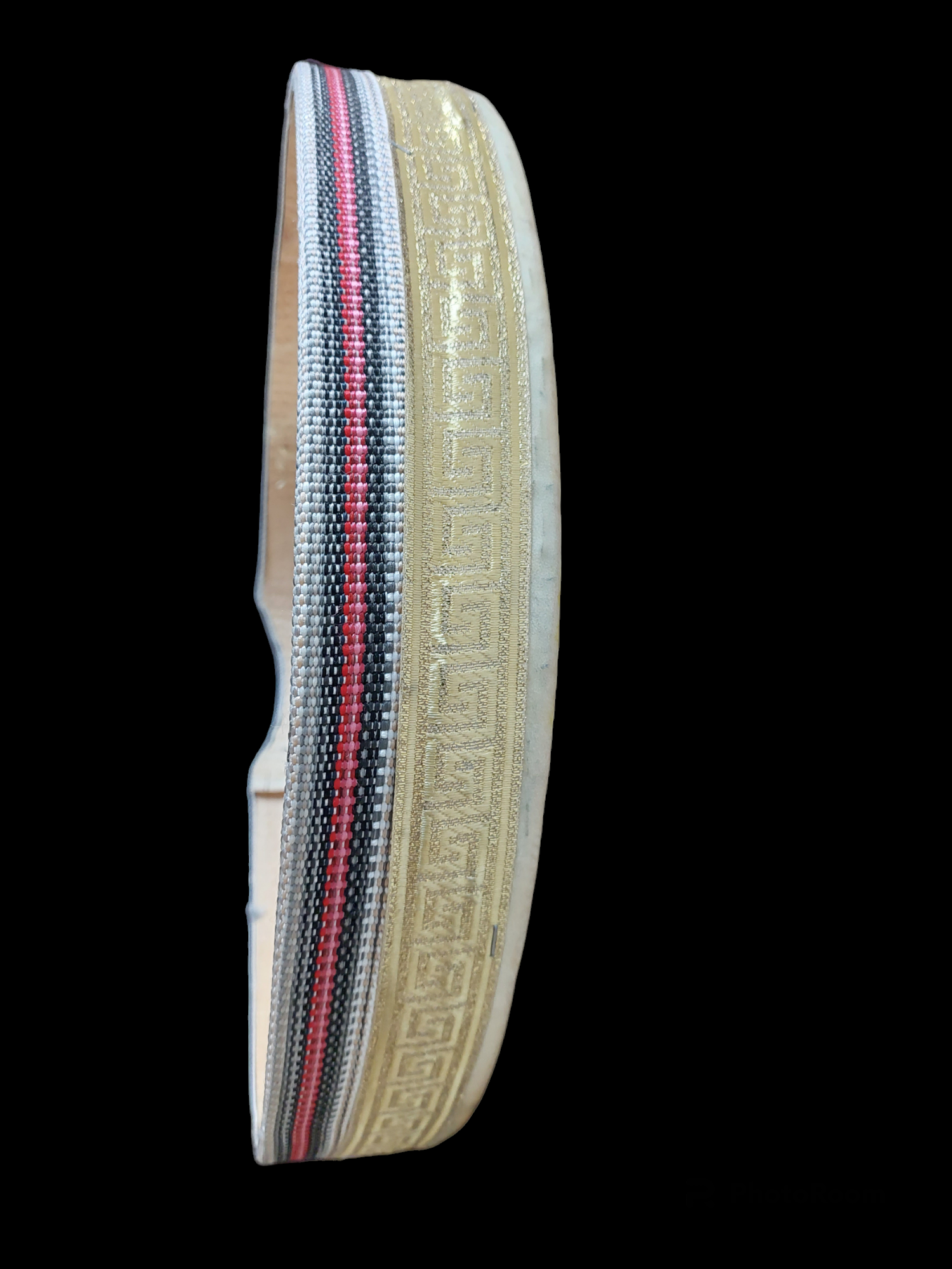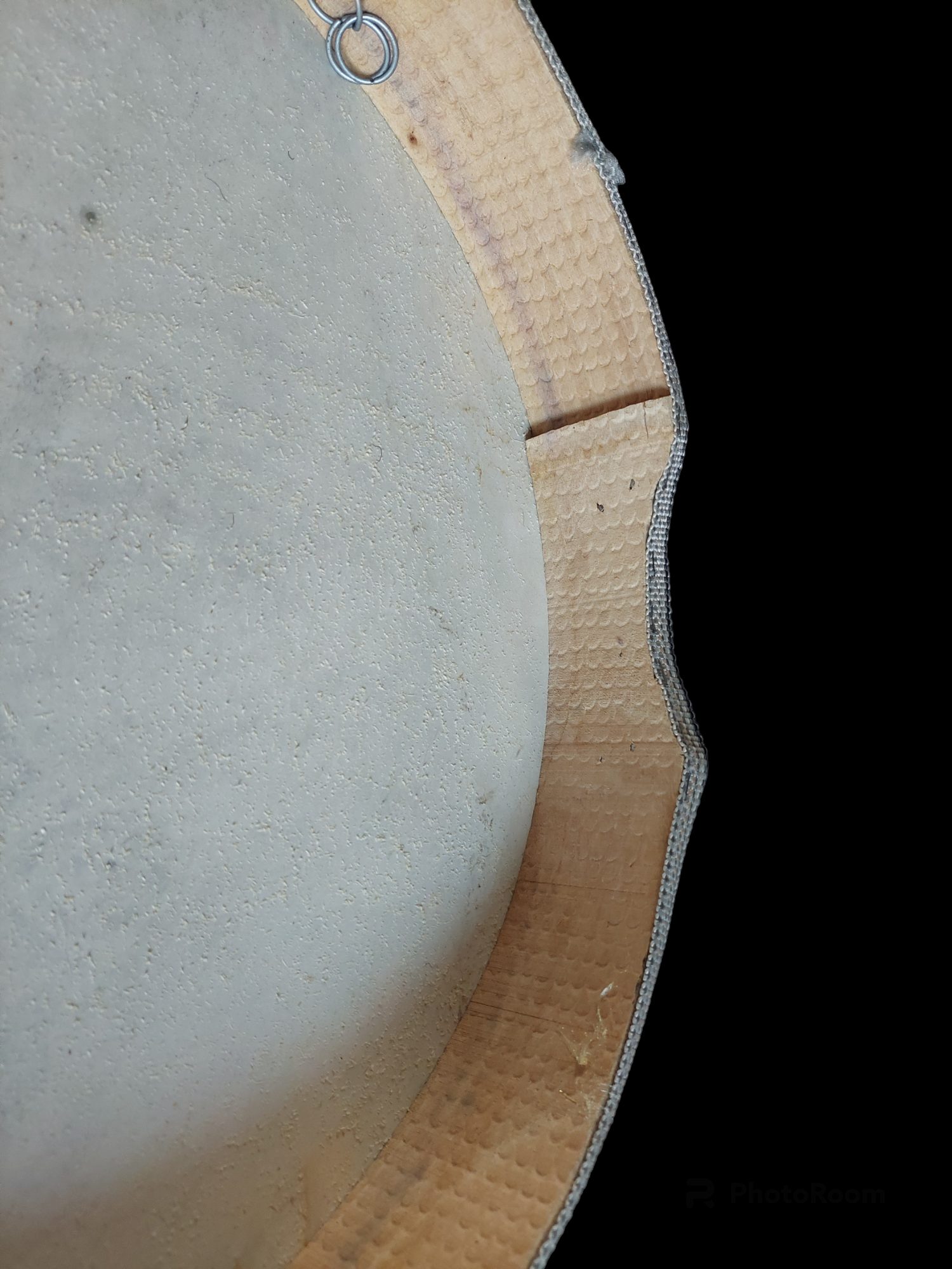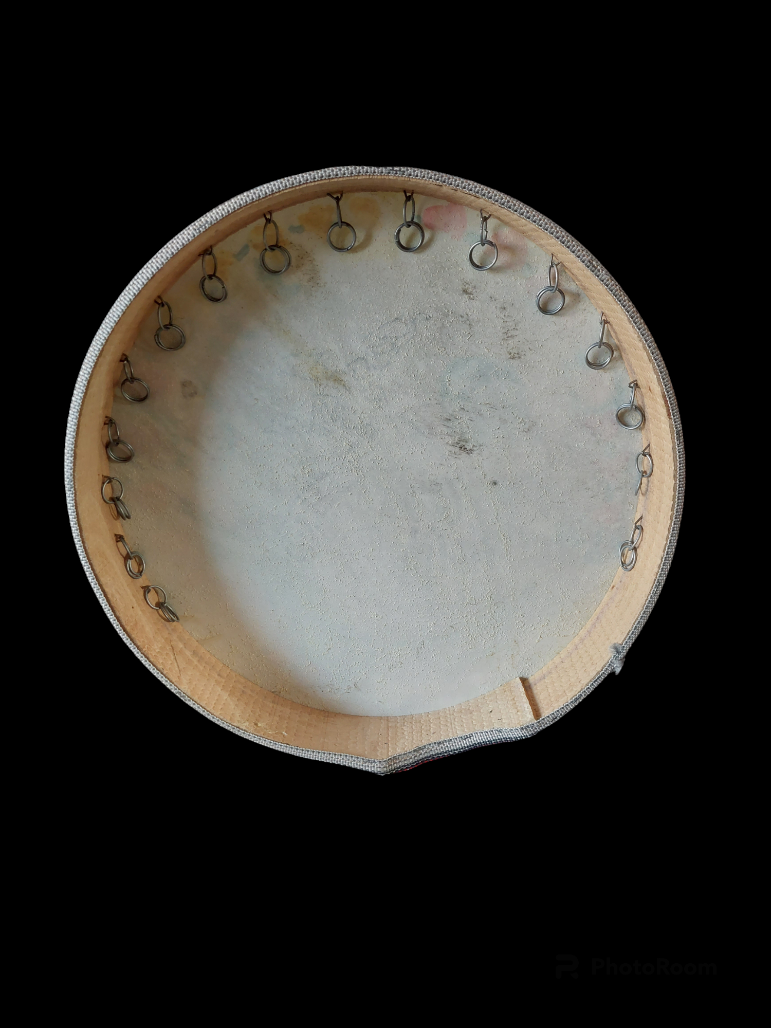 This drum is made with a simple wooden hoop and goat hide, and decorated around the frame with some shiny fabric. It is not of particularly high quality material and craftmanship, but the sound is actually quite nice and steady, not much depending on temperature or moisture qualities of the air.