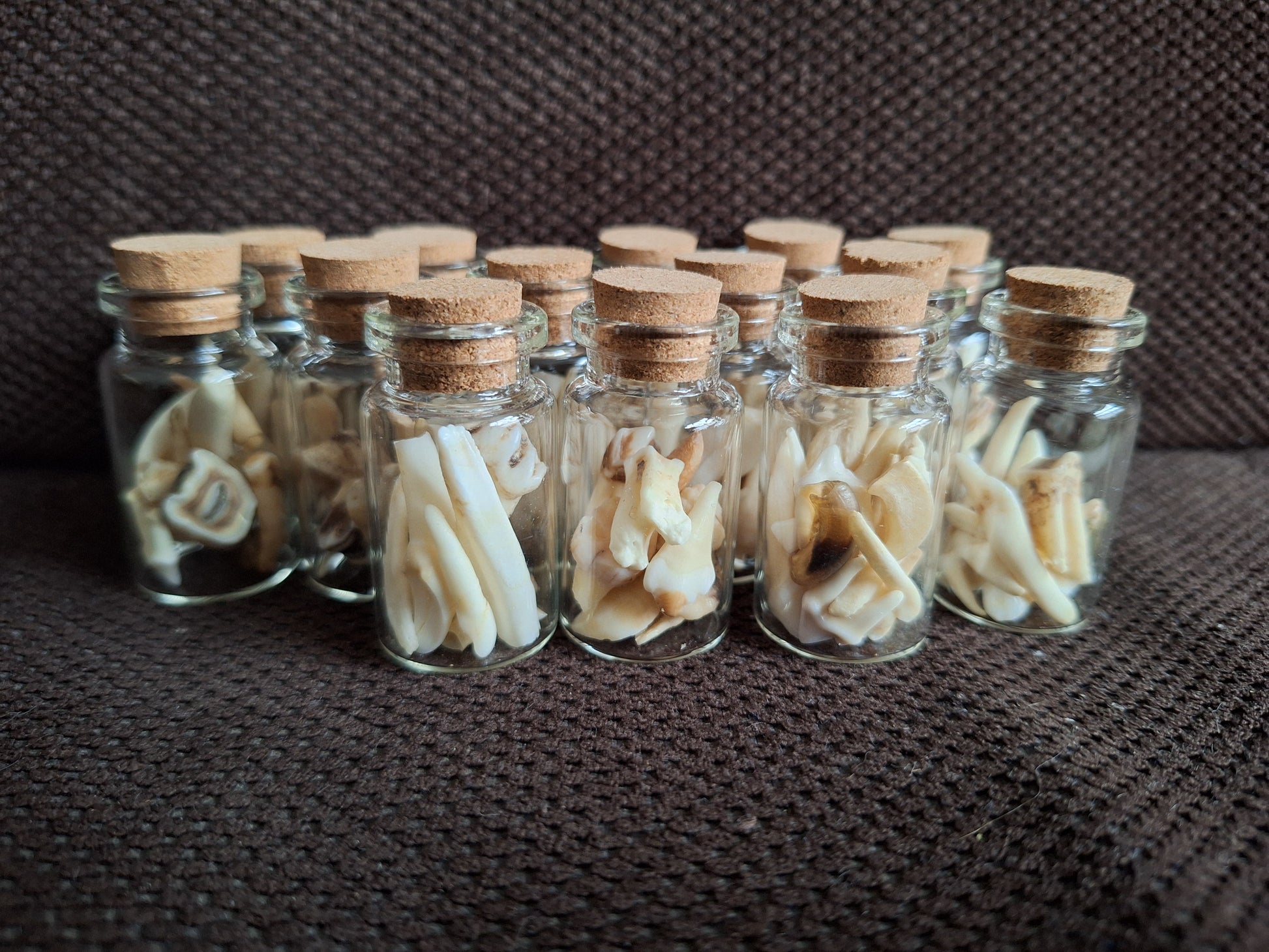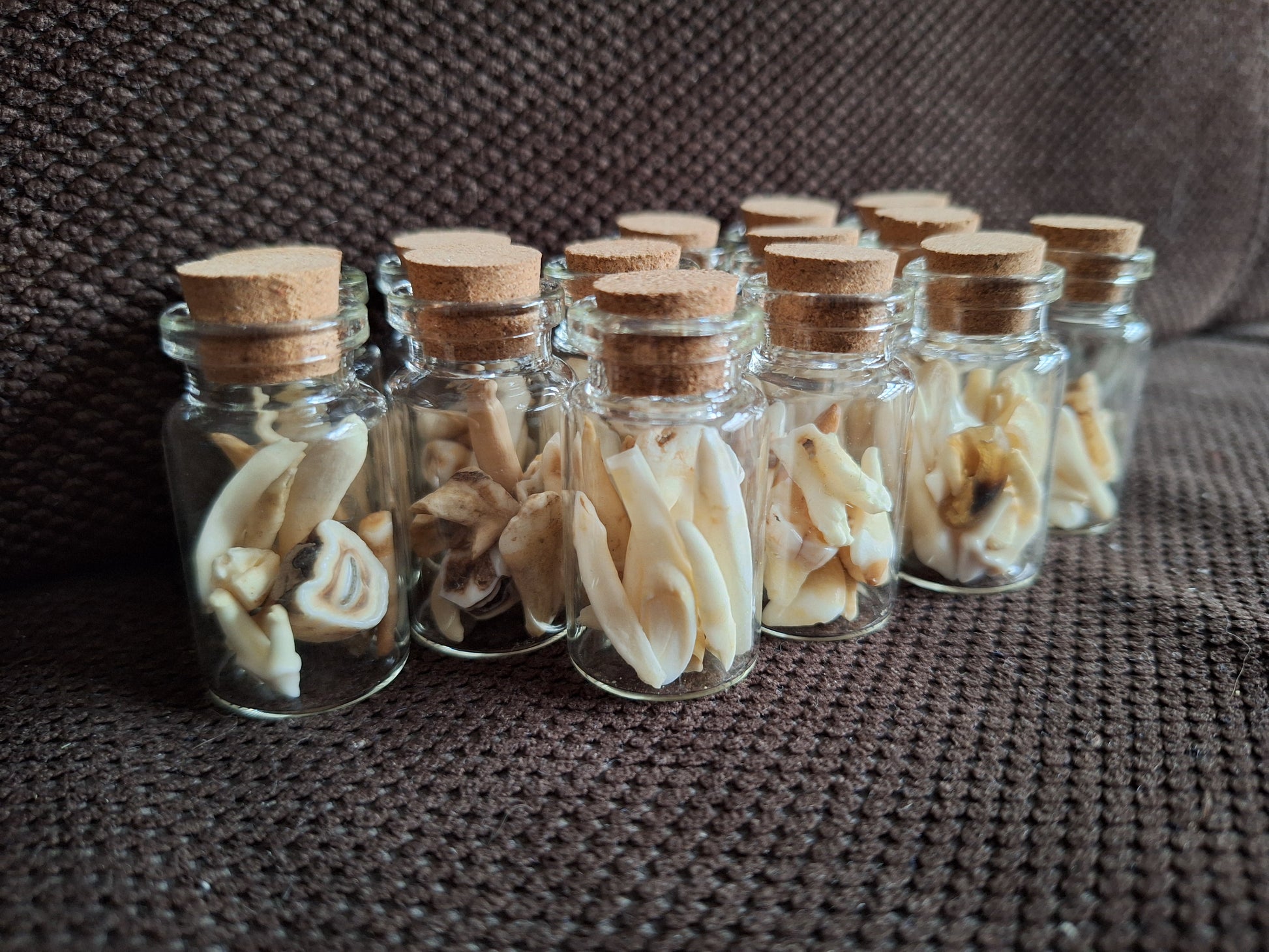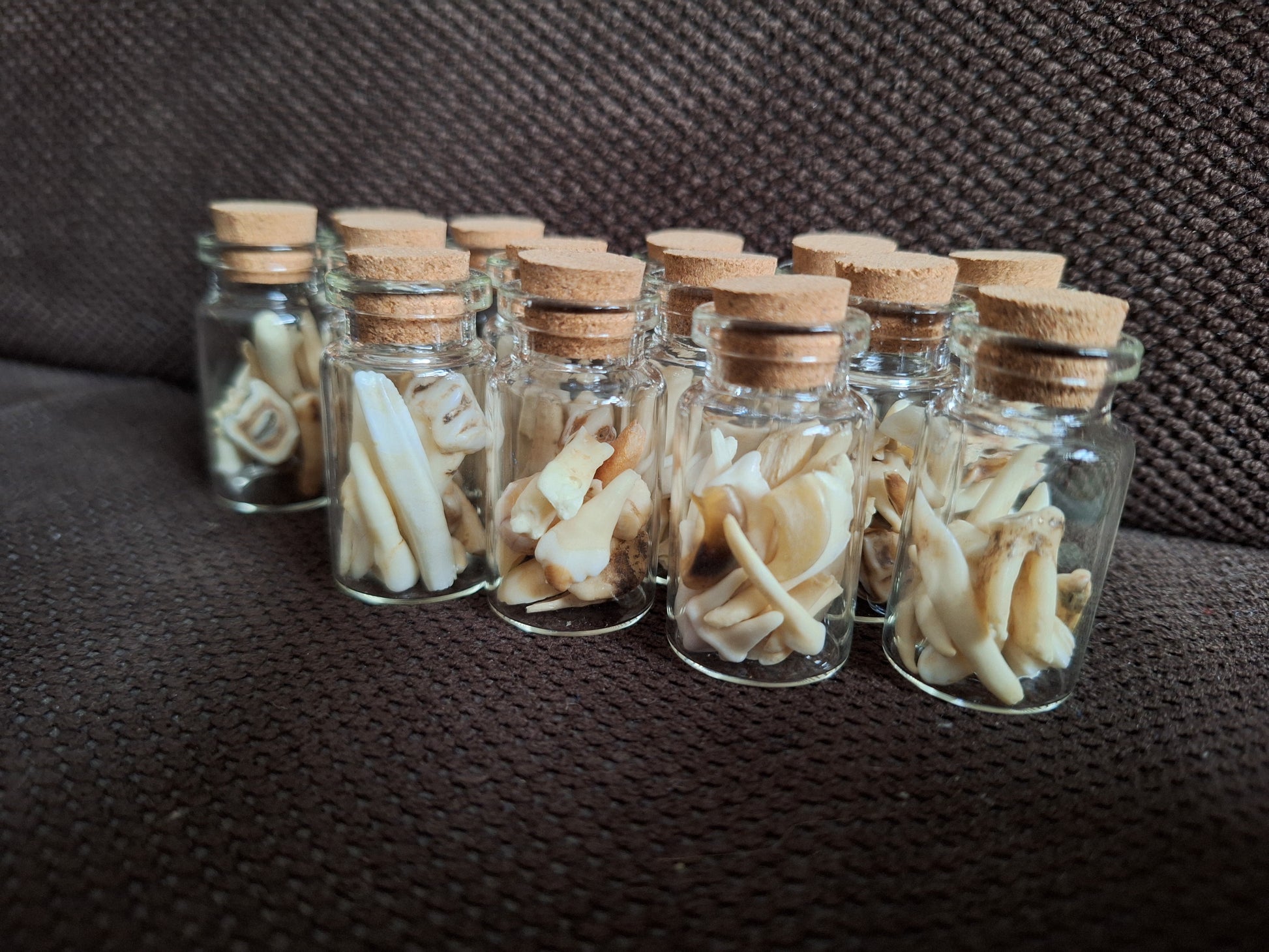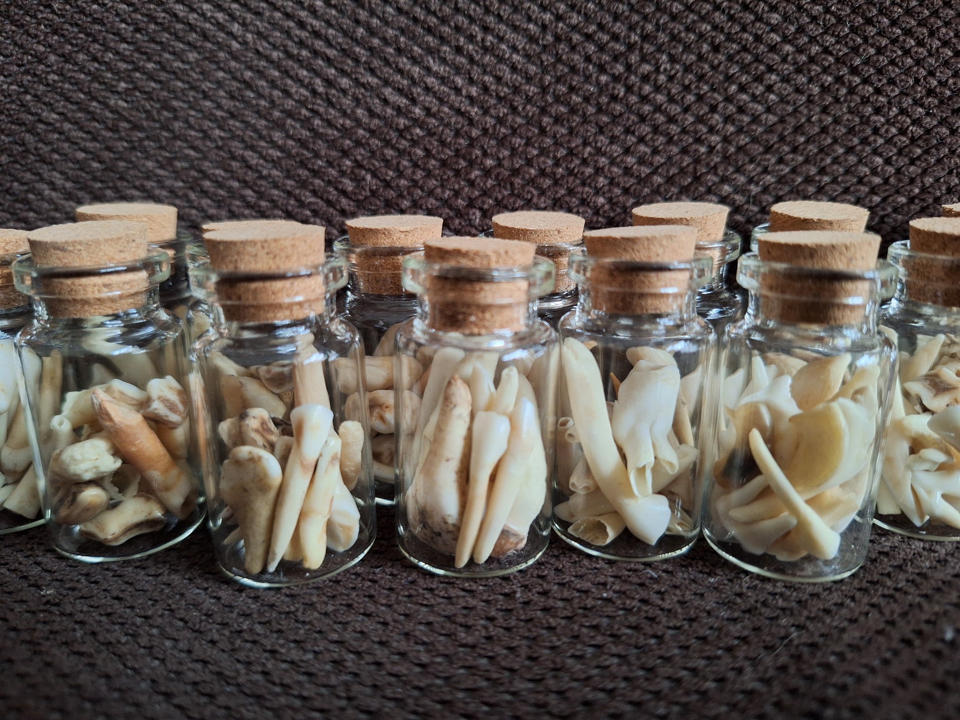 Little glass bottles with a mix of small animal teeth inside.