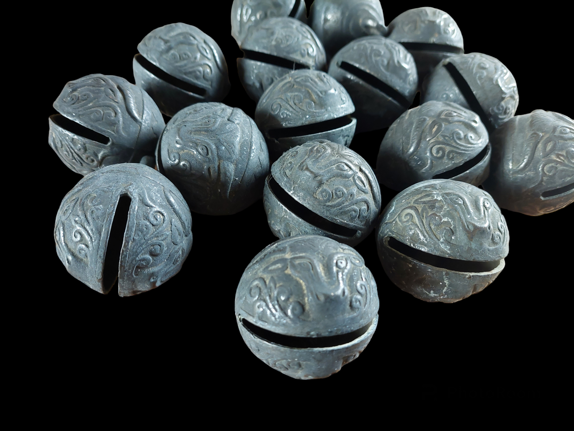 These bells have a diameter of approximately 58 millimeters (measured without the eyelet). They weigh between 130 - 140 grams each. They are made of bronze, which has been covered with a beautiful dark patina over time. Due to their age and previous usage, of course some little 'imperfections' might be there.