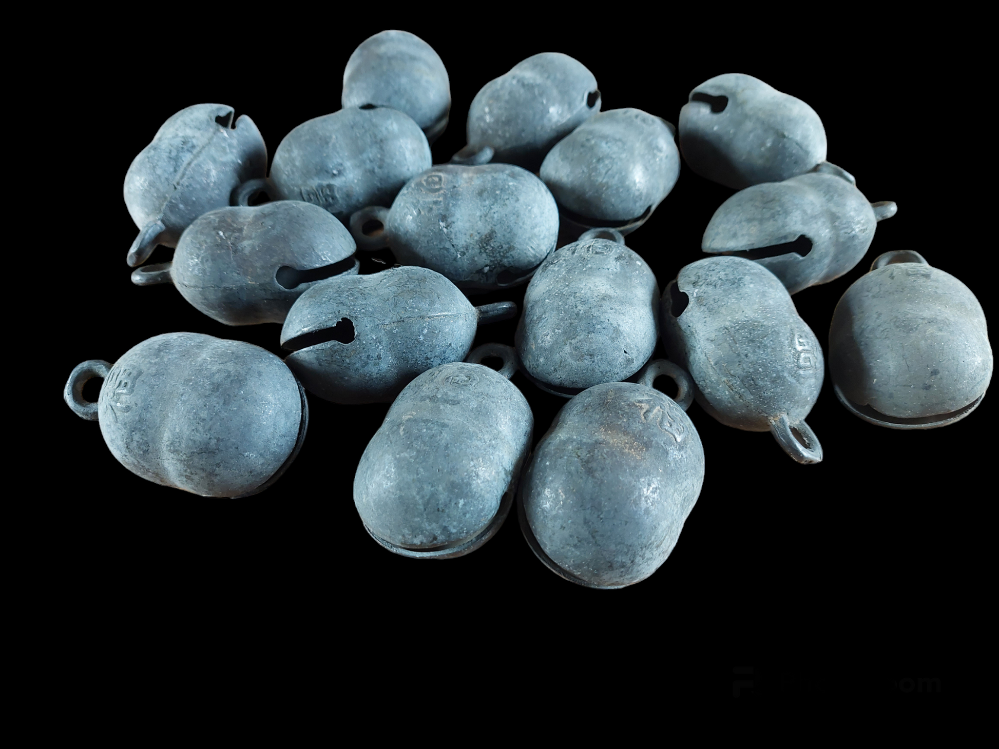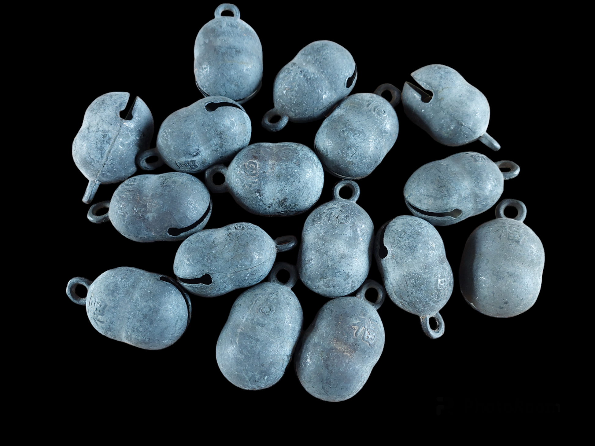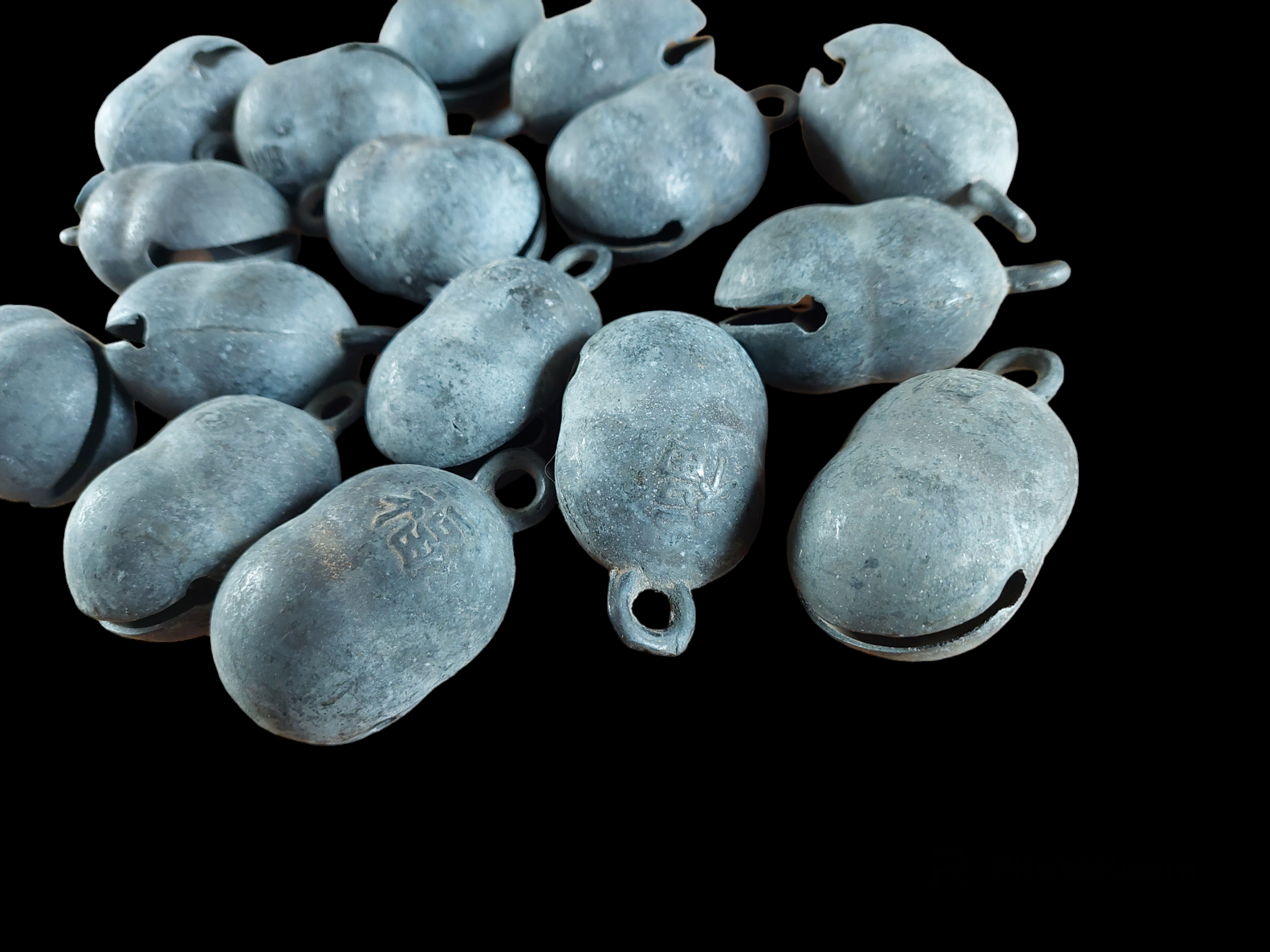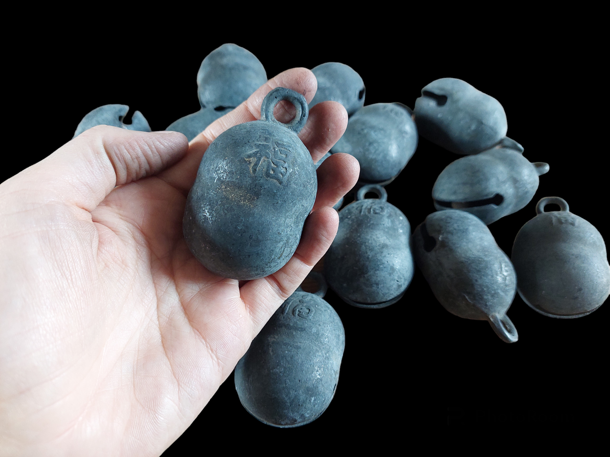 These bells are approximately 60 millimeters long (measured without the eyelet) end 48 millimeters wide.They weigh between 80 - 90 grams each. They are made of bronze, which has been covered with a beautiful dark patina over time. Due to their age and previous usage, of course some little 'imperfections' might be there.