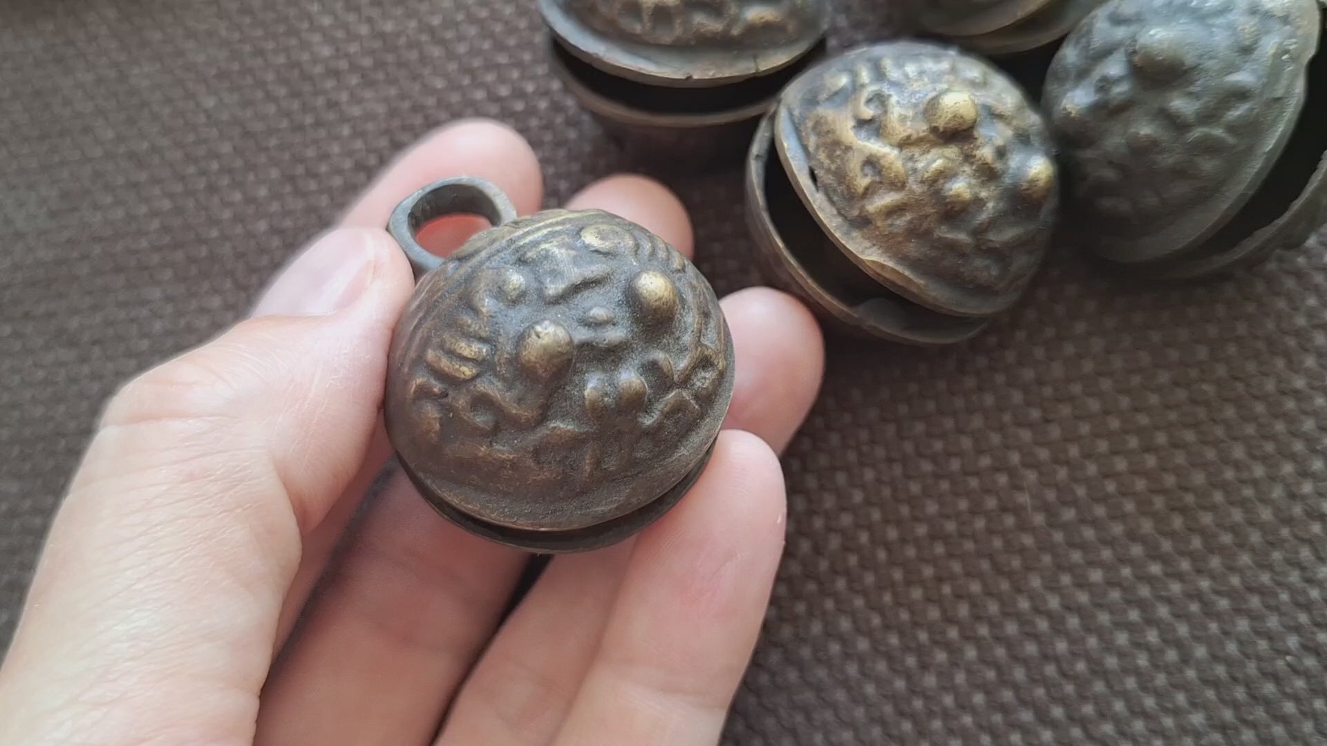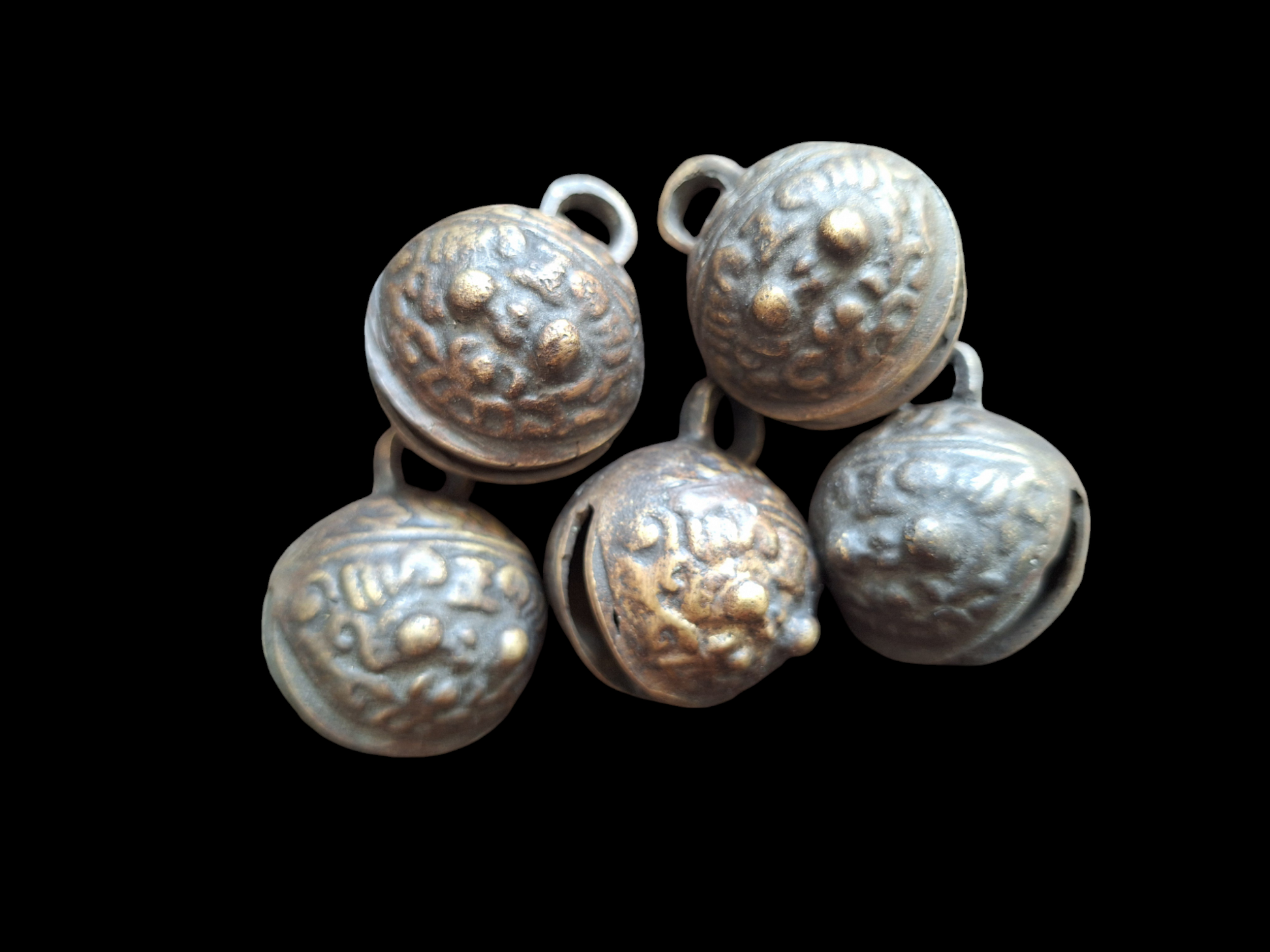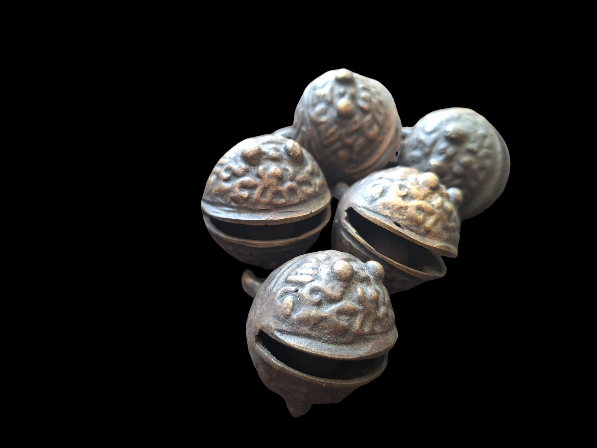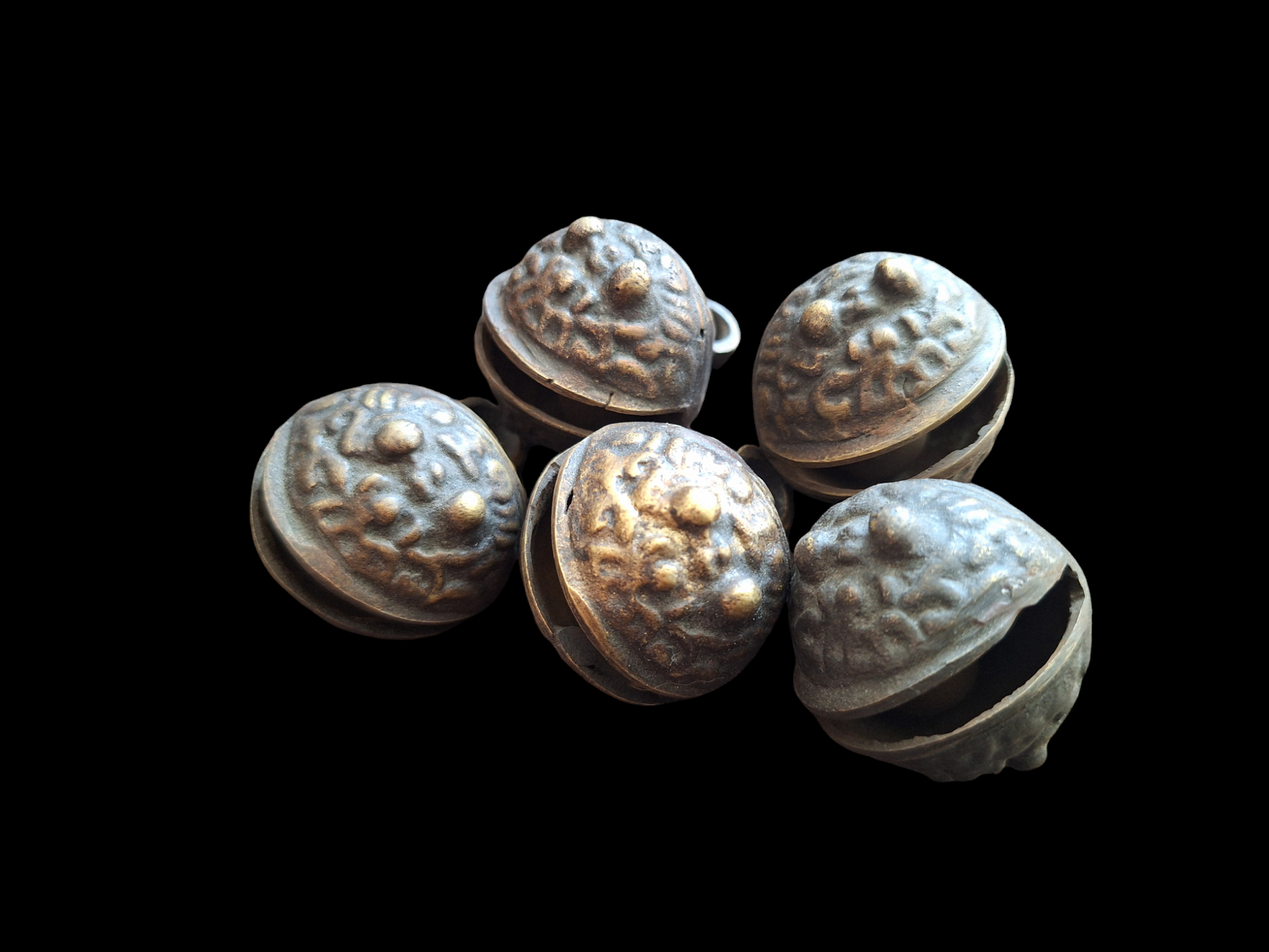 These bronze bells measure approximately 30 millimeters high (measured without eyelet) and 34 millimeters wide. They have quite some years of age to them already; these were made in the early 20th century. Over time they have gotten a beautiful dark aged patina.