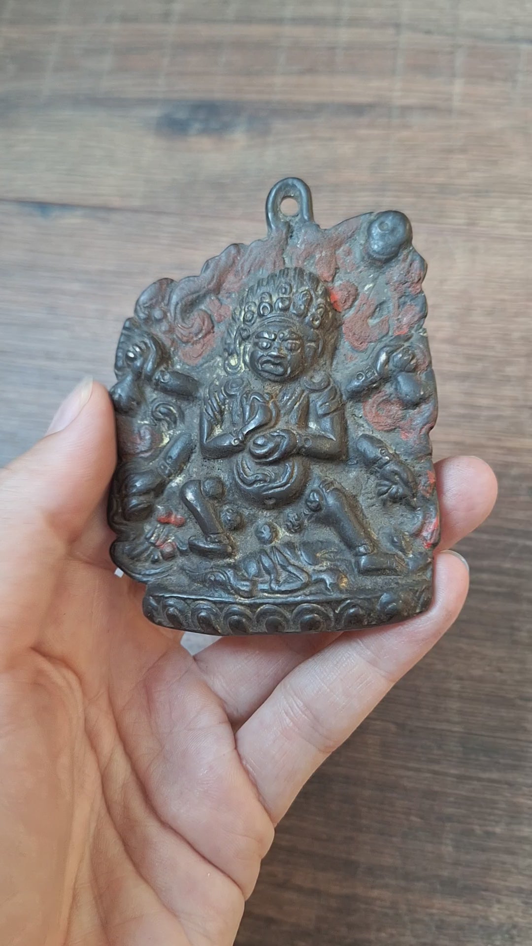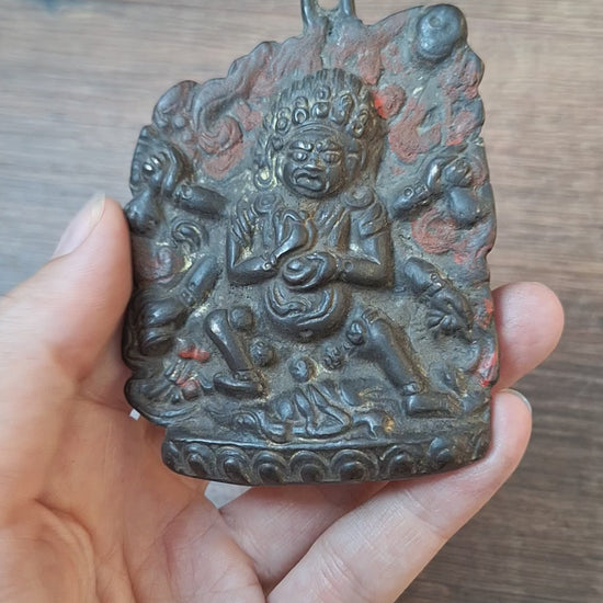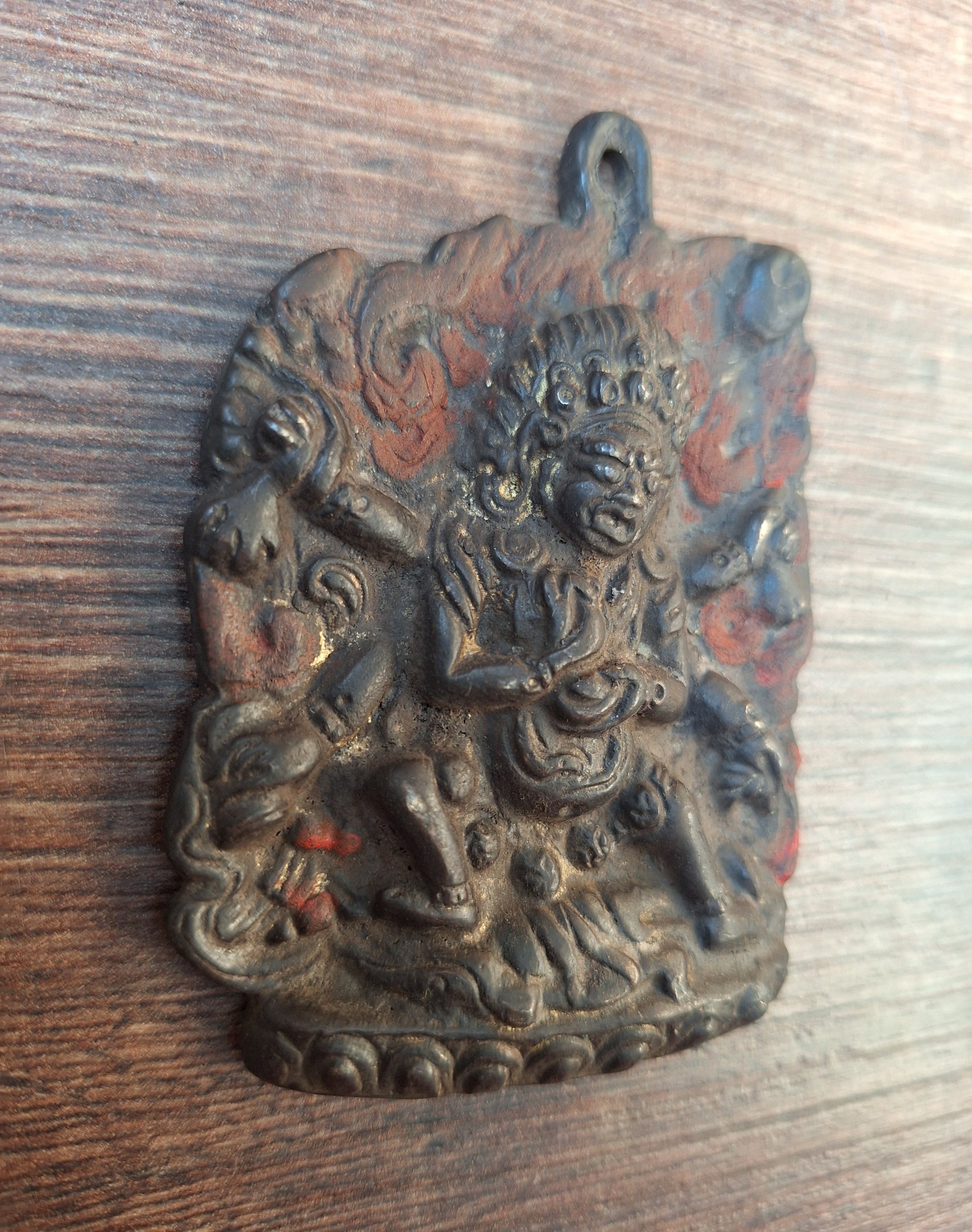 Beautiful vintage pendant with the depiction of a four-armed Mahakala. The four-armed appearance of Mahakala is one that is very popular in Nepal, where this pendant has been made.