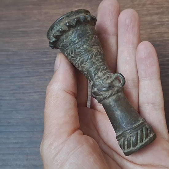 This chillum comes from Nepal and is an antique one. It has been made of bronze, using the 'lost wax' casting method. The bronze has gained a beautiful dark color and aged patina over time.