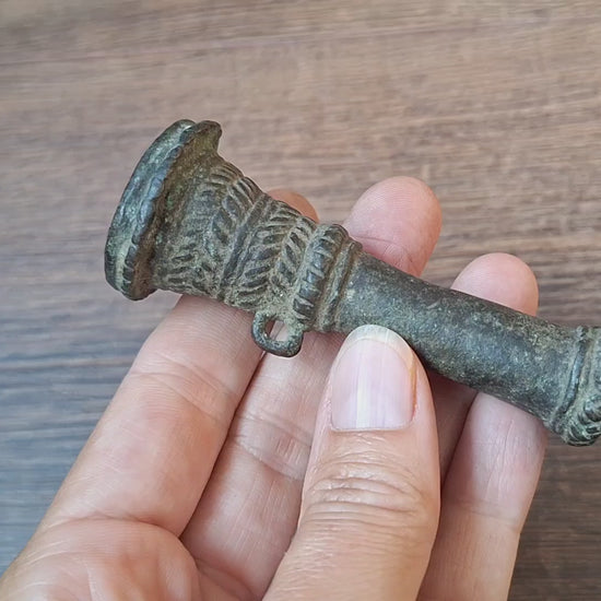 This chillum comes from Nepal and is an antique one. It has been made of bronze, using the 'lost wax' casting method. The bronze has gained a beautiful dark color and aged patina over time.
