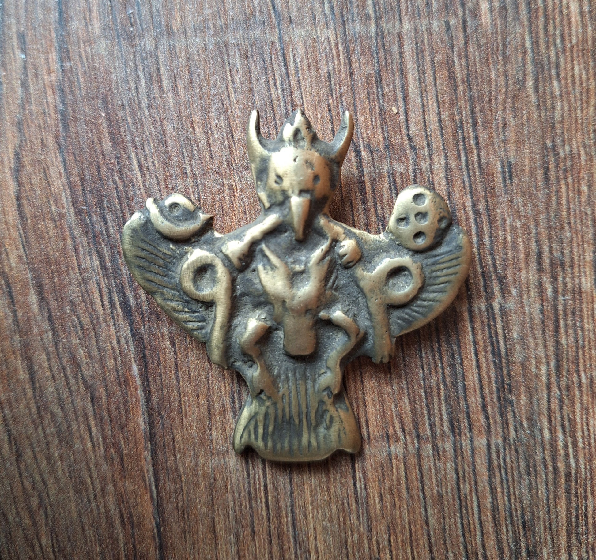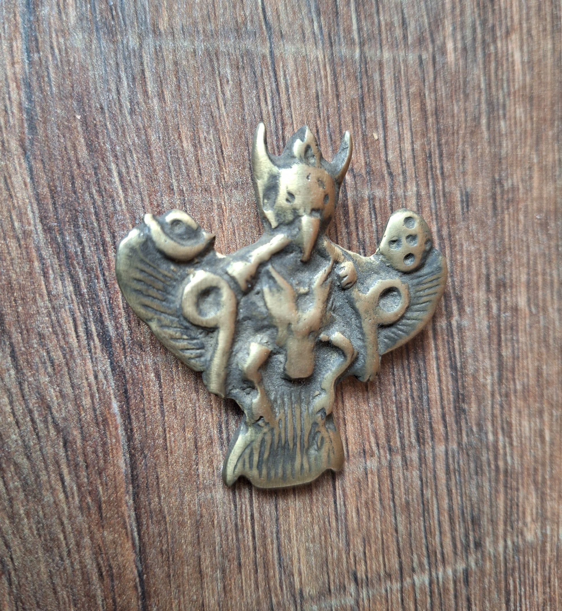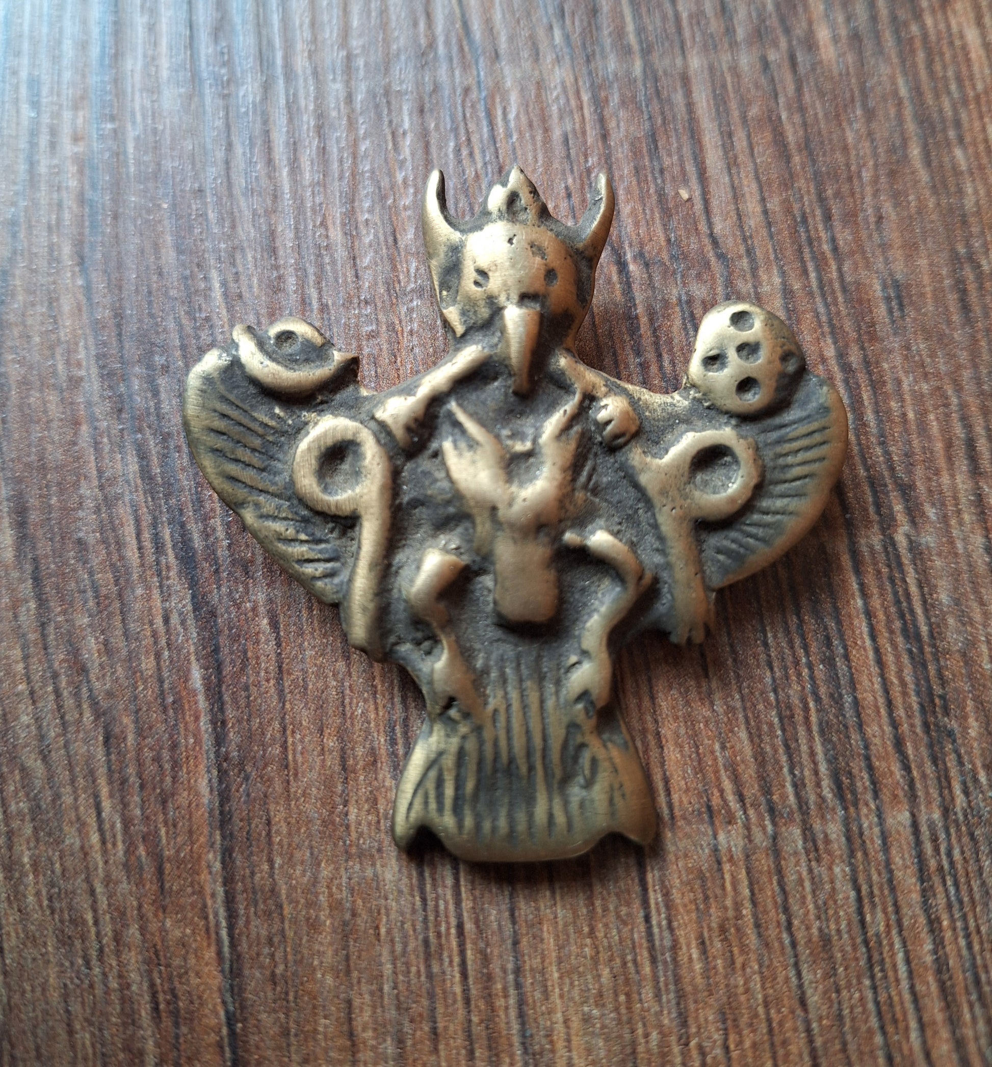 This Garuda pendant comes from Nepal. Size is approximately 55 millimeters high and 52 millimeters wide. It weighs 27 grams.