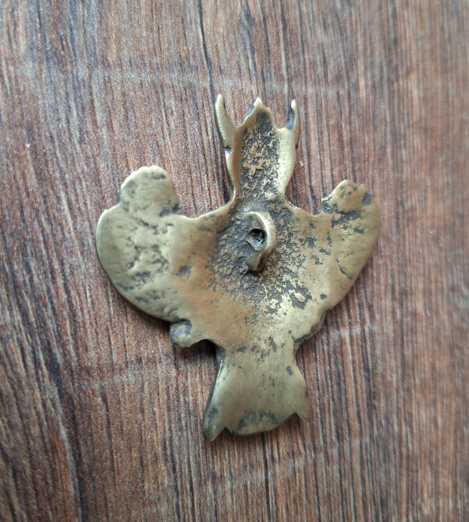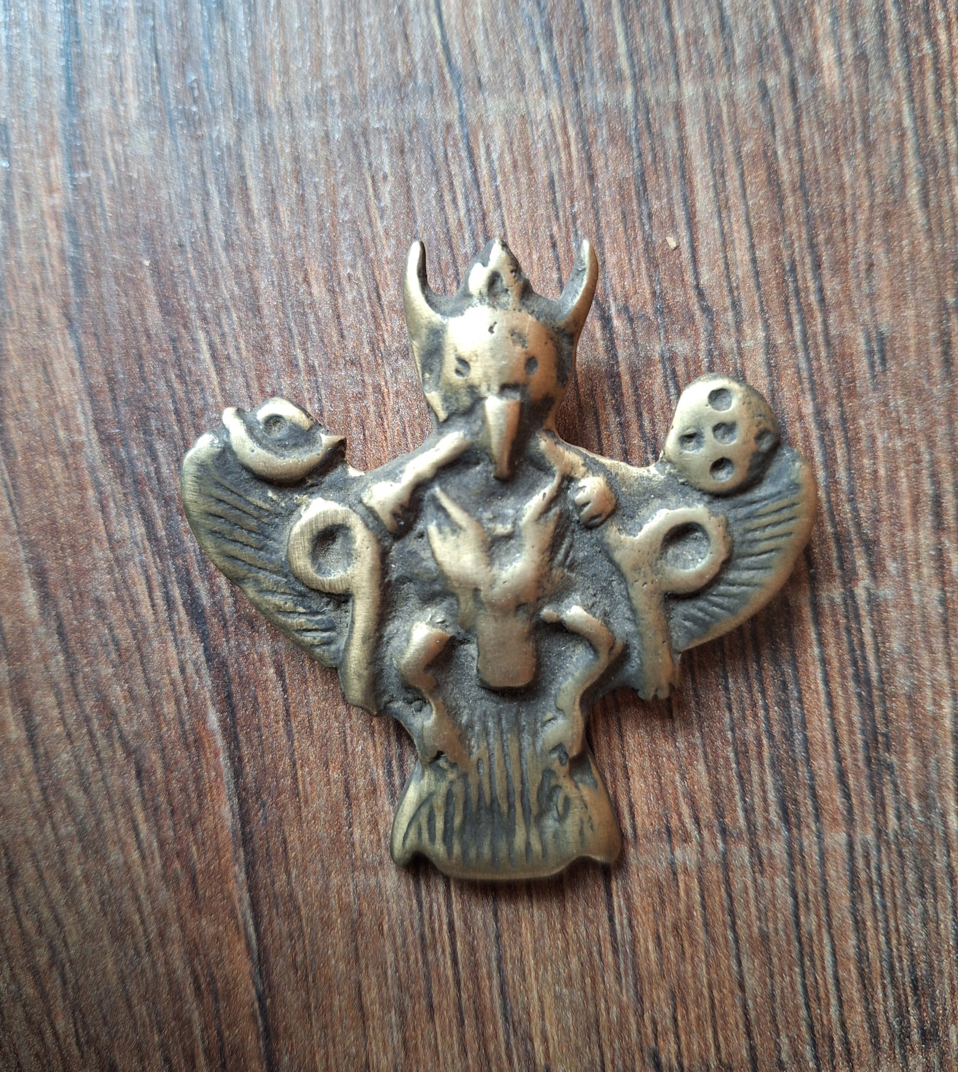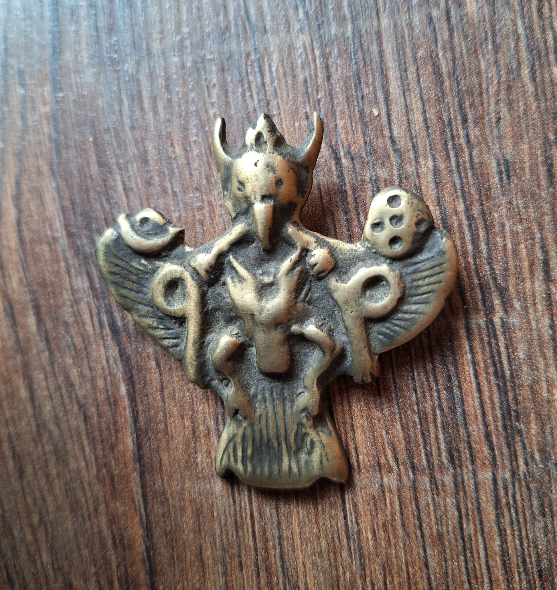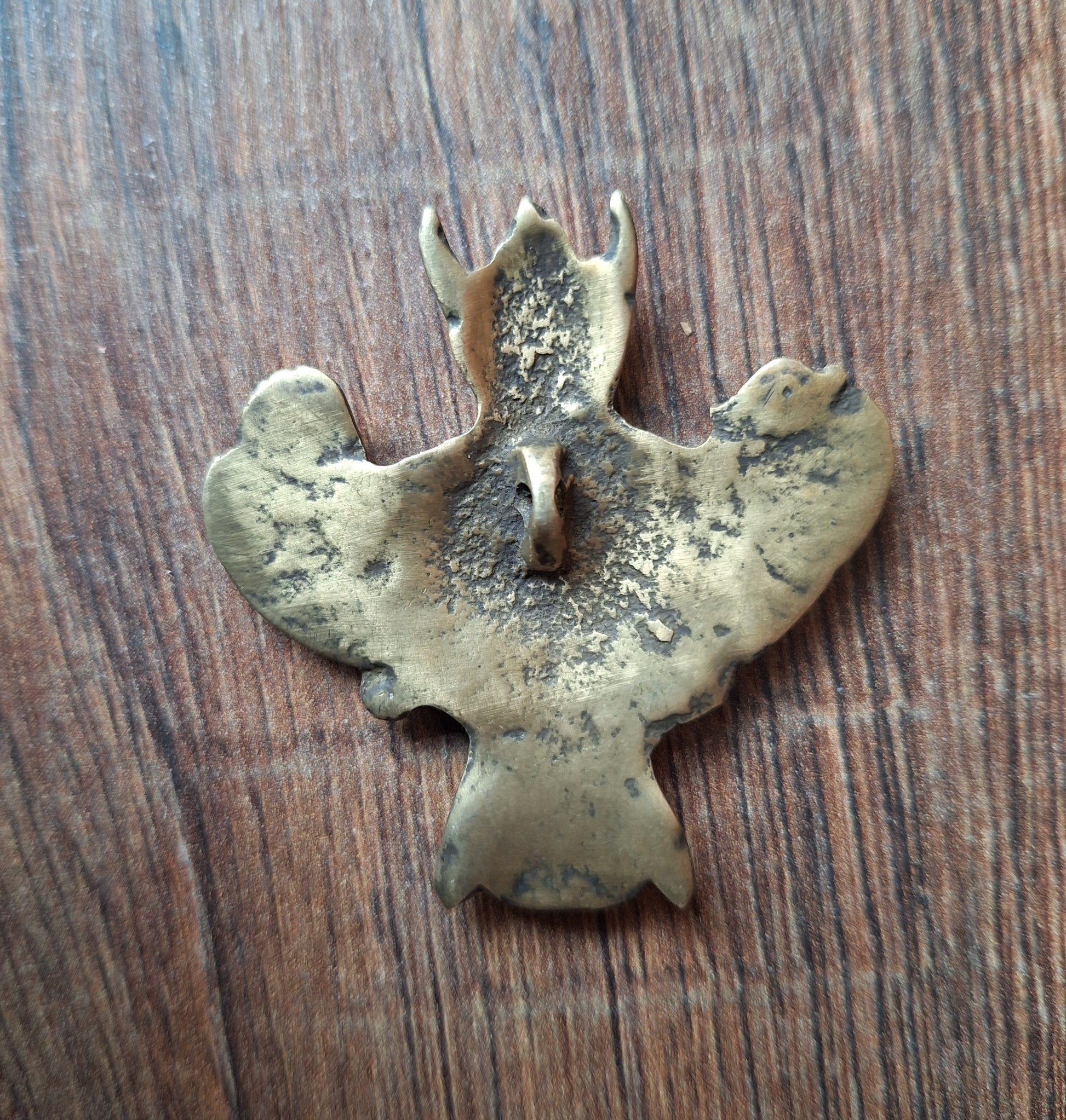 This Garuda pendant comes from Nepal. Size is approximately 55 millimeters high and 52 millimeters wide. It weighs 27 grams.
