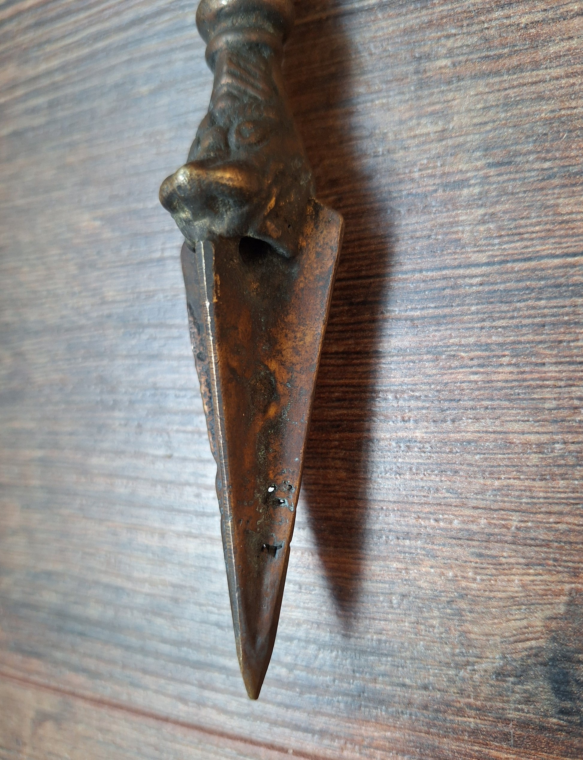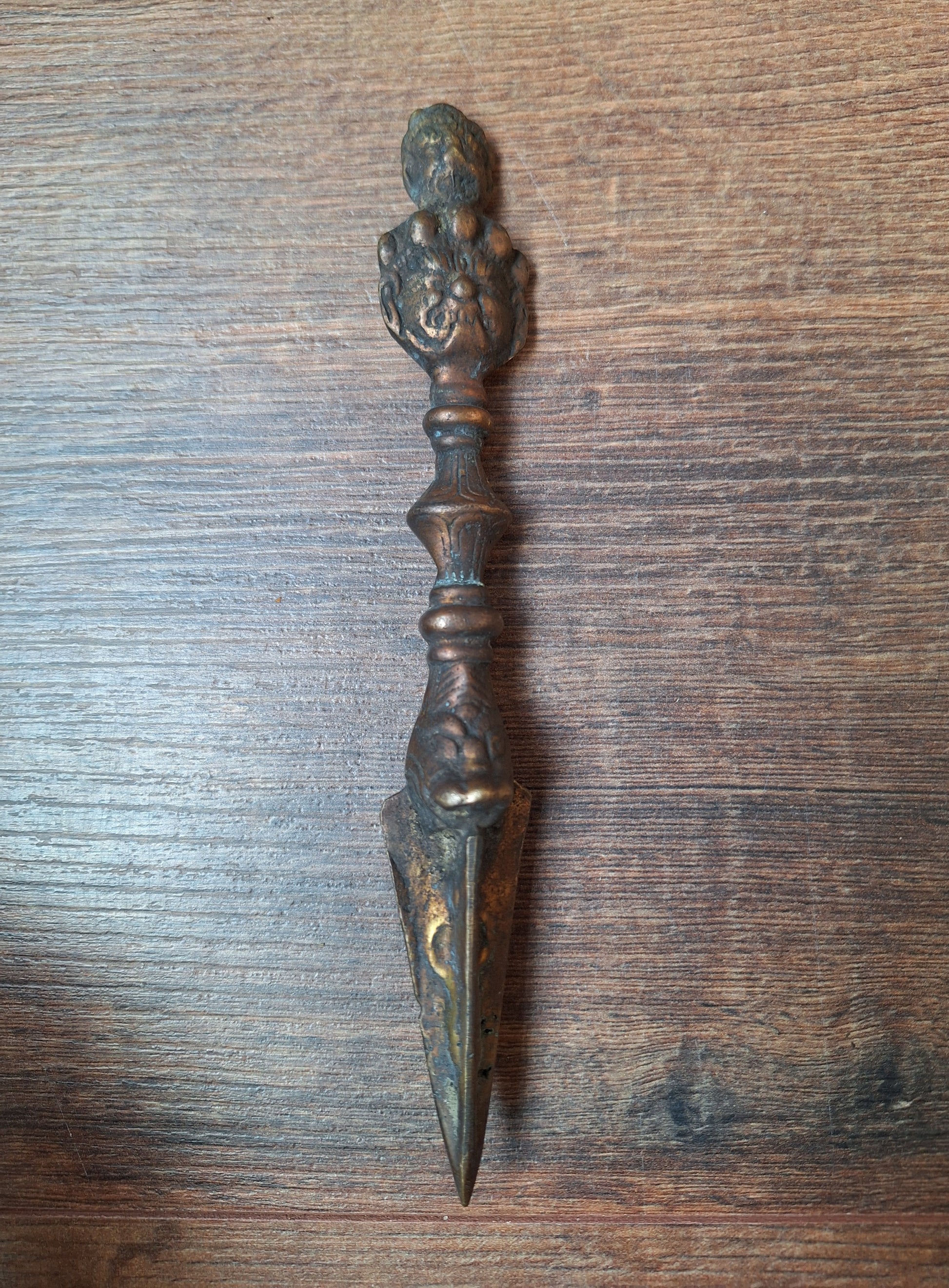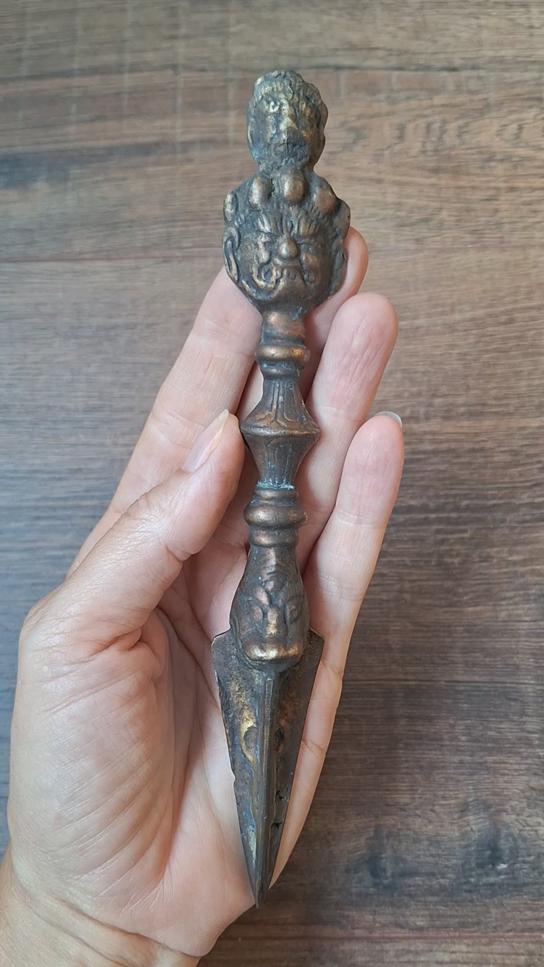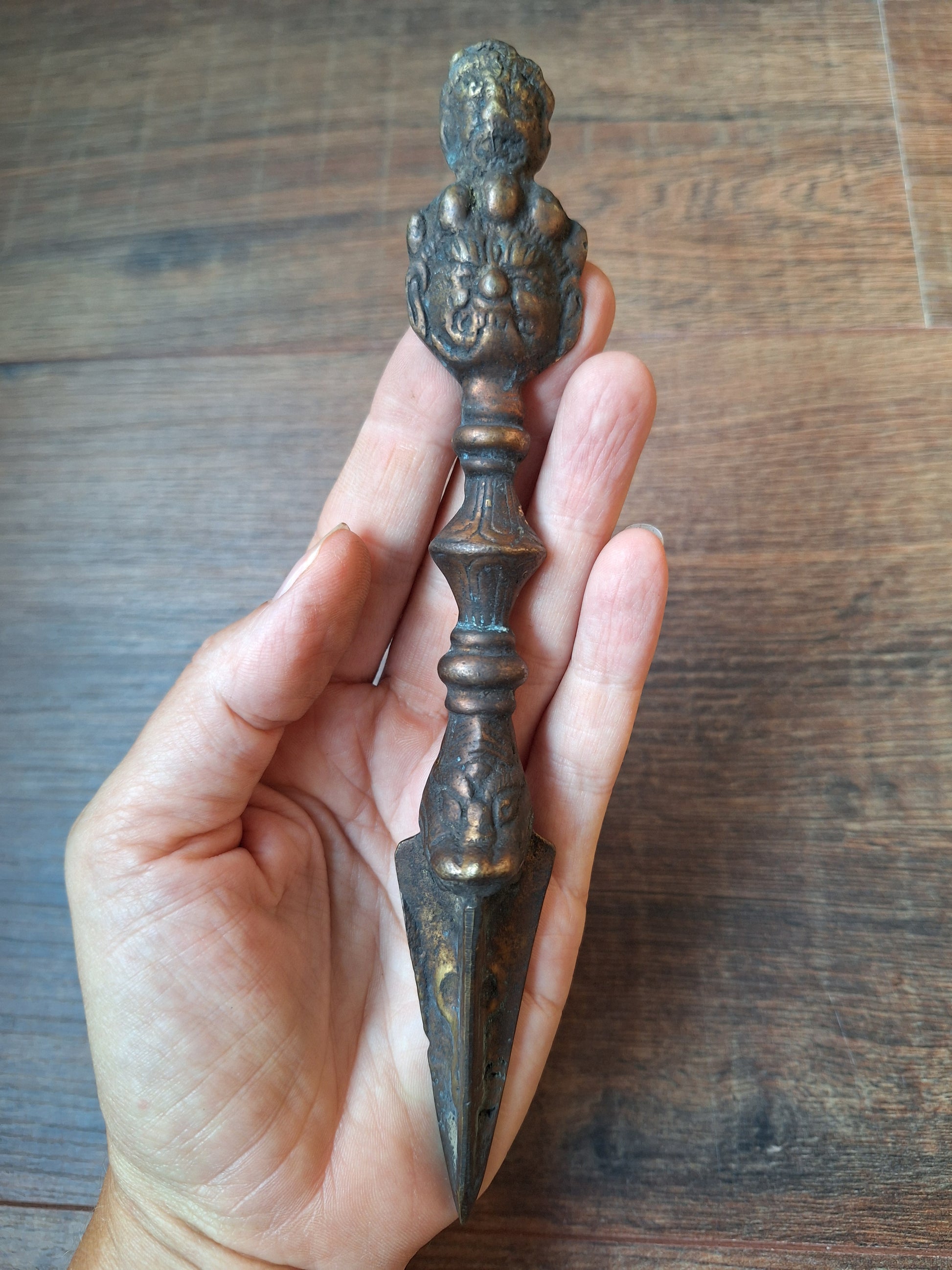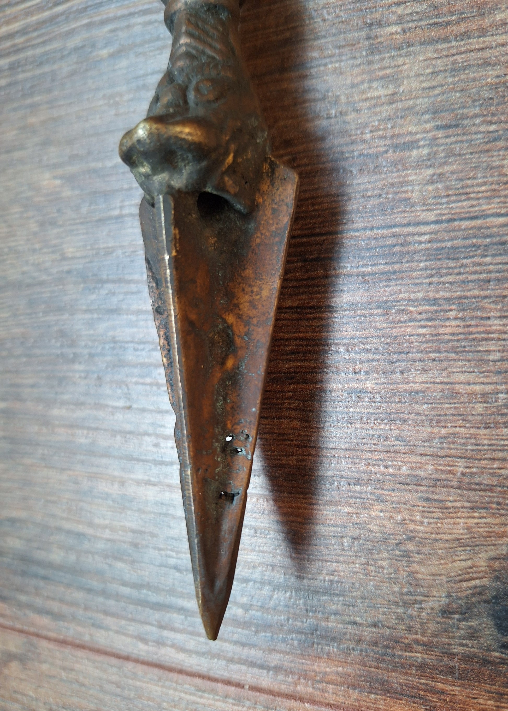 Antique bronze phurba from Nepal. This phurba is a very old one already. As can be seen on the pictures, it clearly shows the signs of its age and previous usage. Over the years, a mixed layer of debris, patina and oxidation has built up. The oxidation also caused some corrosion to the blade, as can be seen on the pictures.