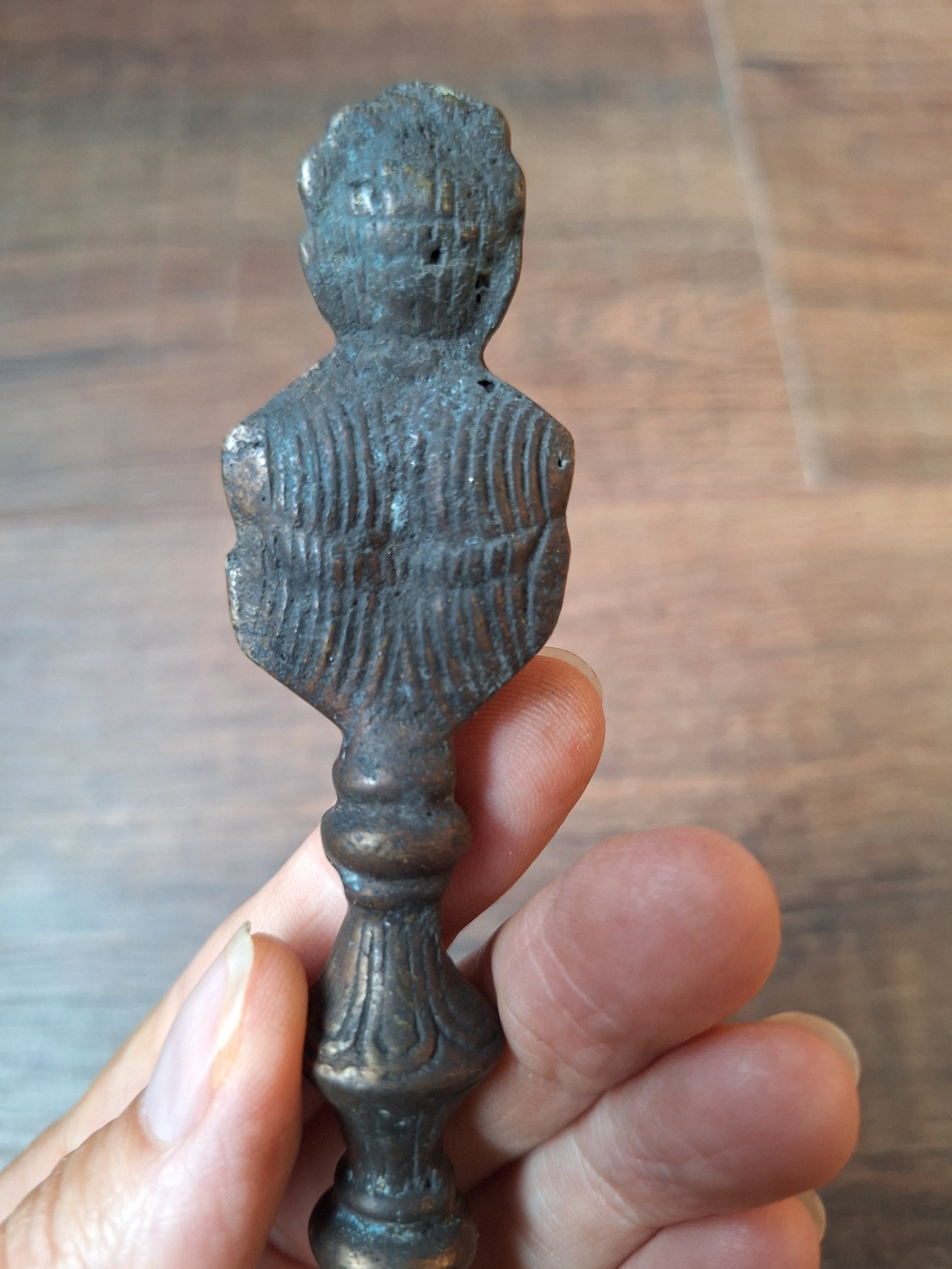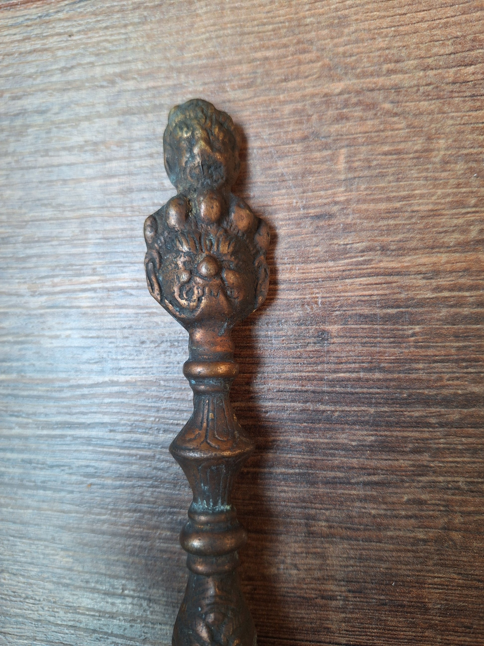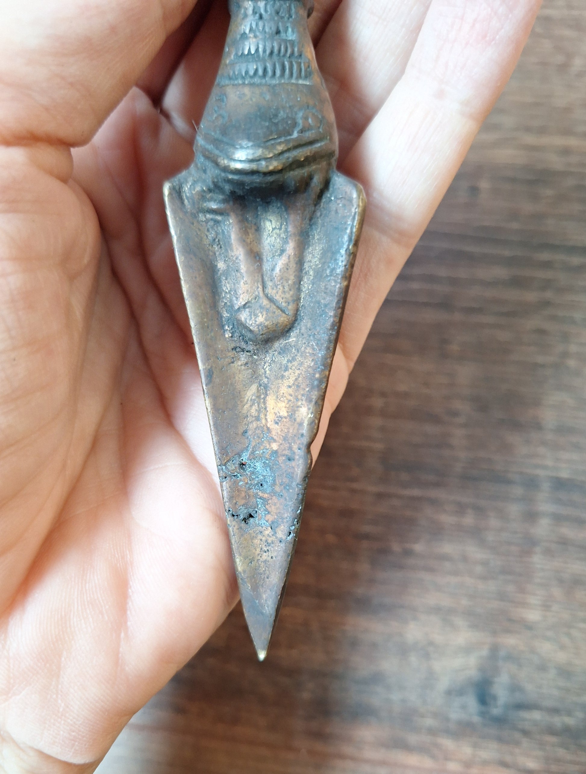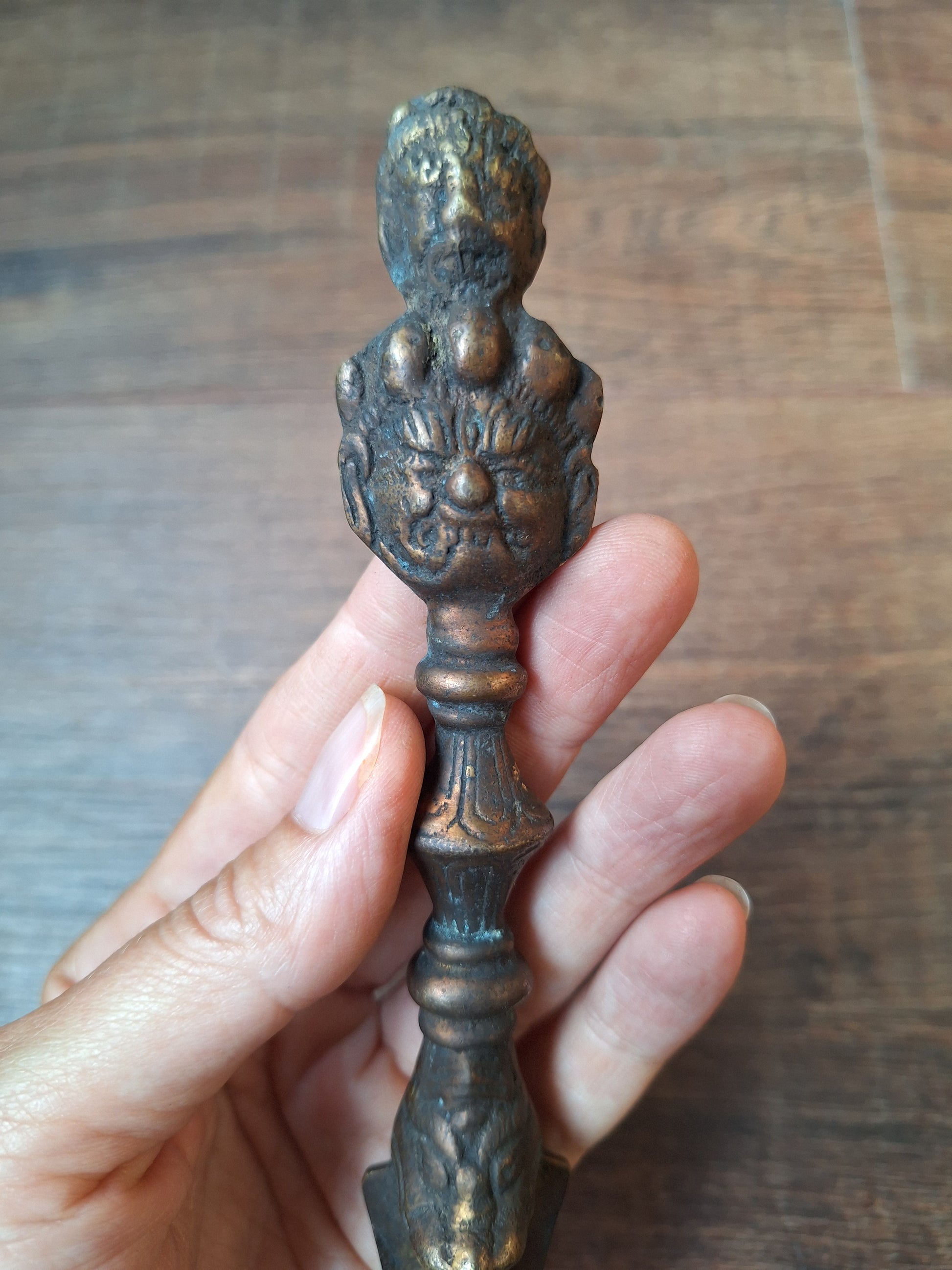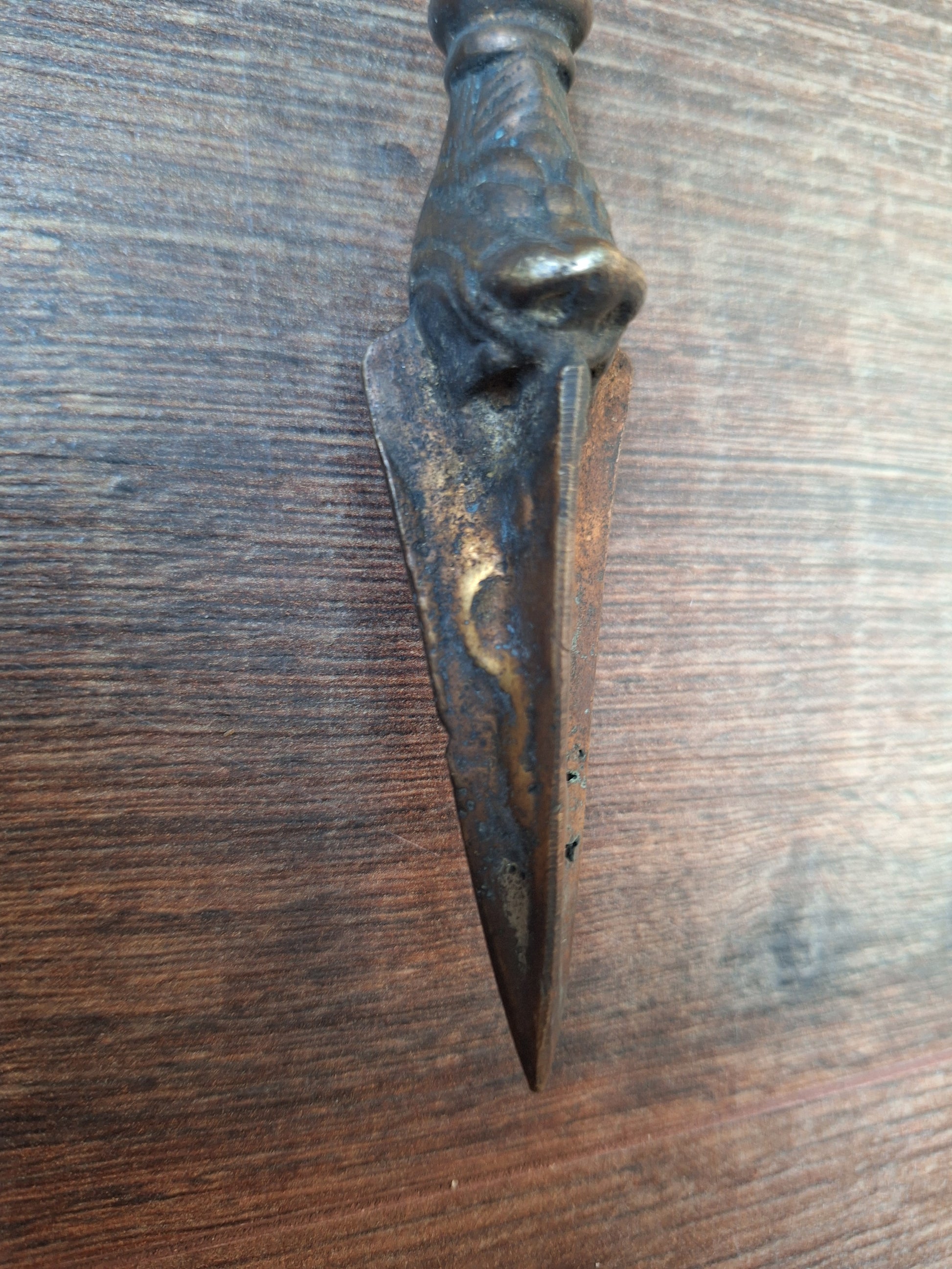 Antique bronze phurba from Nepal. This phurba is a very old one already. As can be seen on the pictures, it clearly shows the signs of its age and previous usage. Over the years, a mixed layer of debris, patina and oxidation has built up. The oxidation also caused some corrosion to the blade, as can be seen on the pictures.