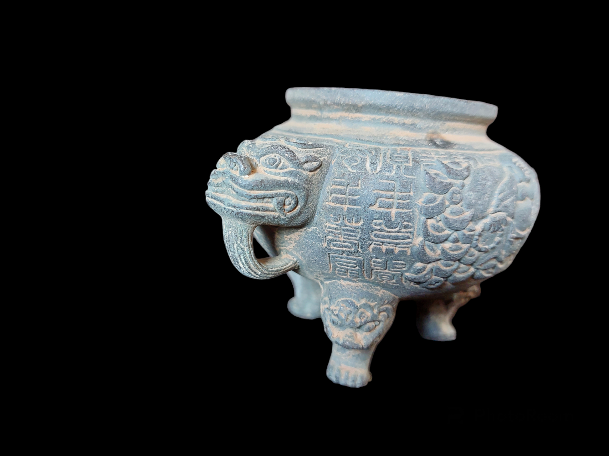Sizes: the outer diameter, measured including the Foo Dog heads, is approximately 11 centimeters. Diameter of the hole, measured at the top, is approximately 4,7 centimeters. Height is approximately 8 centimeters.