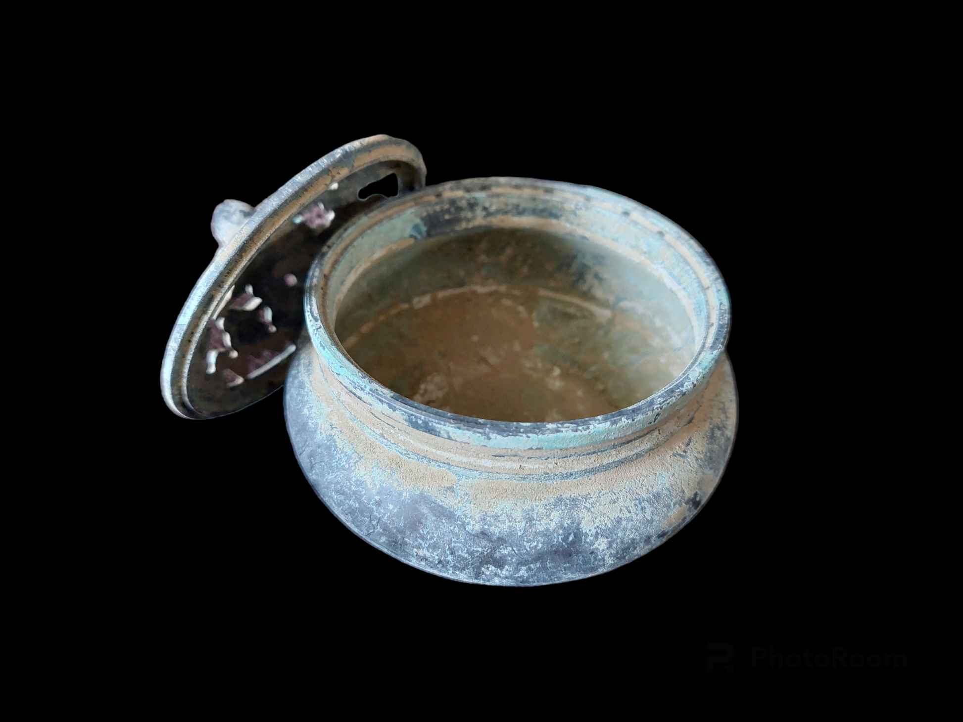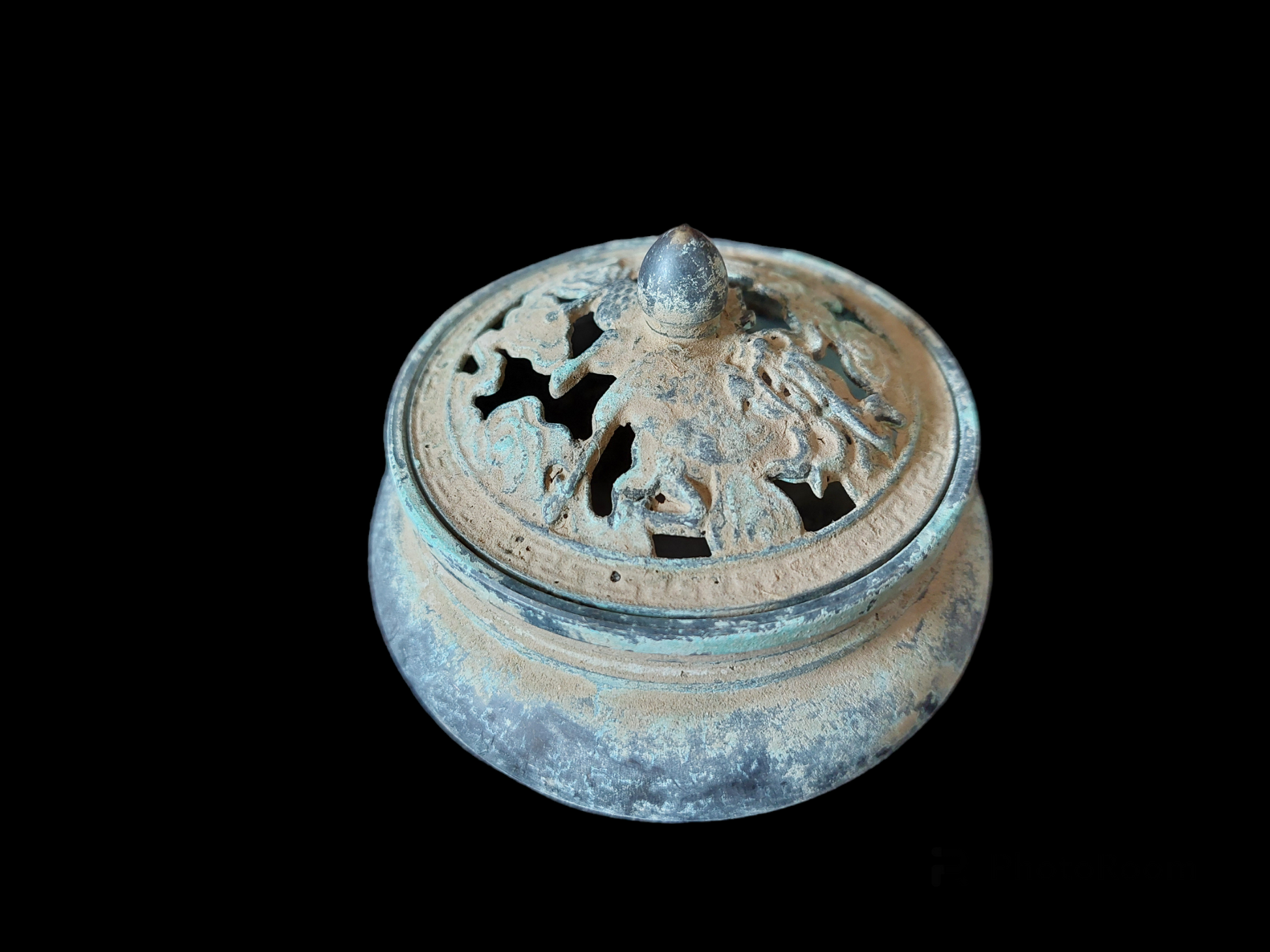 This incense burner is an antique one, made from bronze which has a beautiful patina due to its age. It is in very good condition and weighs 332 grams.