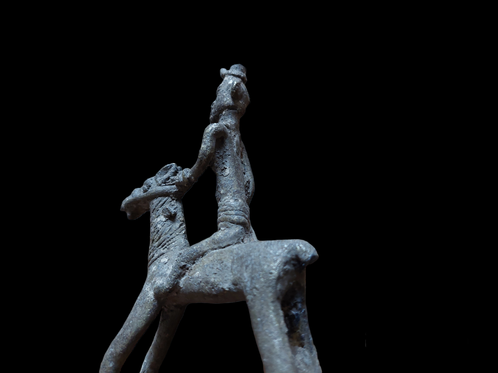This figurine depicts either a soldier or warrior on horseback, as can be seen by the right hand resting on the sword and the military style of the hat.
