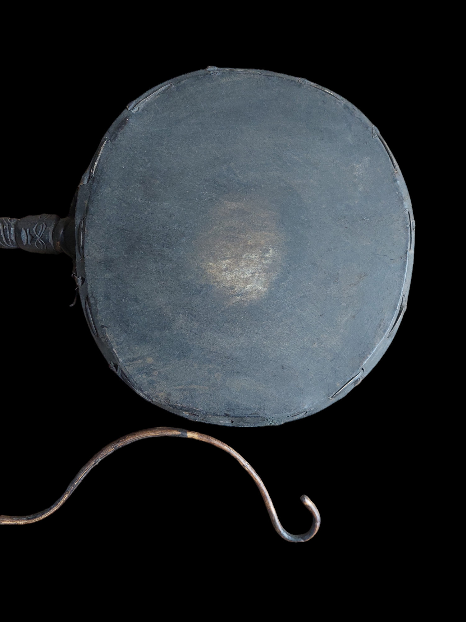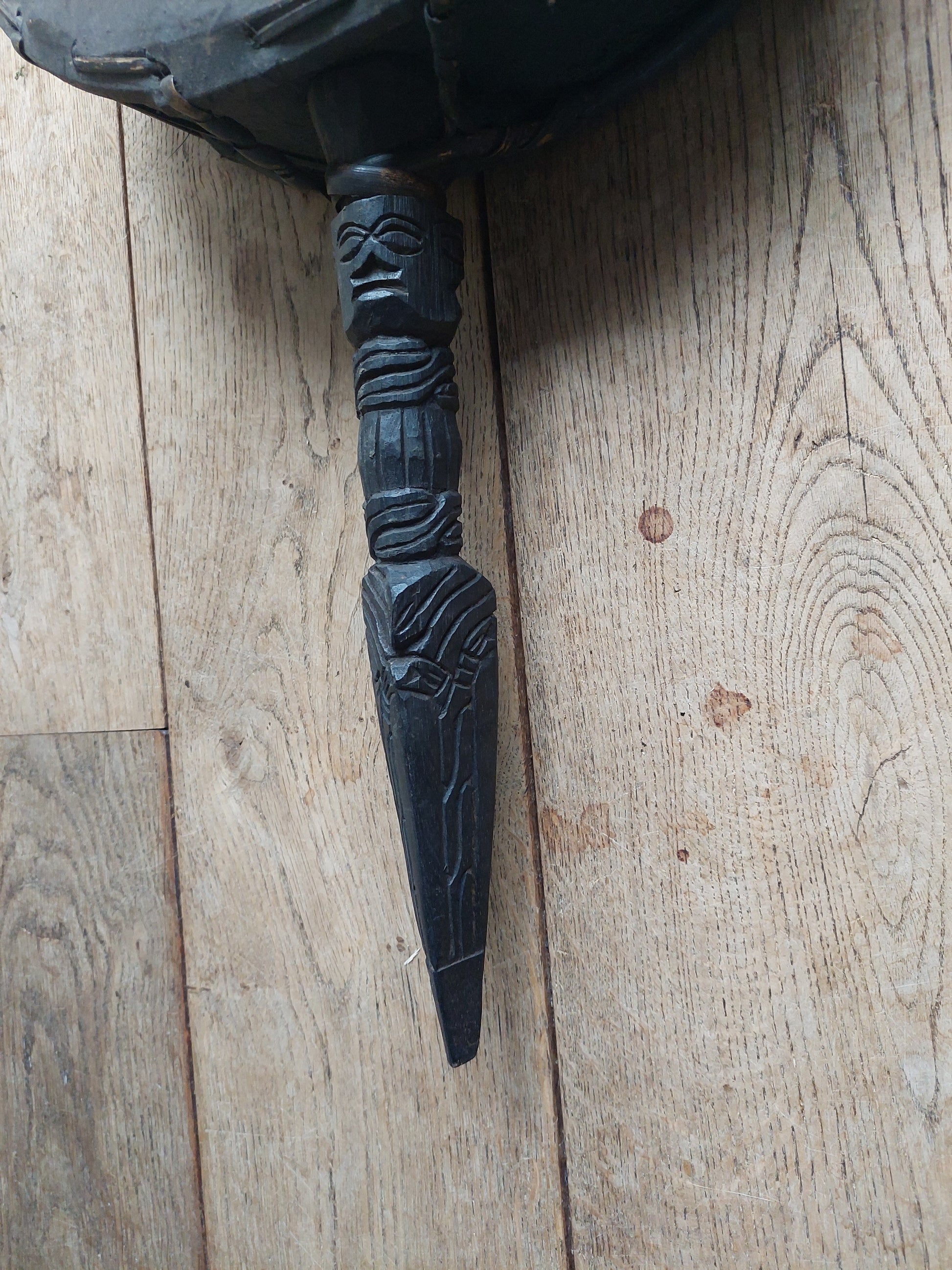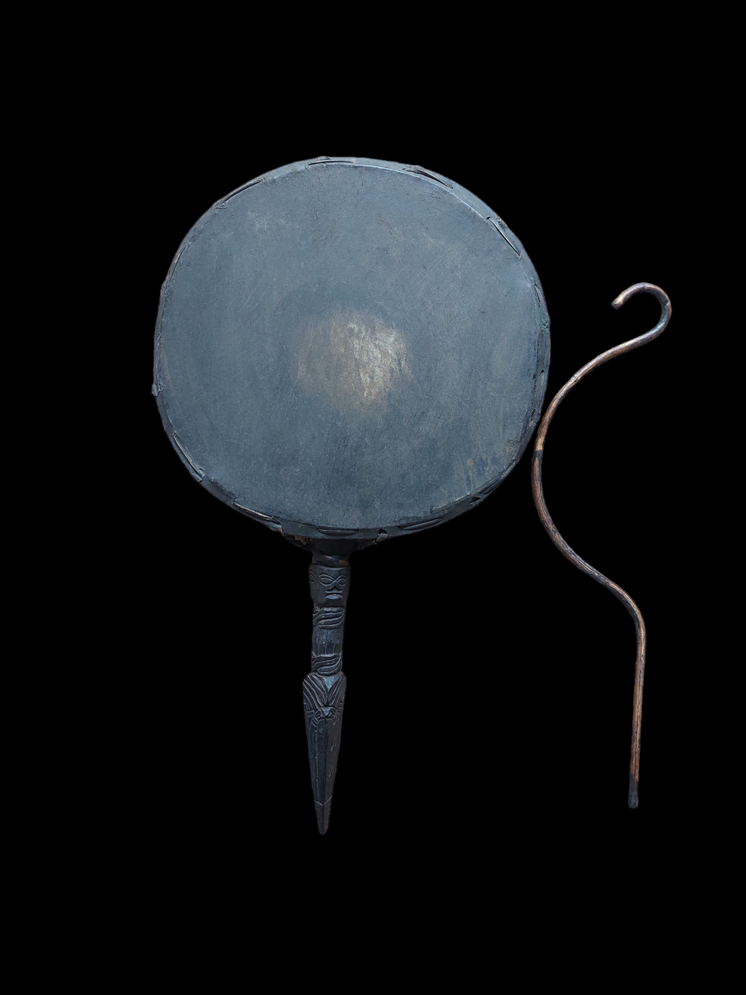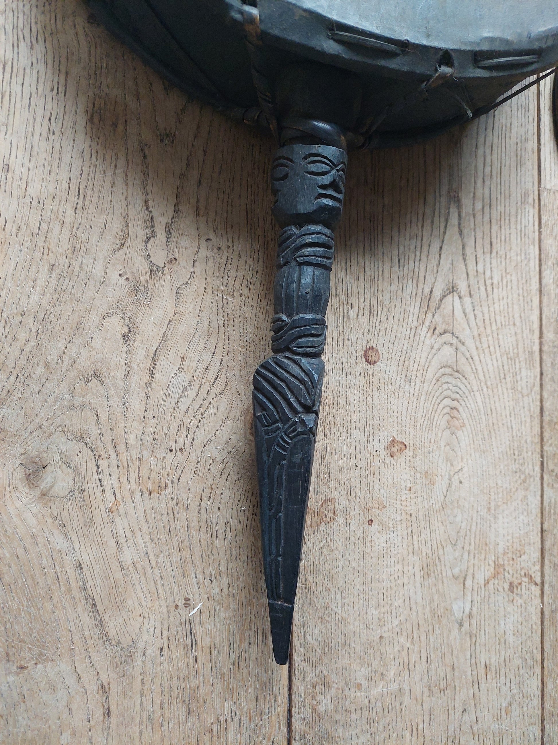 Most dhyangro drums have a typical wooden handle in the style of a phurba/kila; the three-side ritual dagger, commonly known in diverse spiritual traditions all over Asia. The phurba-shaped handle from this drum here in our shop is handcarved with depictions of the three-sided face of Vajrakilaya at the pommel, a combination of dorje and shrivatsa (endless knot) symbols in the middle and naga's on the blade.