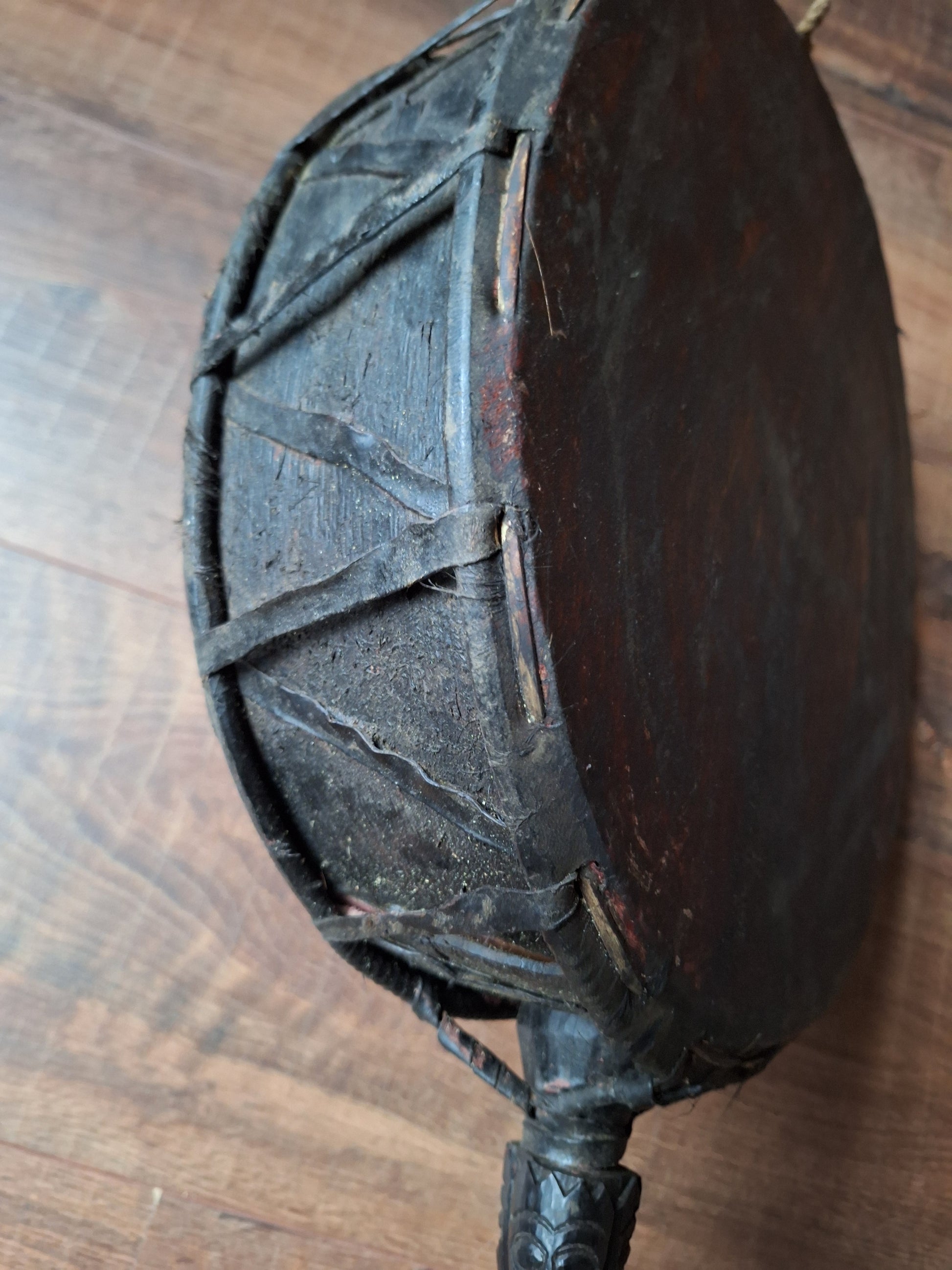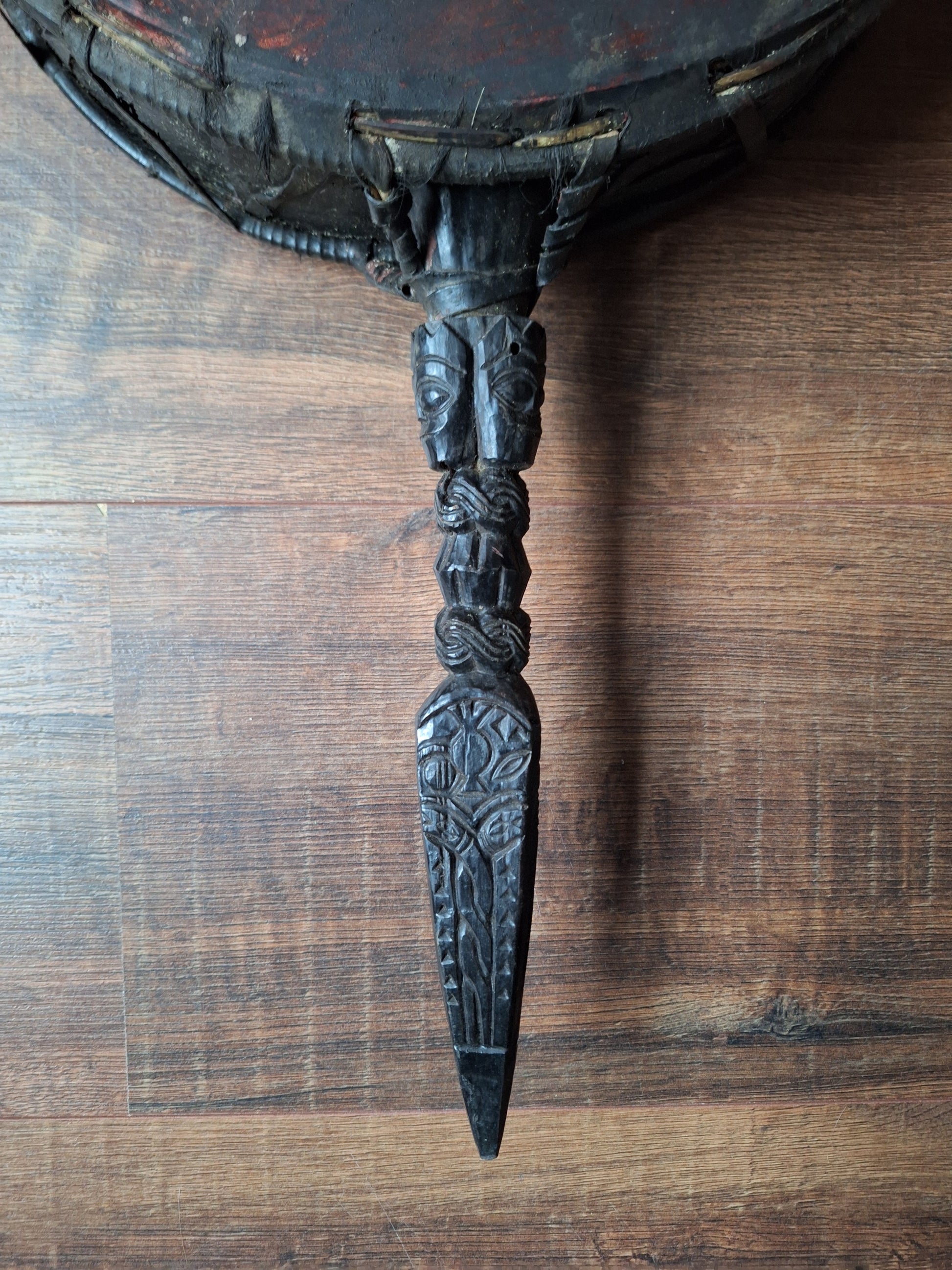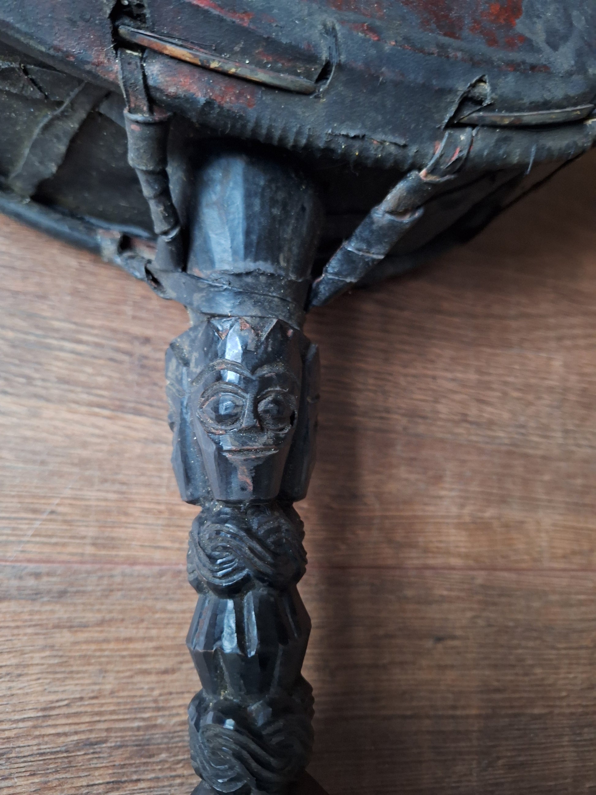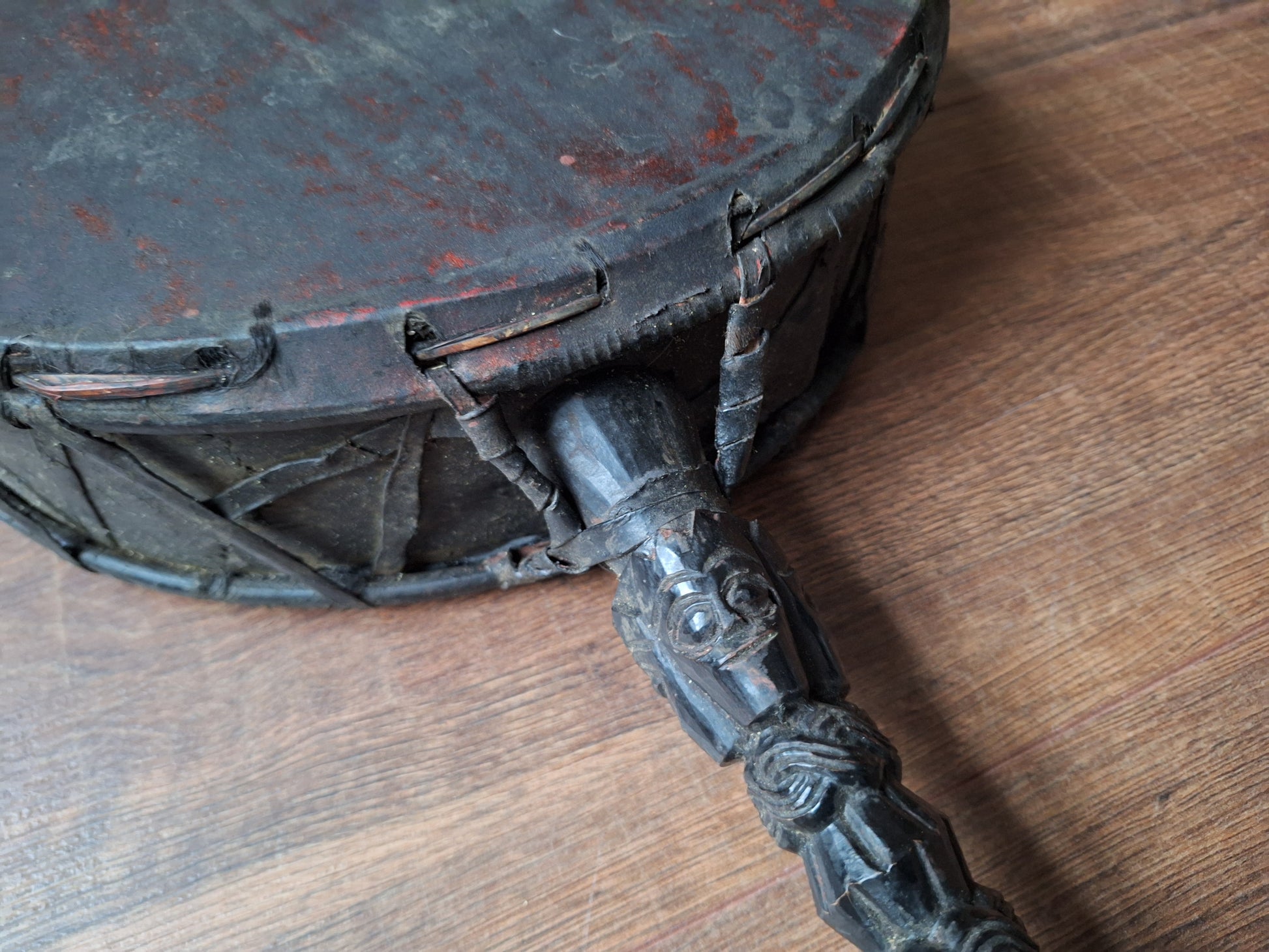 Most dhyangro drums have a typical wooden handle in the style of a phurba/kila; the three-side ritual dagger, commonly known in diverse spiritual traditions all over Asia. The phurba-shaped handle from this drum here in our shop is handcarved with depictions of the three-sided face of Vajrakilaya at the pommel, a combination of dorje and shrivatsa (endless knot) symbols in the middle and naga's, sun & moon and kalasha (ritual water vessel) symbols on the blade, which is held by the mythical watermonster Makara.