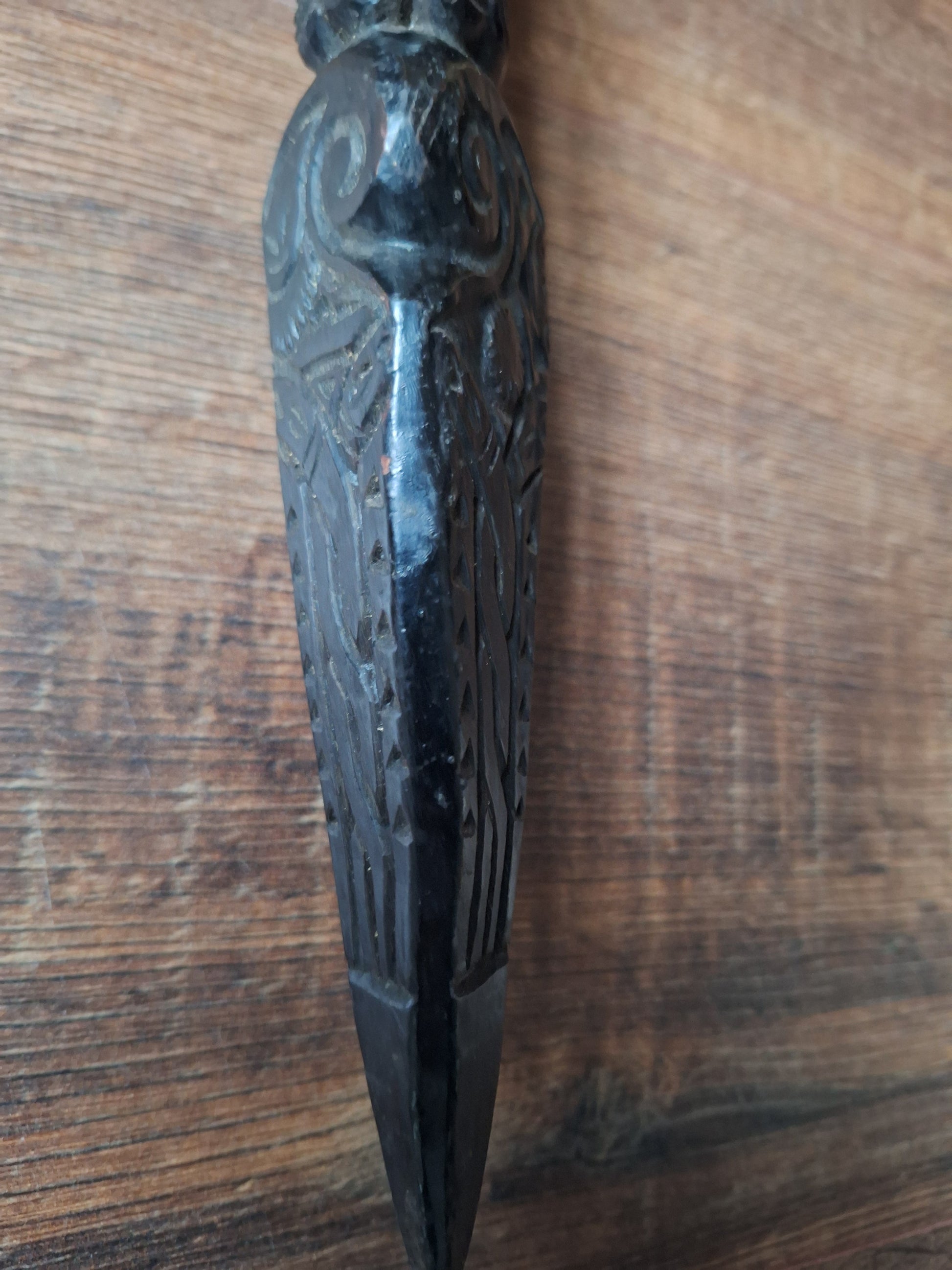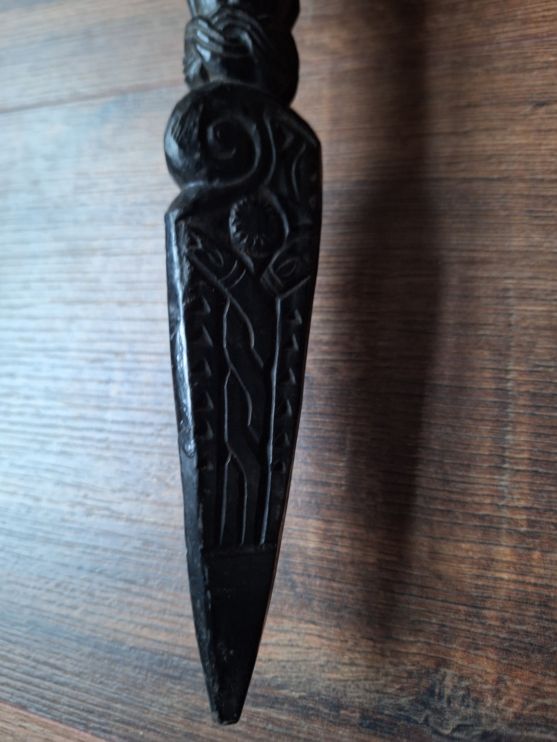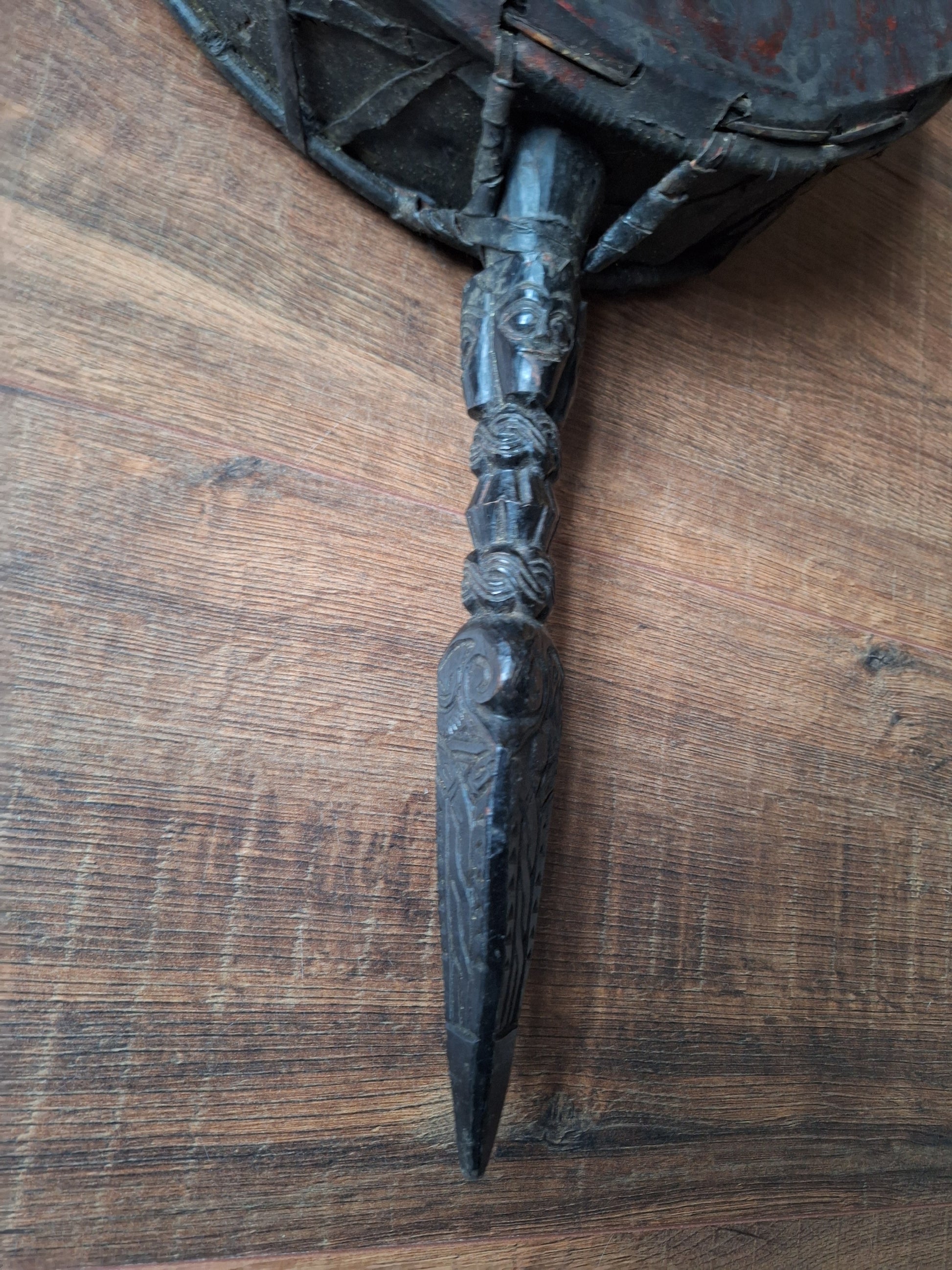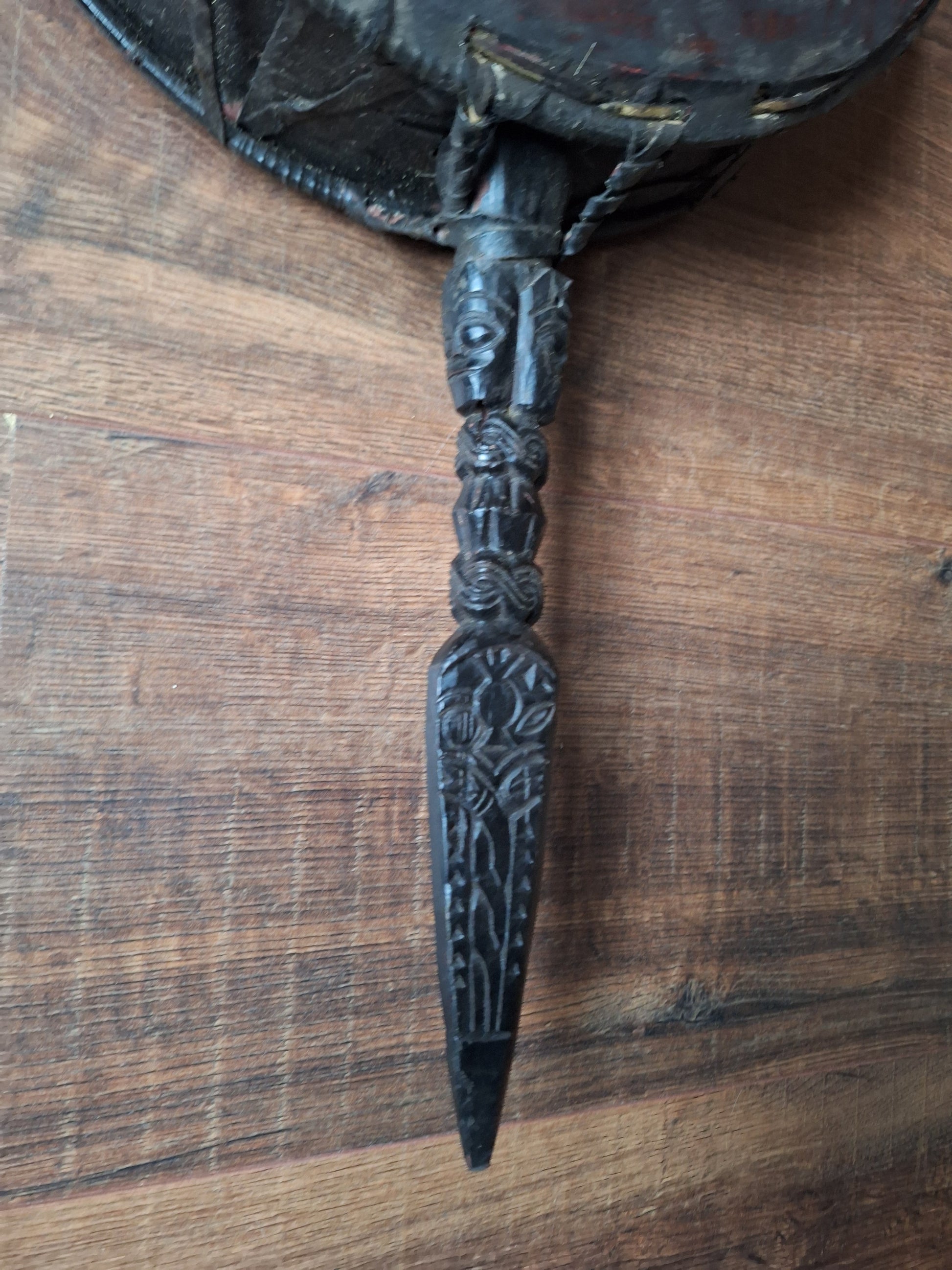 Most dhyangro drums have a typical wooden handle in the style of a phurba/kila; the three-side ritual dagger, commonly known in diverse spiritual traditions all over Asia. The phurba-shaped handle from this drum here in our shop is handcarved with depictions of the three-sided face of Vajrakilaya at the pommel, a combination of dorje and shrivatsa (endless knot) symbols in the middle and naga's, sun & moon and kalasha (ritual water vessel) symbols on the blade, which is held by the mythical watermonster Makara.