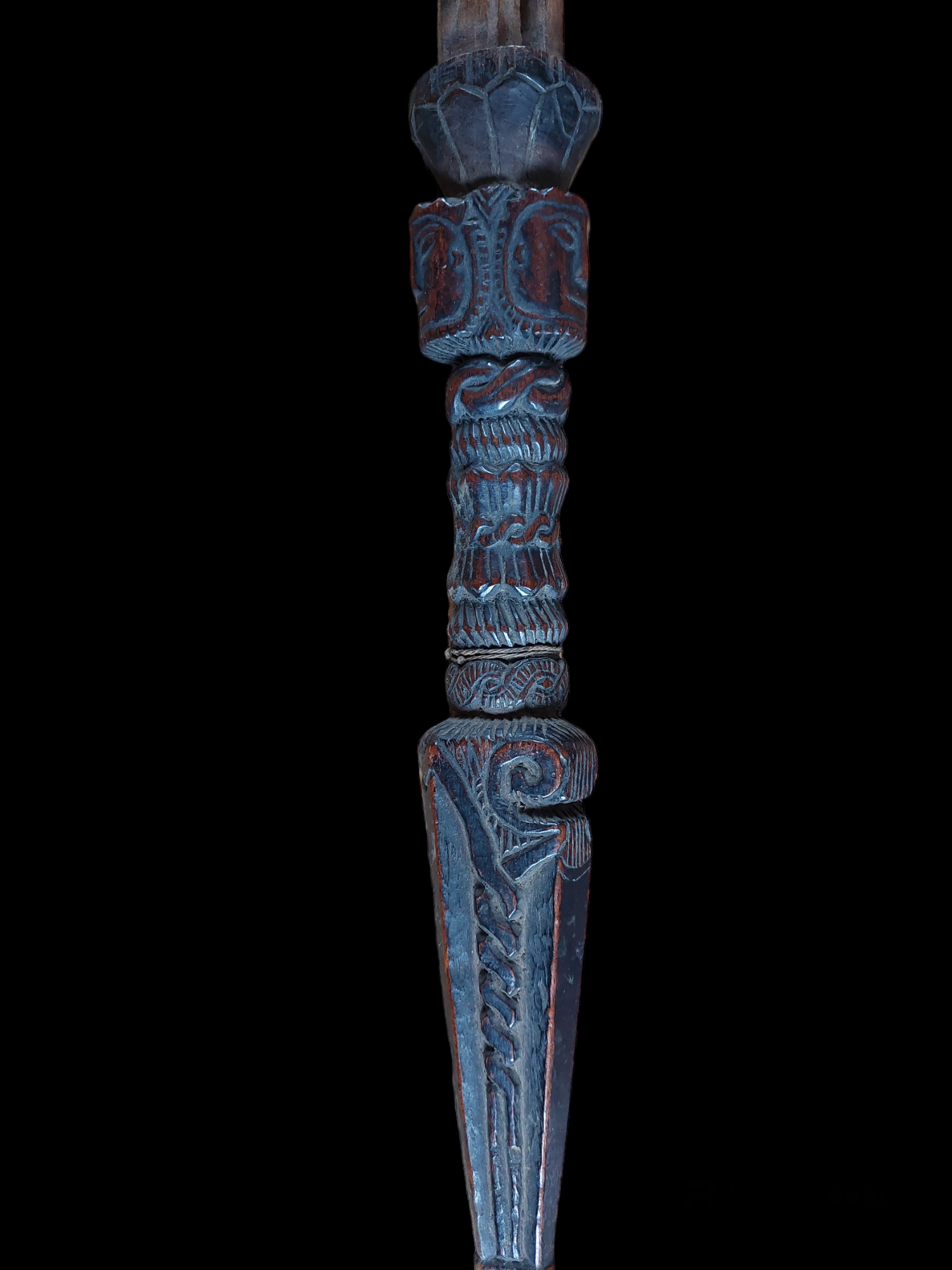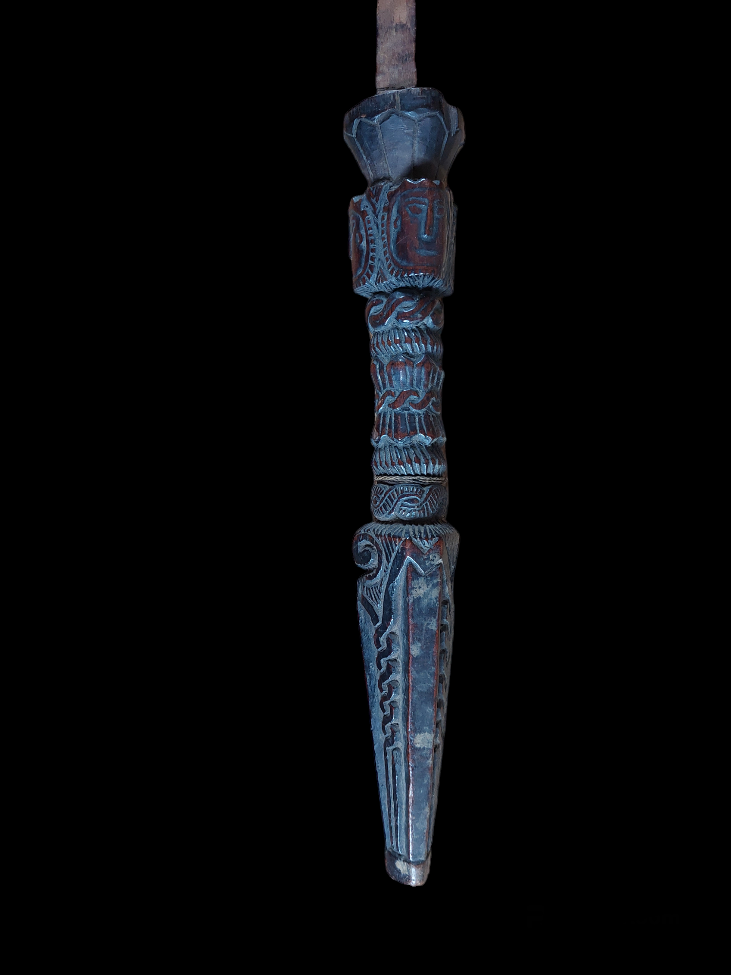 The dhyangro drum handle here in our shop is handcarved with depictions of the three-sided face of Vajrakila, some shrivatsa (endless knot) variations and snakes and the watermonster Makara on the three-sided blade.