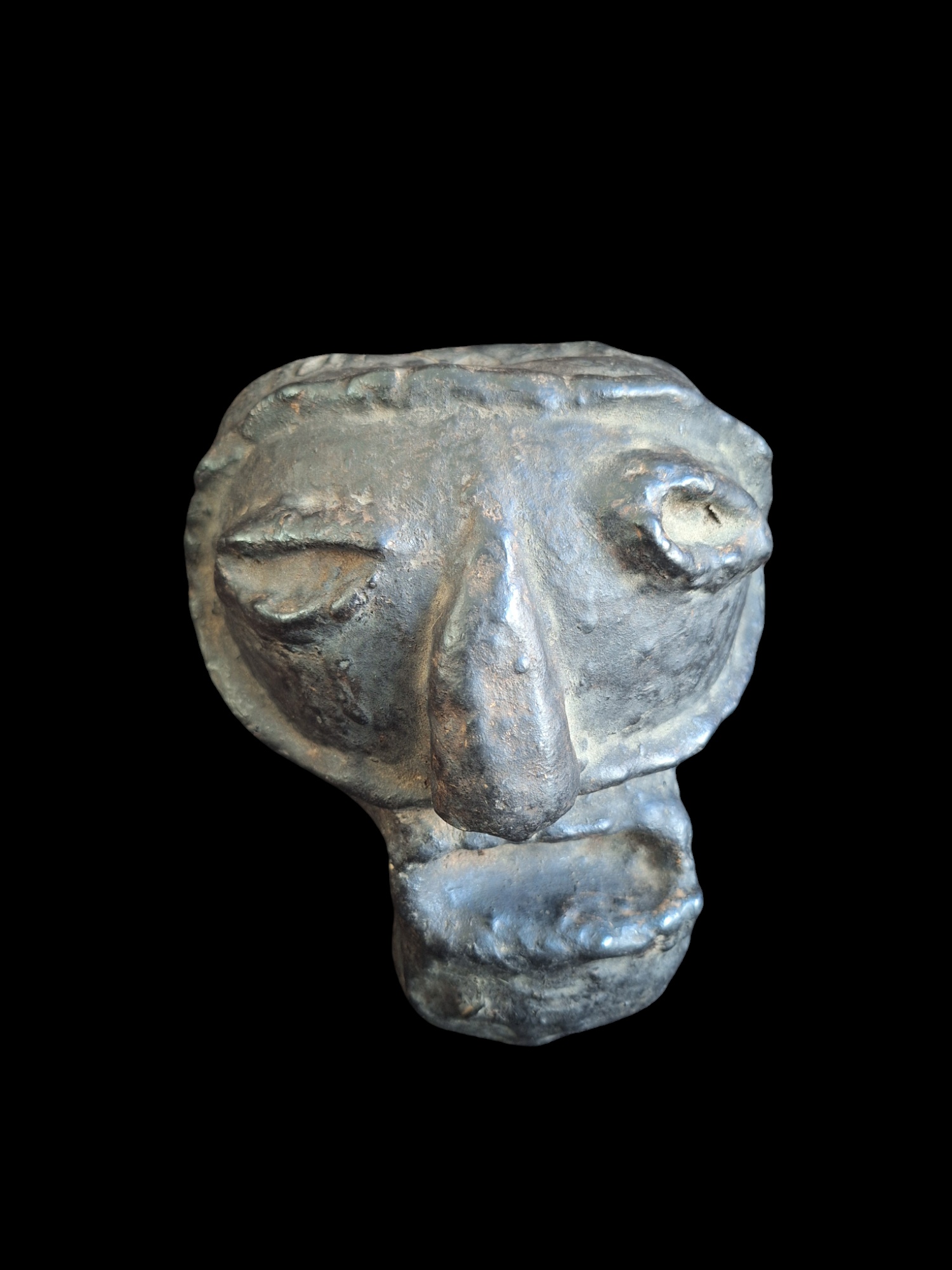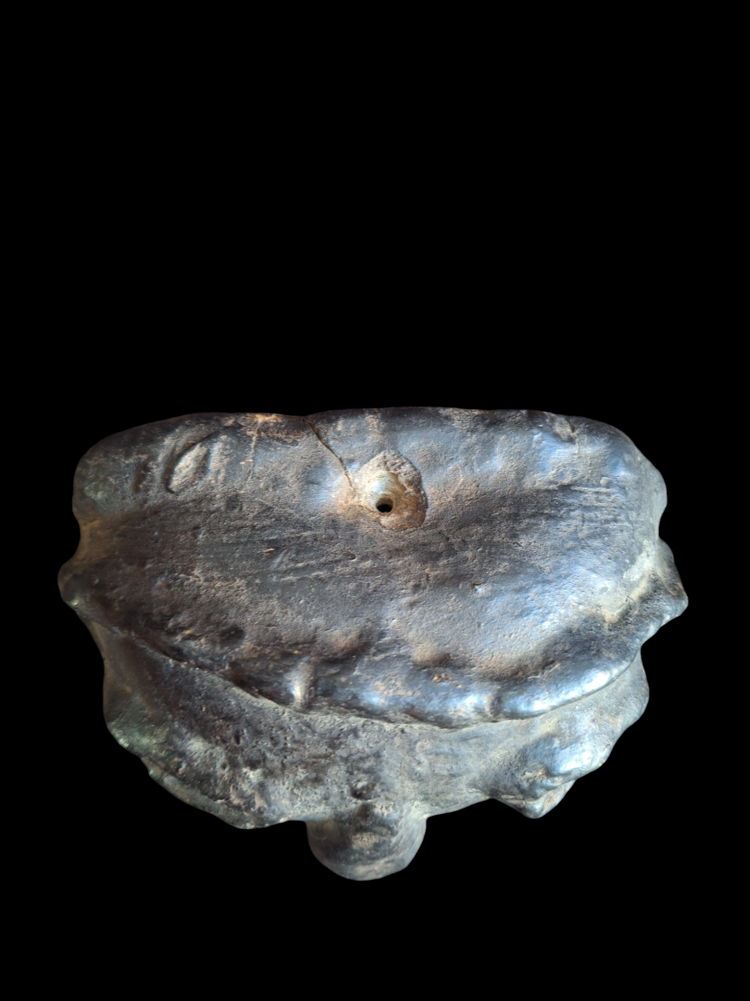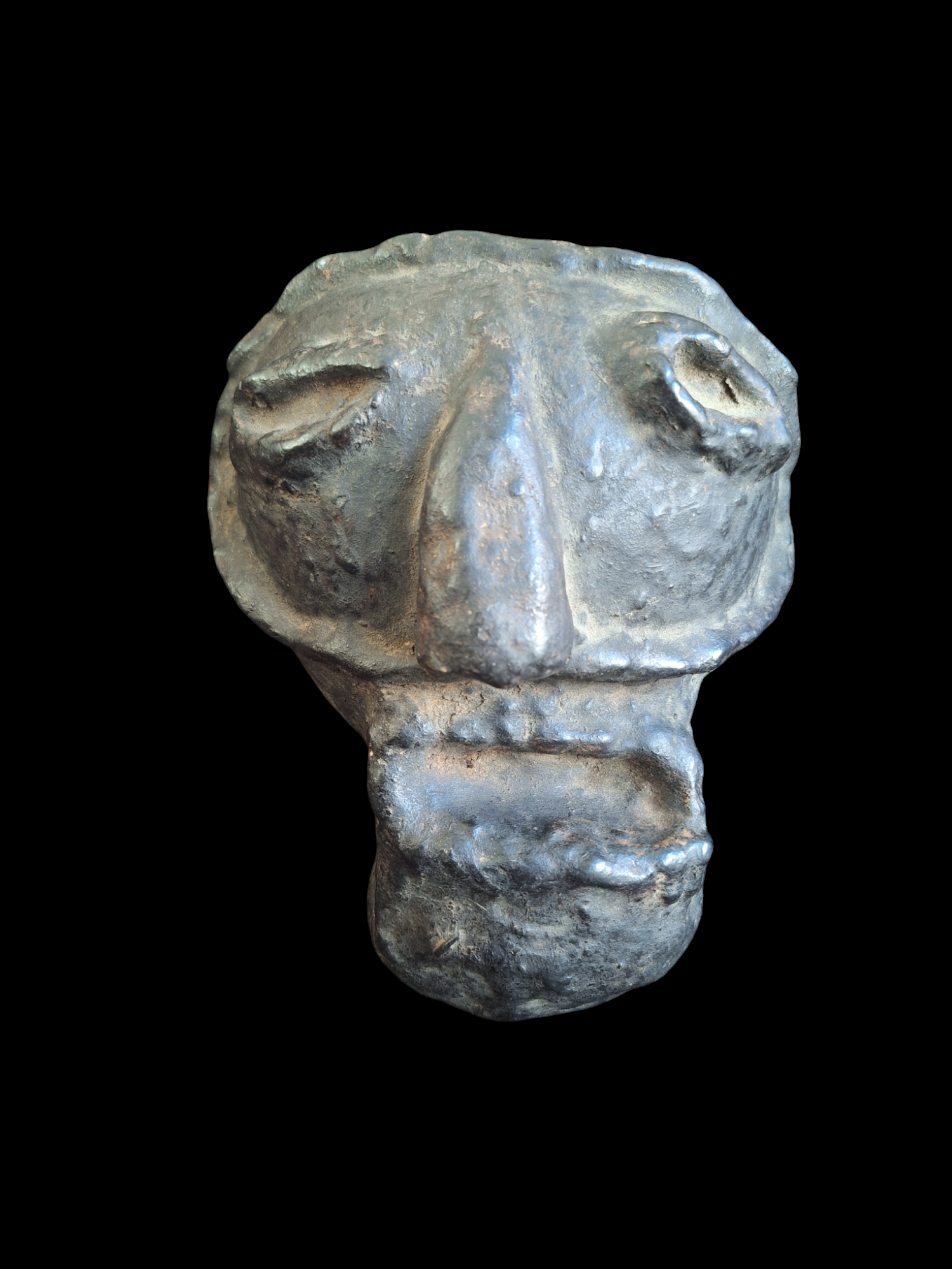 Beautiful spirit mask, carved from a gourd. Handmade in Nepal. A unique item; due to its natural origin, there will never be another one with exactly the same features. This mask is an old one already. It was made somewhere around the mid 20th century, or maybe even a little bit earlier. Over its long years of existence, it has gotten a beautiful dark patina.
