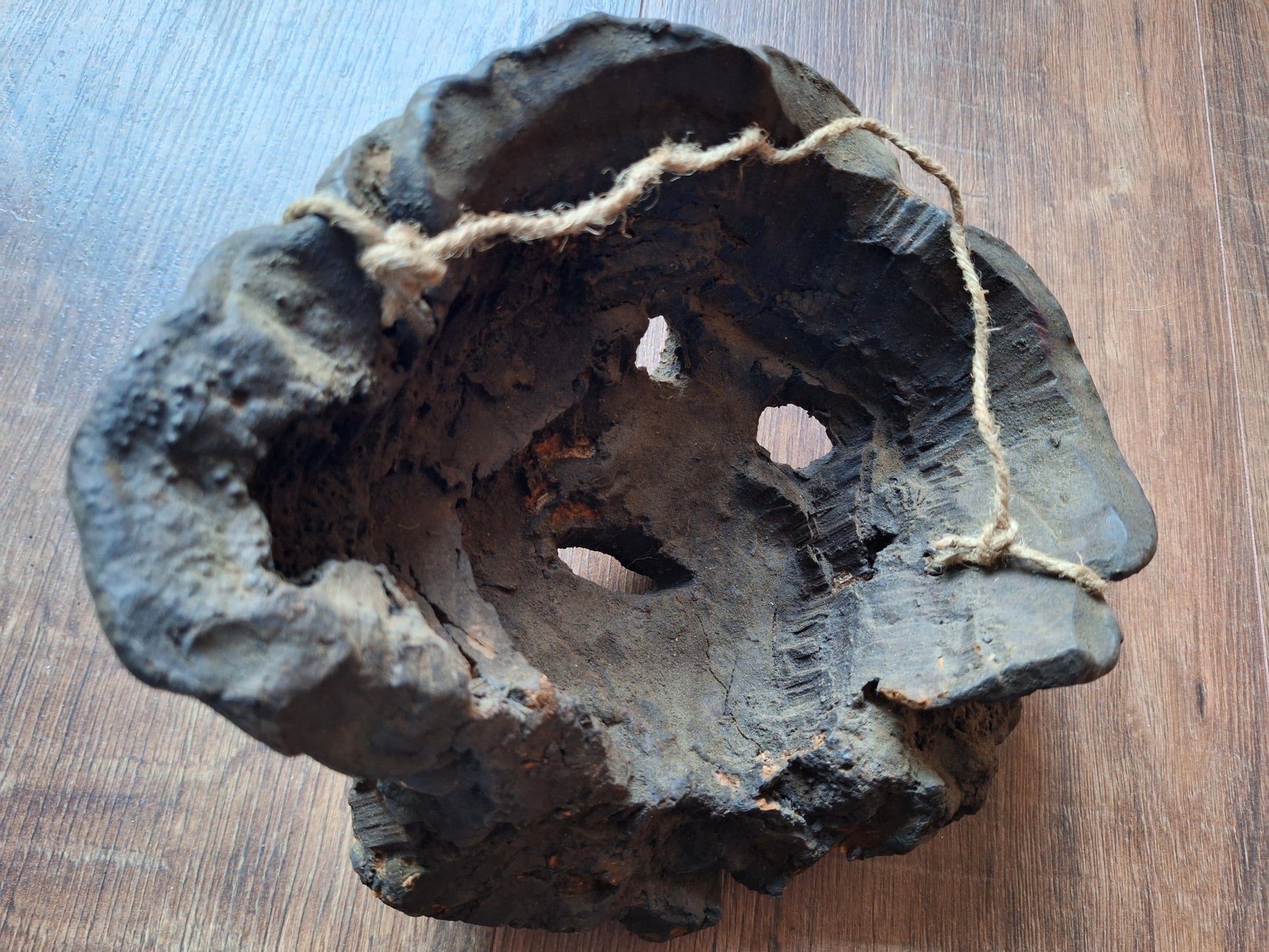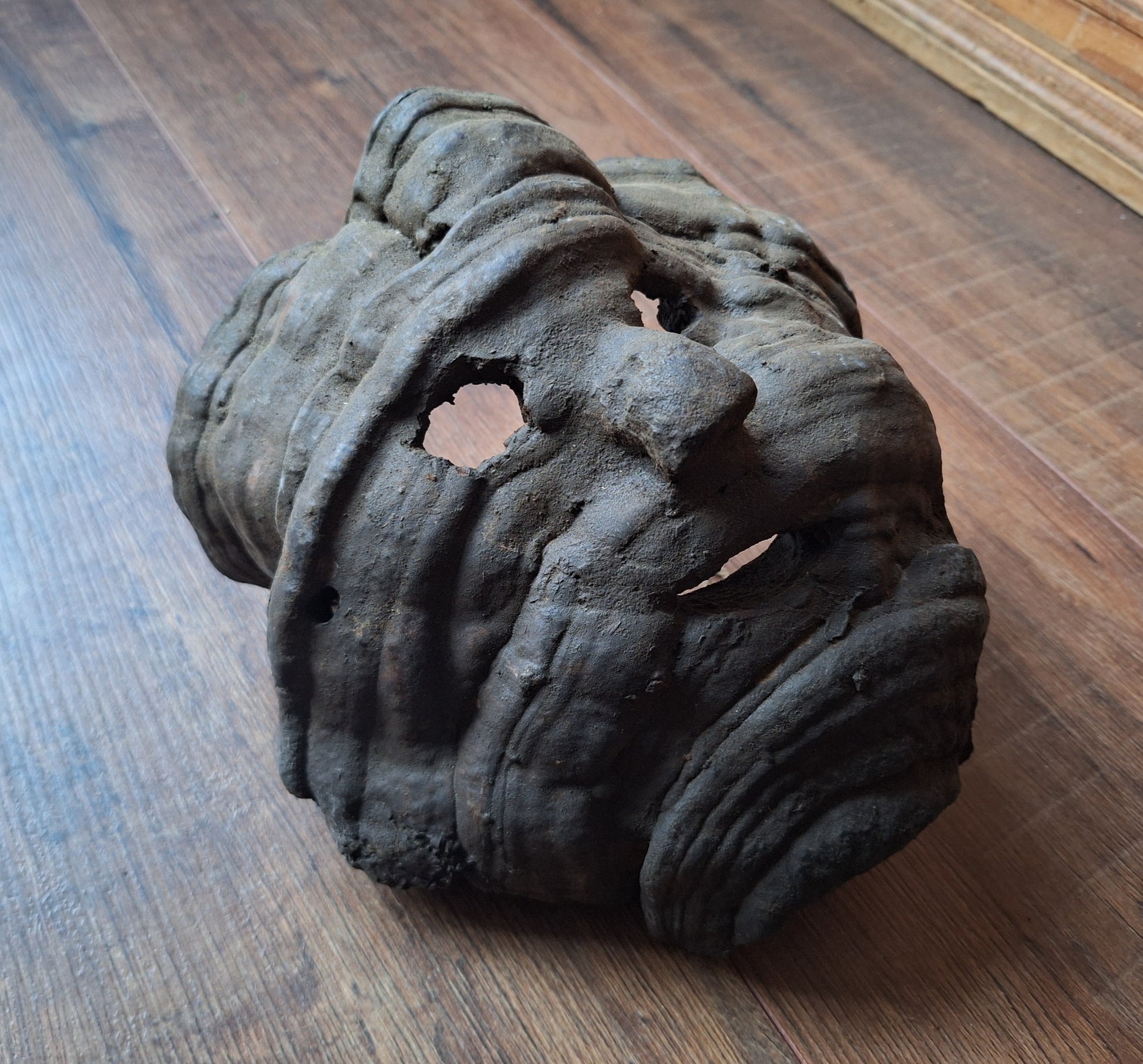 This item is a particularly beautiful example of such a mask. It is, especially considering its age and of course fragile nature, in excellent condition. It has a beautiful, balanced shape in which the natural structure of the funghi can still be very well recognised. This mask measures approximately 24 centimeters wide and 19 centimeters high. Over time it has developed a beautiful dark, almost glossy, patina.