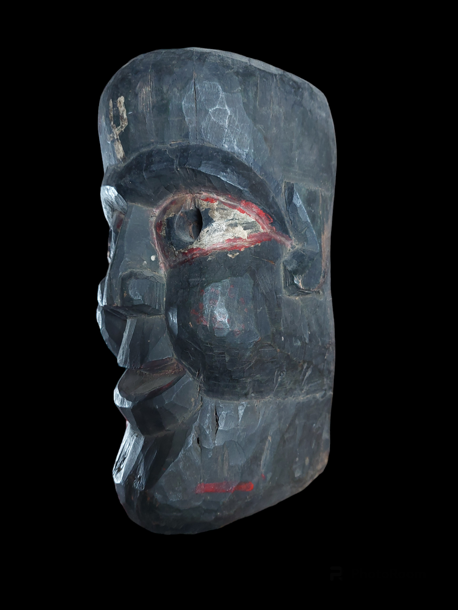 This item is in very good condition. It is made from wood which has been treated with natural pigments to attain a beautiful dark color, which has deepened over the years with the patina of ageing. Residue of old paint decorations and symbols can be seen on it, among which is a trident symbol on the forehead.