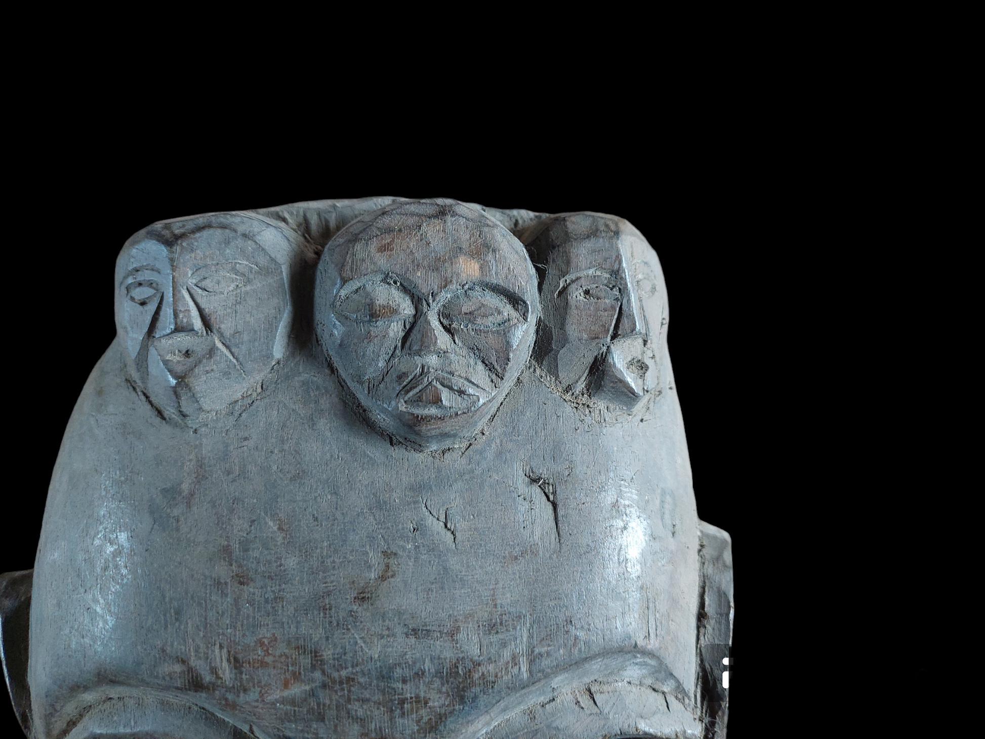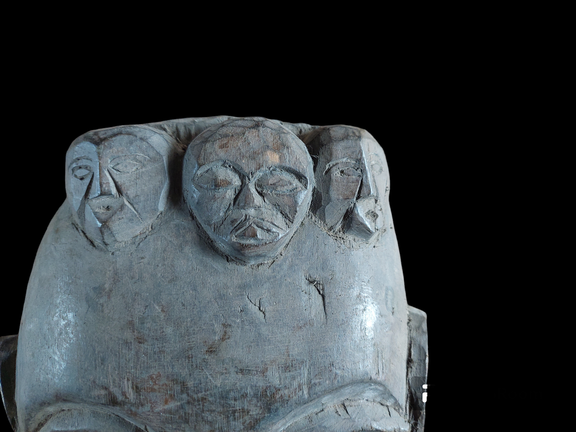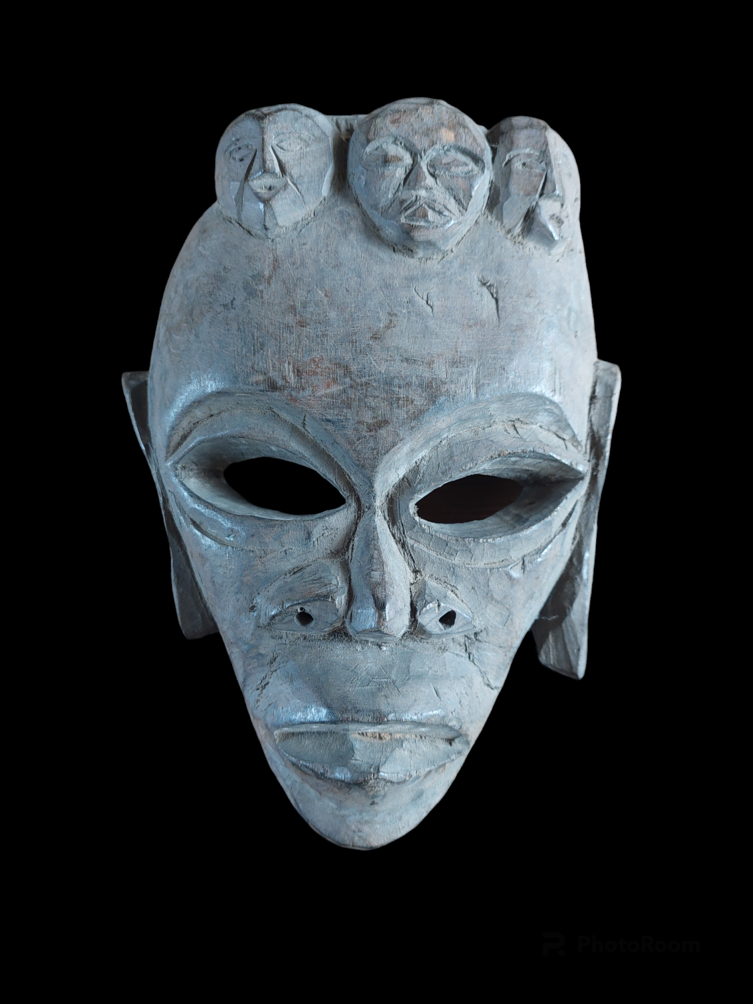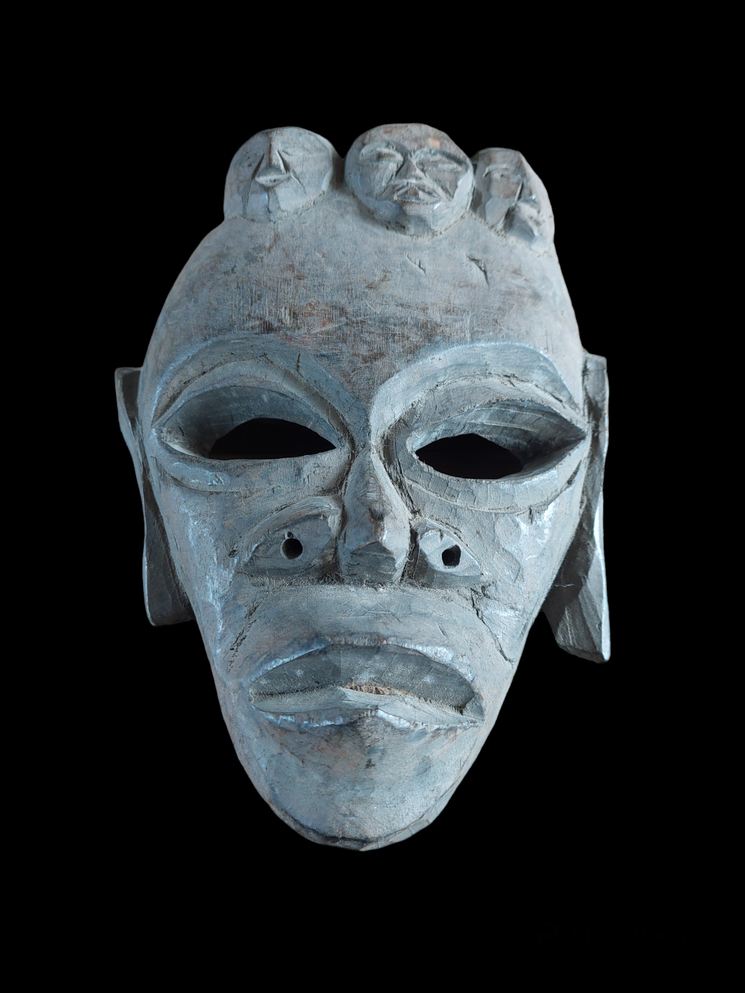 On top of the forehead, a row of three faces is depicted. The faces carry three different facial expressions; wrathful, peaceful and joyful (similar to the three faces that can often be found on the pommel of the phurba, the Himalayan ritual dagger). This symbolism, combined with the quite deterrent facial expression of the mask, suggest that this mask is most likely made to be the house of a very strong protective spirit or even wrathful deity.