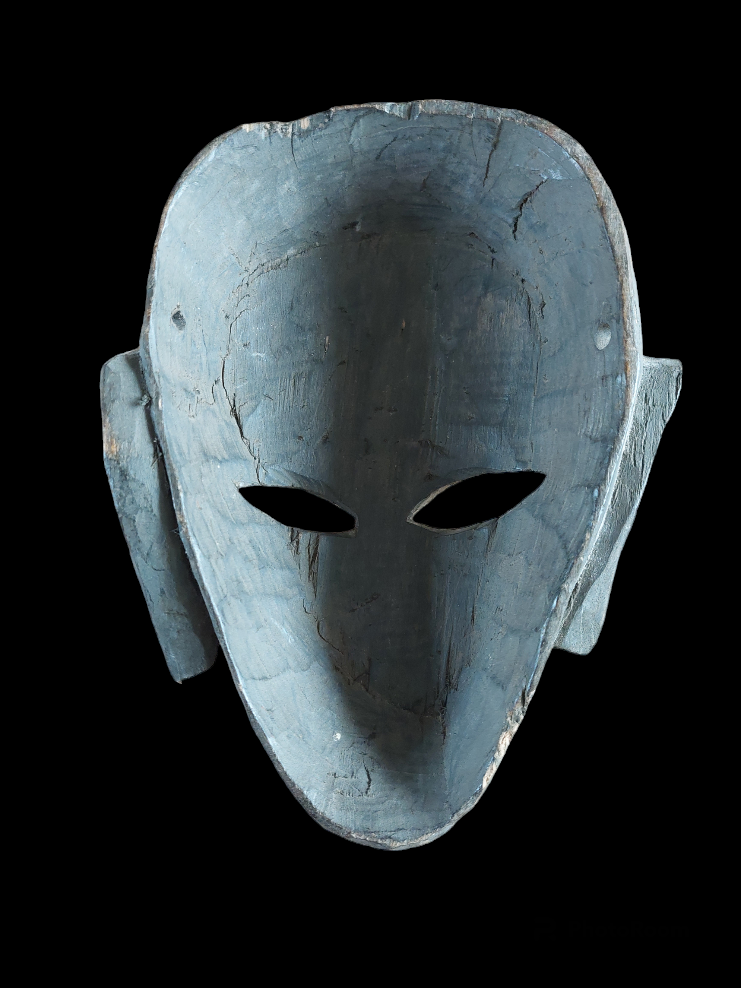 Being an old item already, this mask shows some signs of its age and previous usage, but overall it is still in good condition. On both sides of the forehead, a hole has been drilled, making it possible to thread a cord through to turn it into a wallhanger.