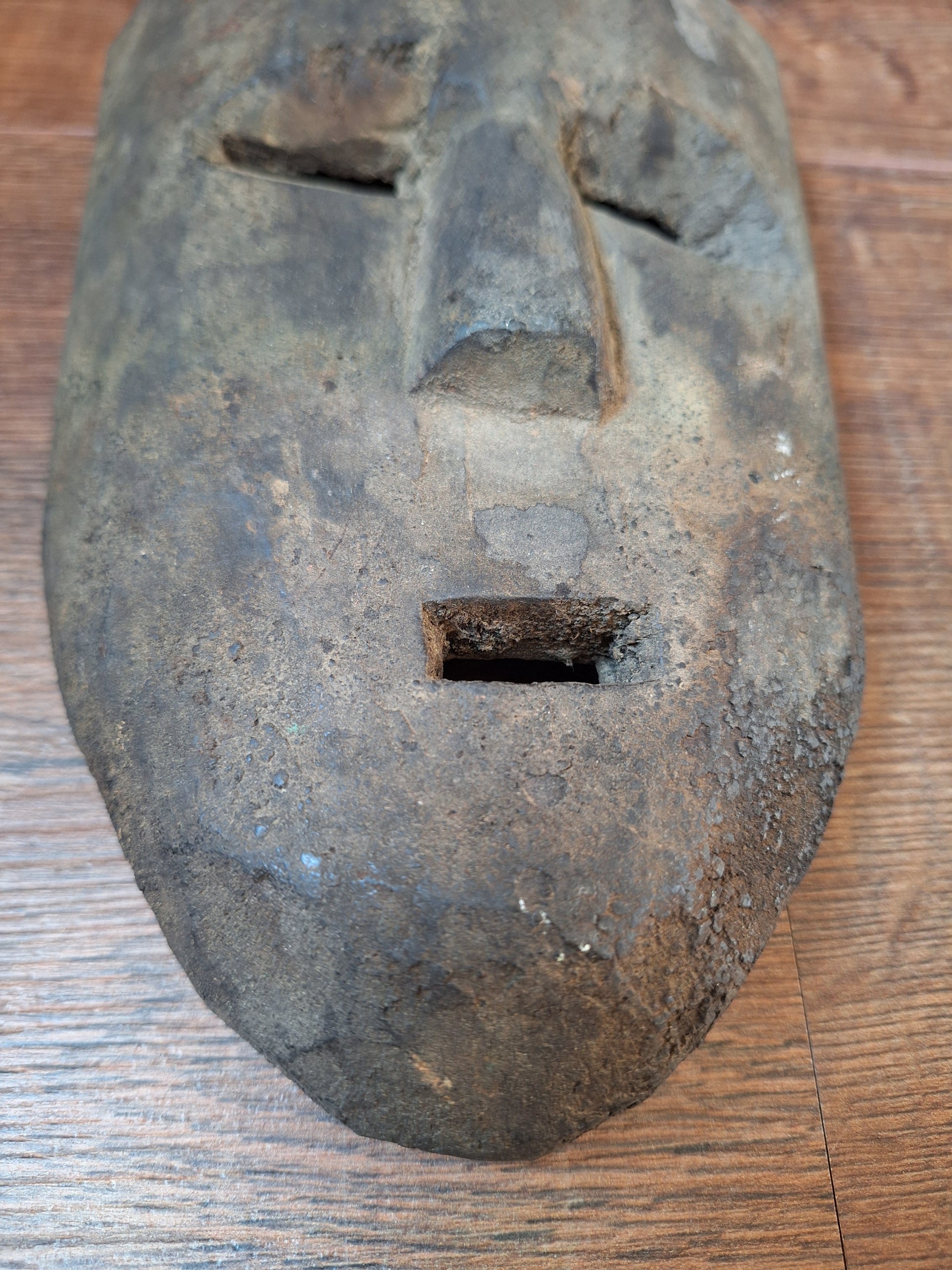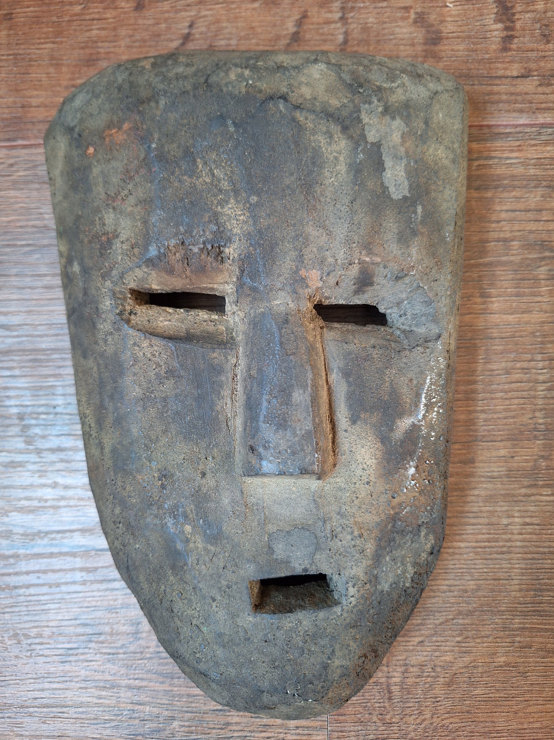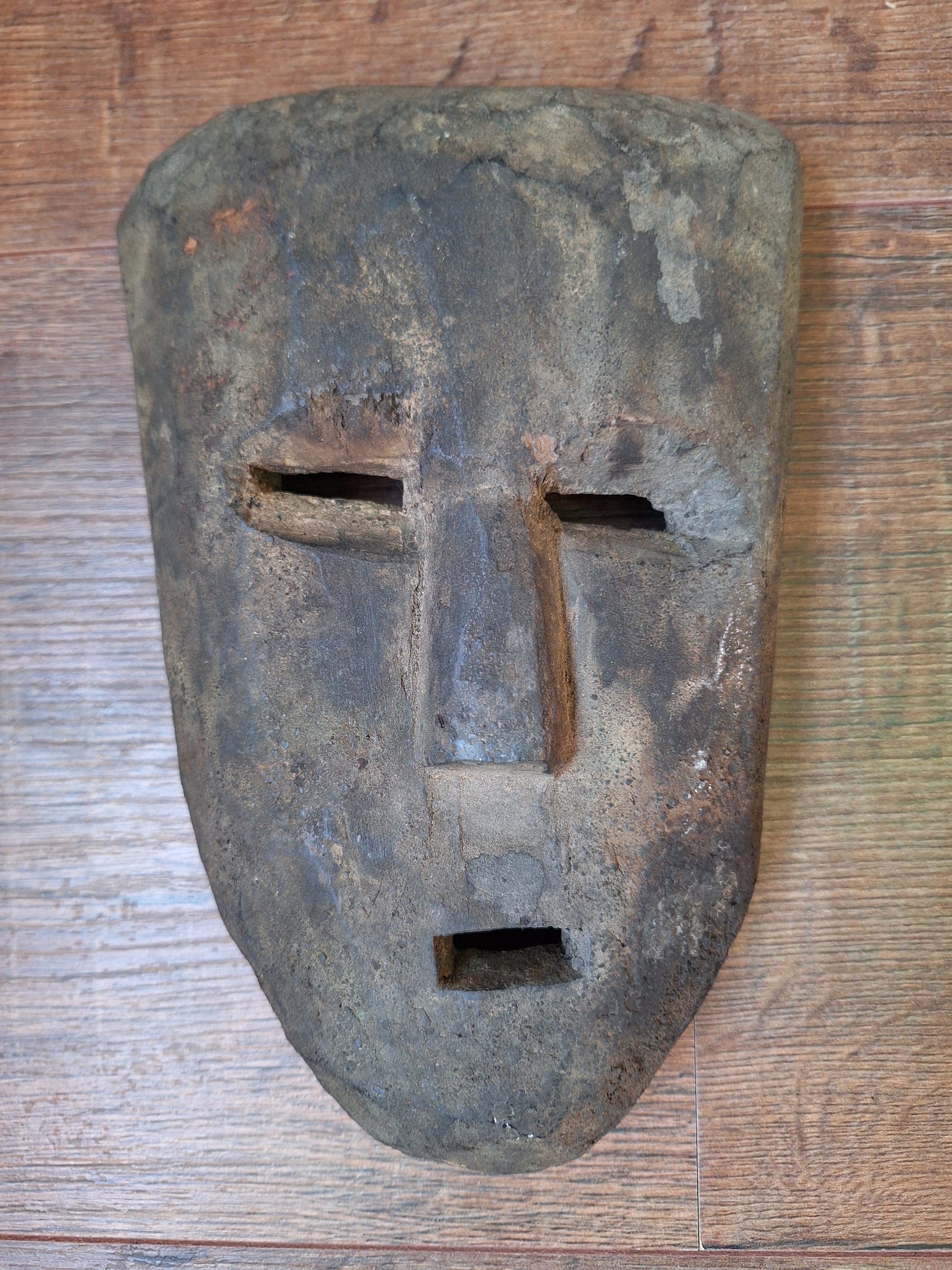 This handcarved mask is approximately 15 centimeters wide and 23 centimeters high. Its exact age is hard to say, but it can roughly be determined around the late 19th or early 20th century. This very old mask has been made from a dark hard wood and of course shows some minor signs of its respectable age, but it is overall in very good condition and will no doubt make a great spirit house once again. On both sides of the face a small hole has been drilled, making it possible to thread a cord through to use it as a wallhanging object.