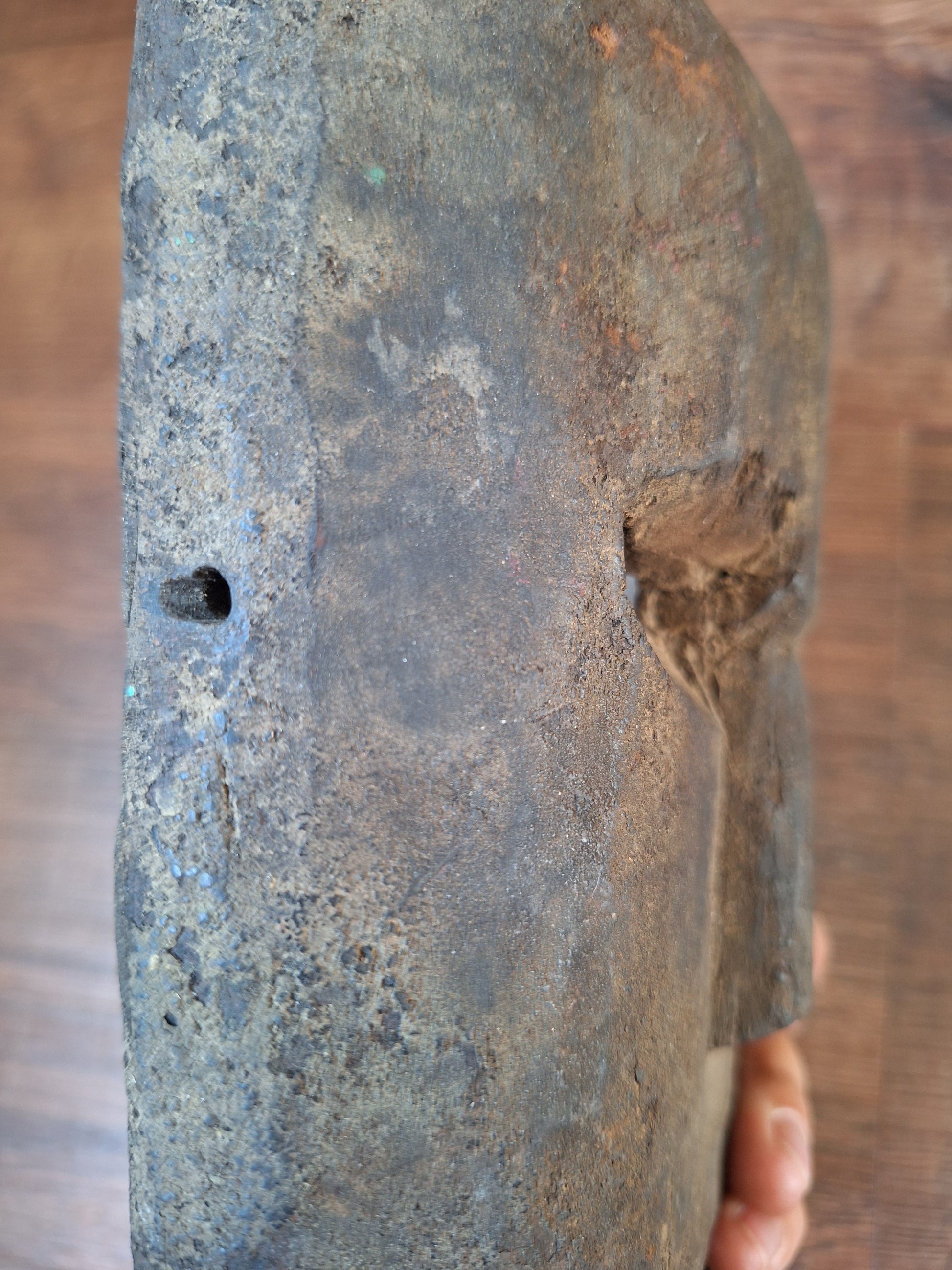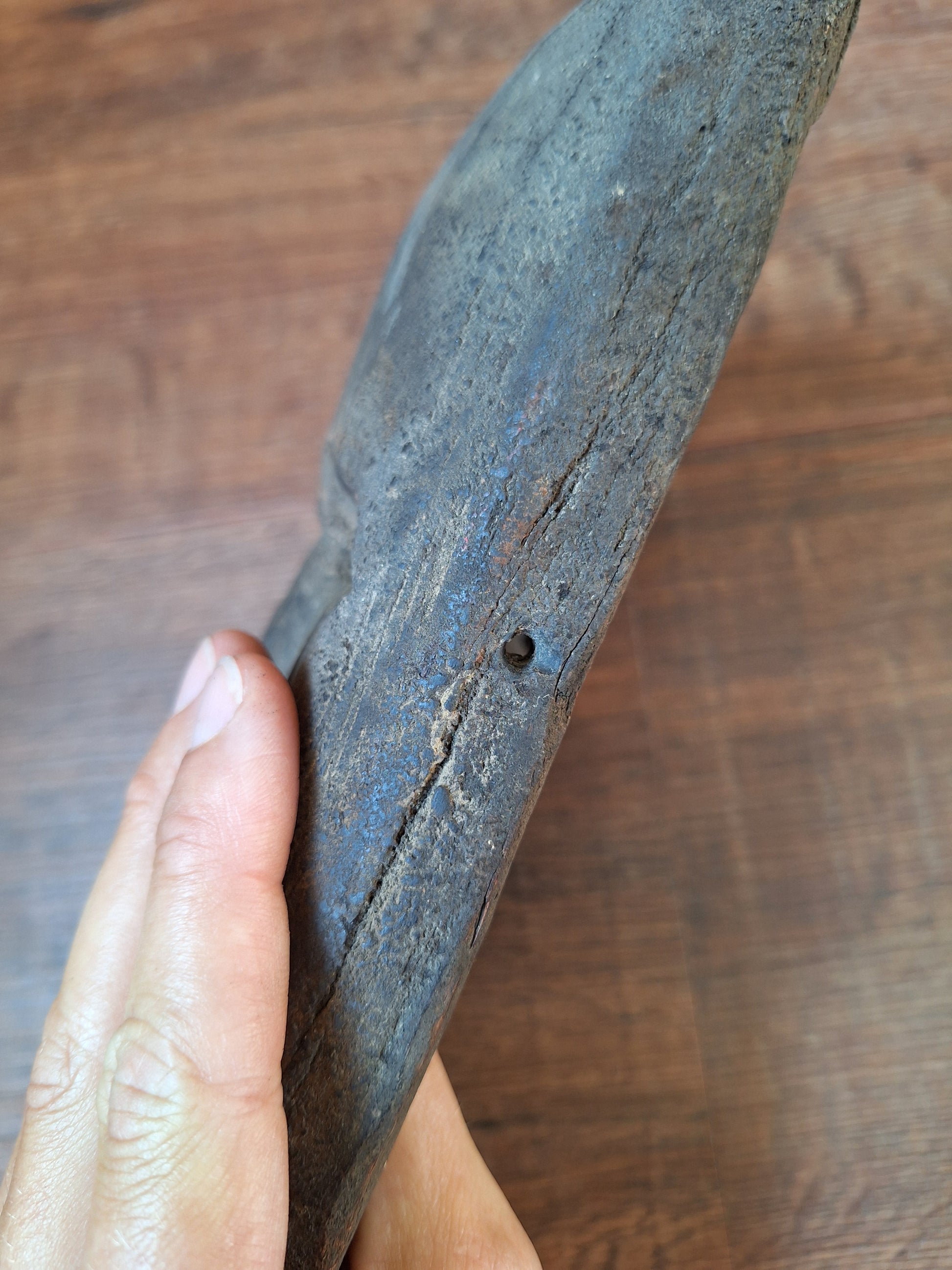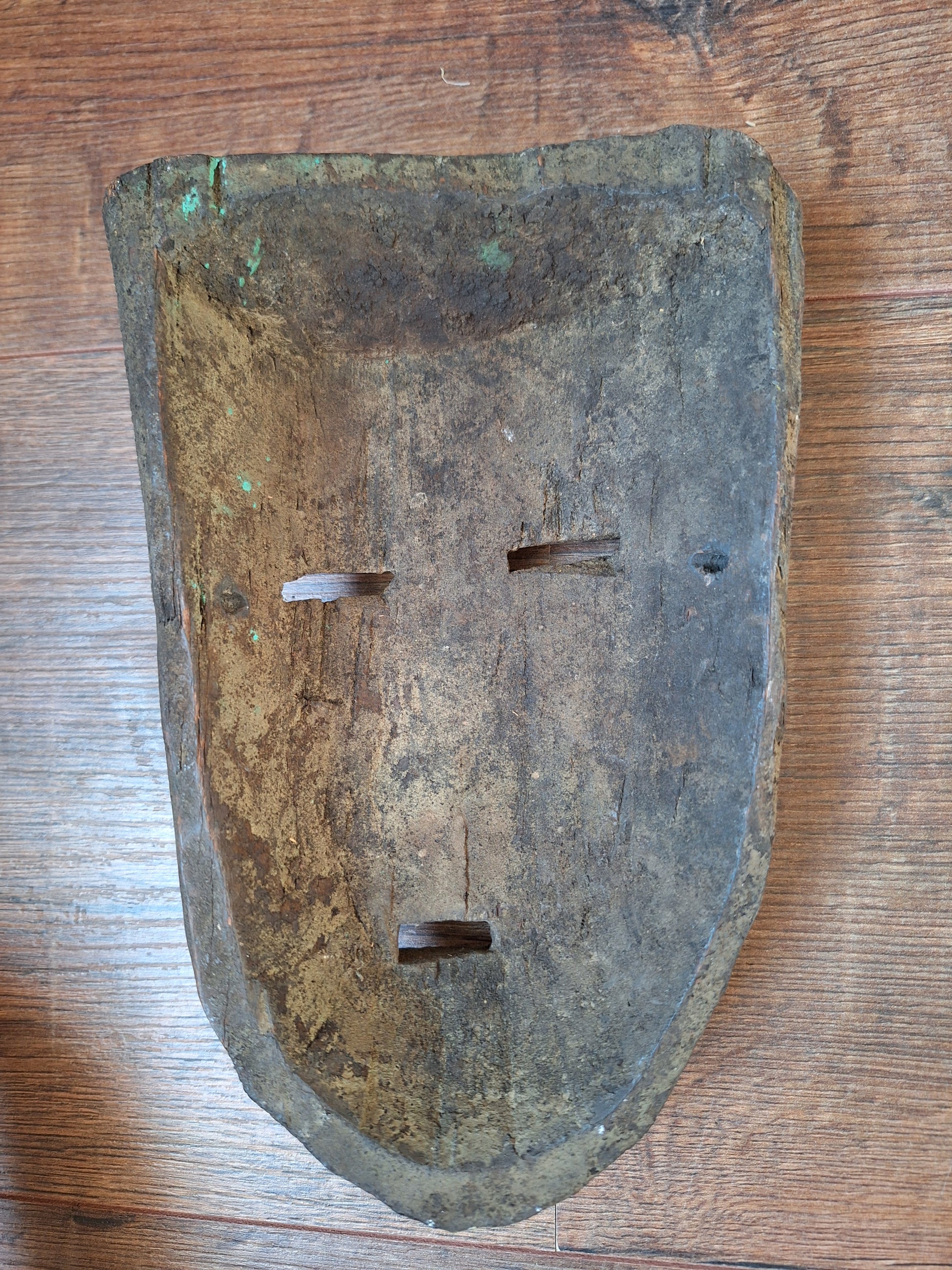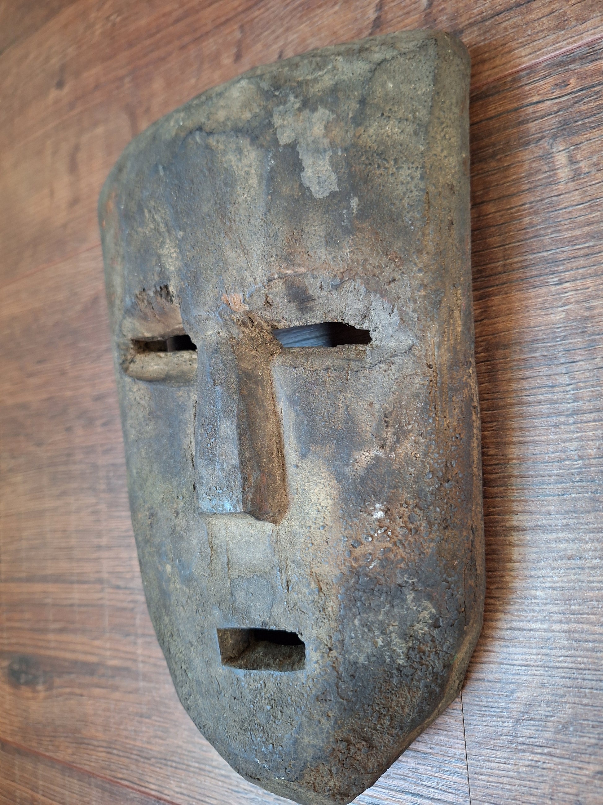 This handcarved mask is approximately 15 centimeters wide and 23 centimeters high. Its exact age is hard to say, but it can roughly be determined around the late 19th or early 20th century. This very old mask has been made from a dark hard wood and of course shows some minor signs of its respectable age, but it is overall in very good condition and will no doubt make a great spirit house once again. On both sides of the face a small hole has been drilled, making it possible to thread a cord through to use it as a wallhanging object.