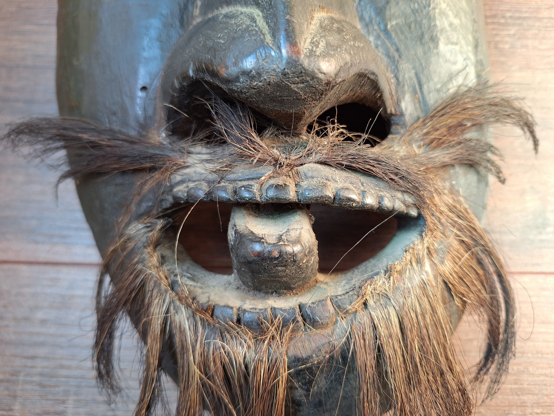 Considering its respectable age, this item is in very good condition. It is made from a dark hard wood which has been treated with natural pigments to attain an even more intense and beautiful dark color, which has further deepened over the years with a glossy patina of ageing. The mask is decorated with dark brown yak hair.