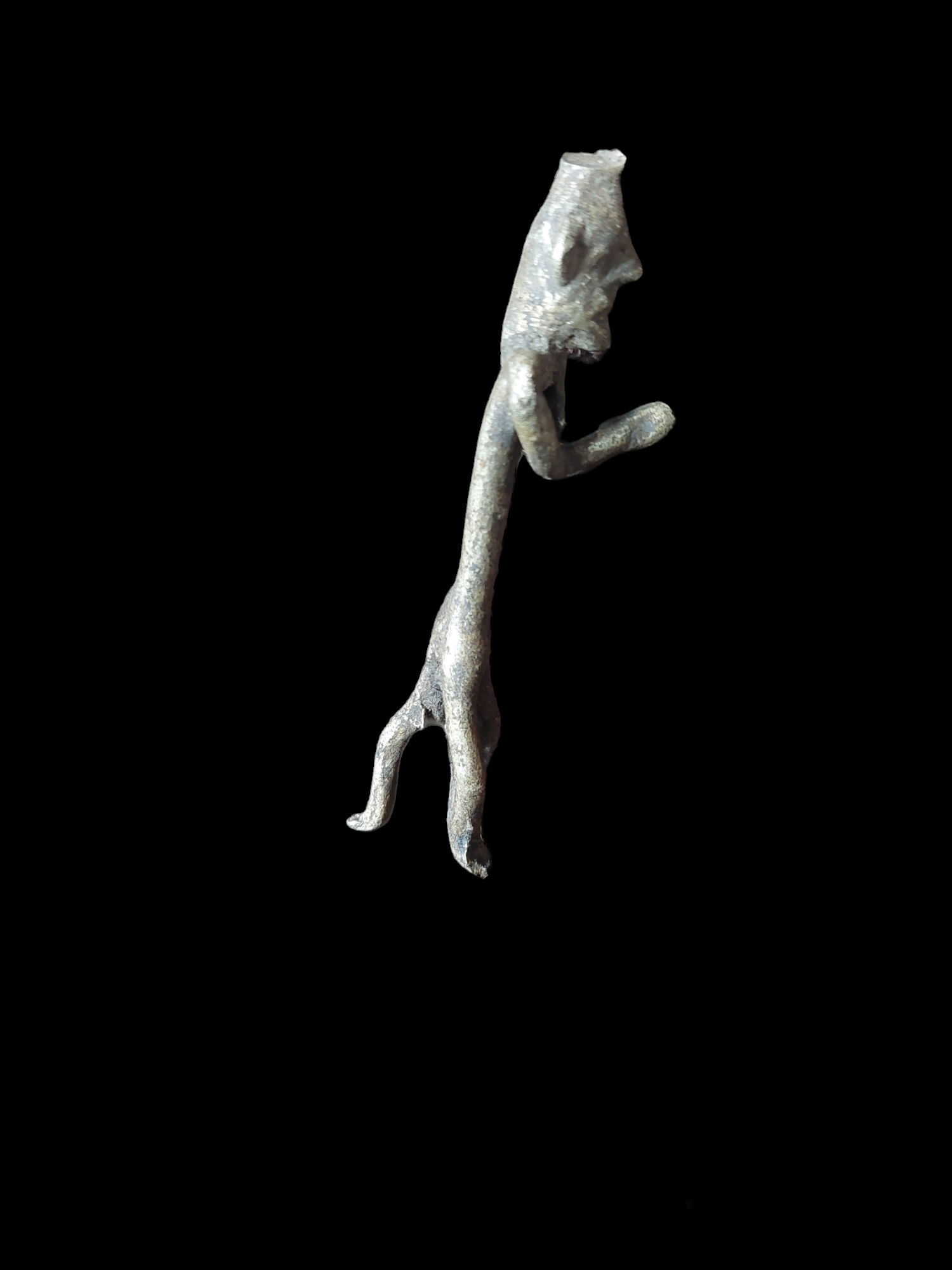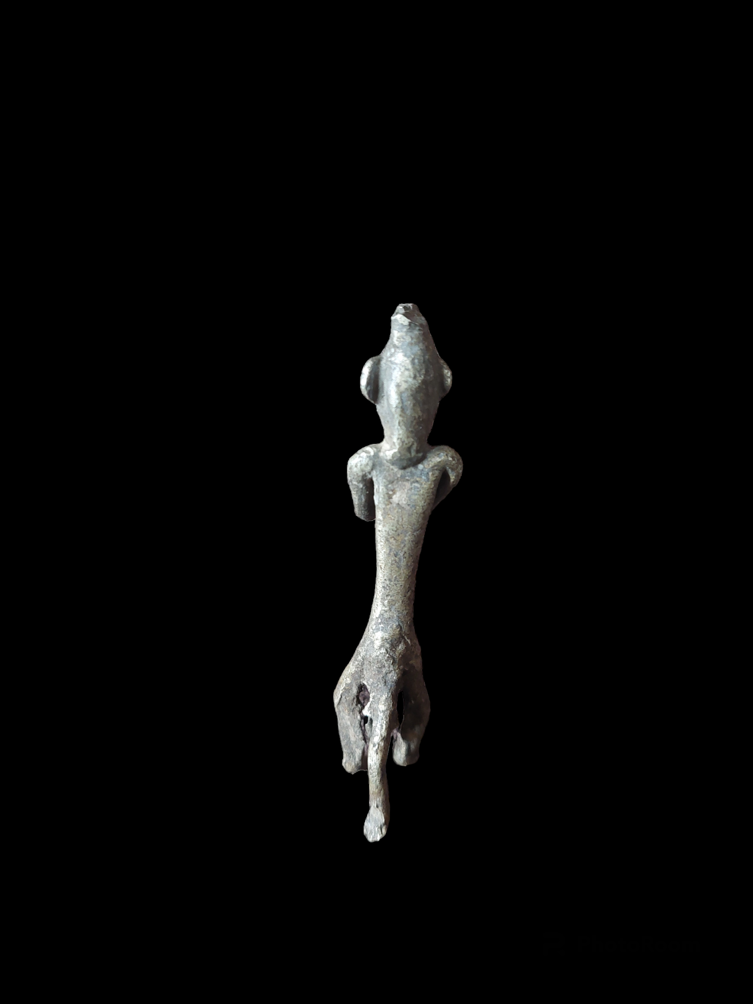 This copper alloy figurine has been made somewhere in the 19th - early 20th century in the Jajarkot district in West Nepal. The style of the figurine, with somewhat elongated features, made with the 'lost wax' metal casting method, is very typical for the semi-nomadic people living in this area.