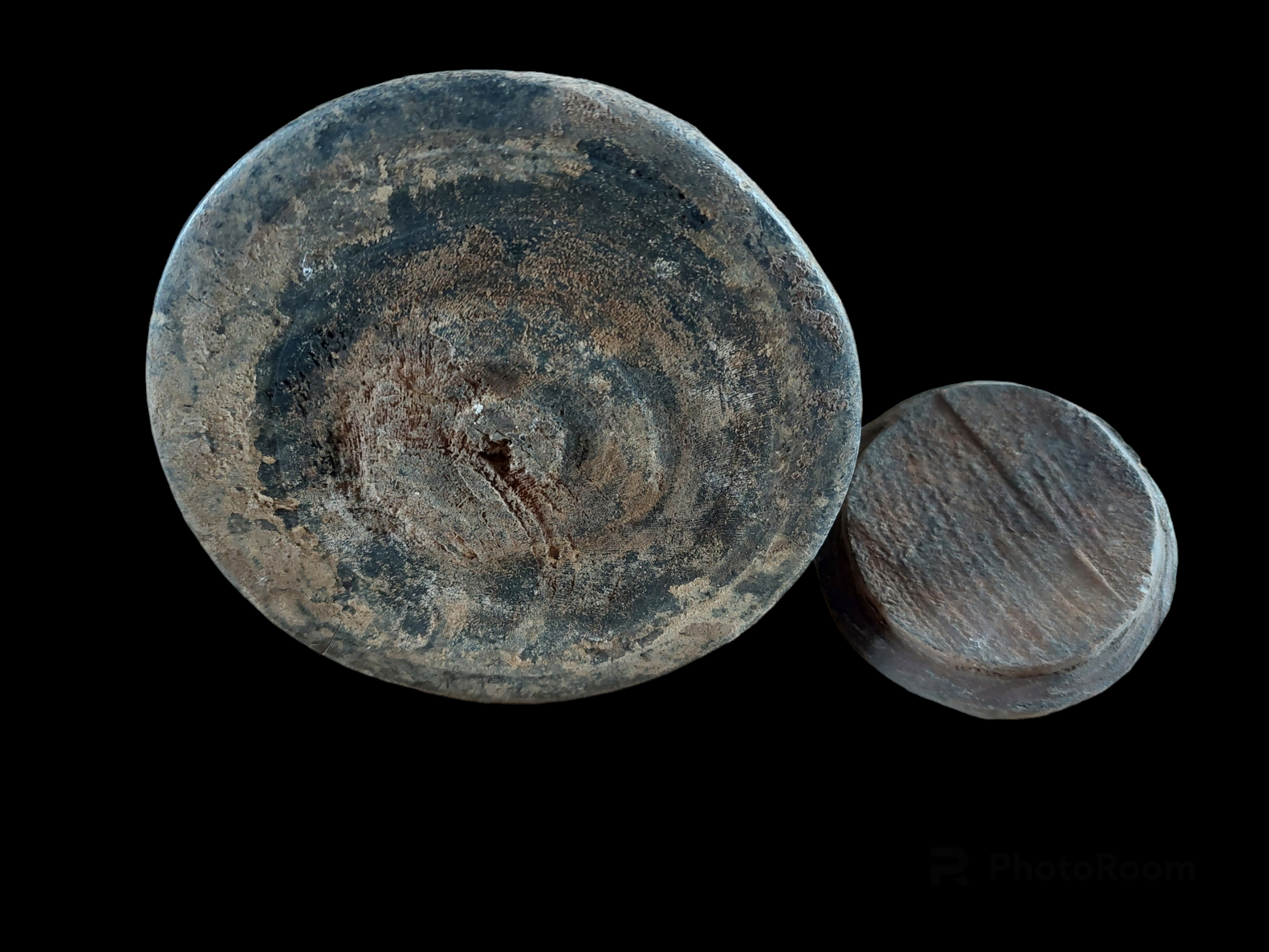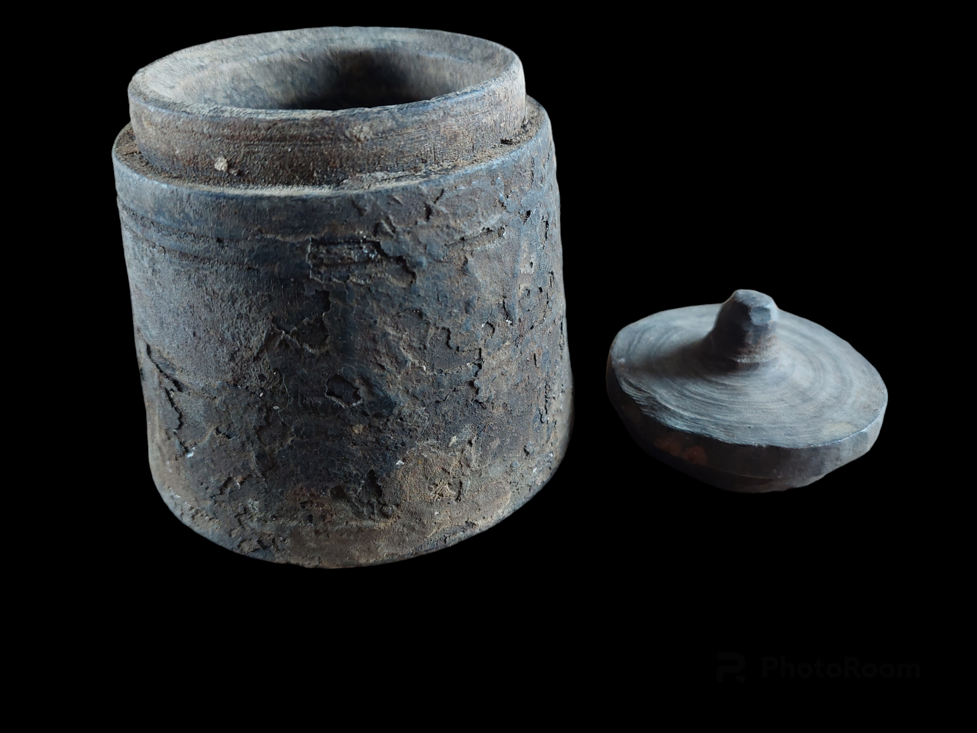 In the Himalayan herding communities, yak butter is one of the main staple foods and an important trading item. Handmade wooden jars like this can be found in every household. They are often of very simple, purely practical design, sometimes decorated with a few accenting lines, such as also the case with this beautiful example.
