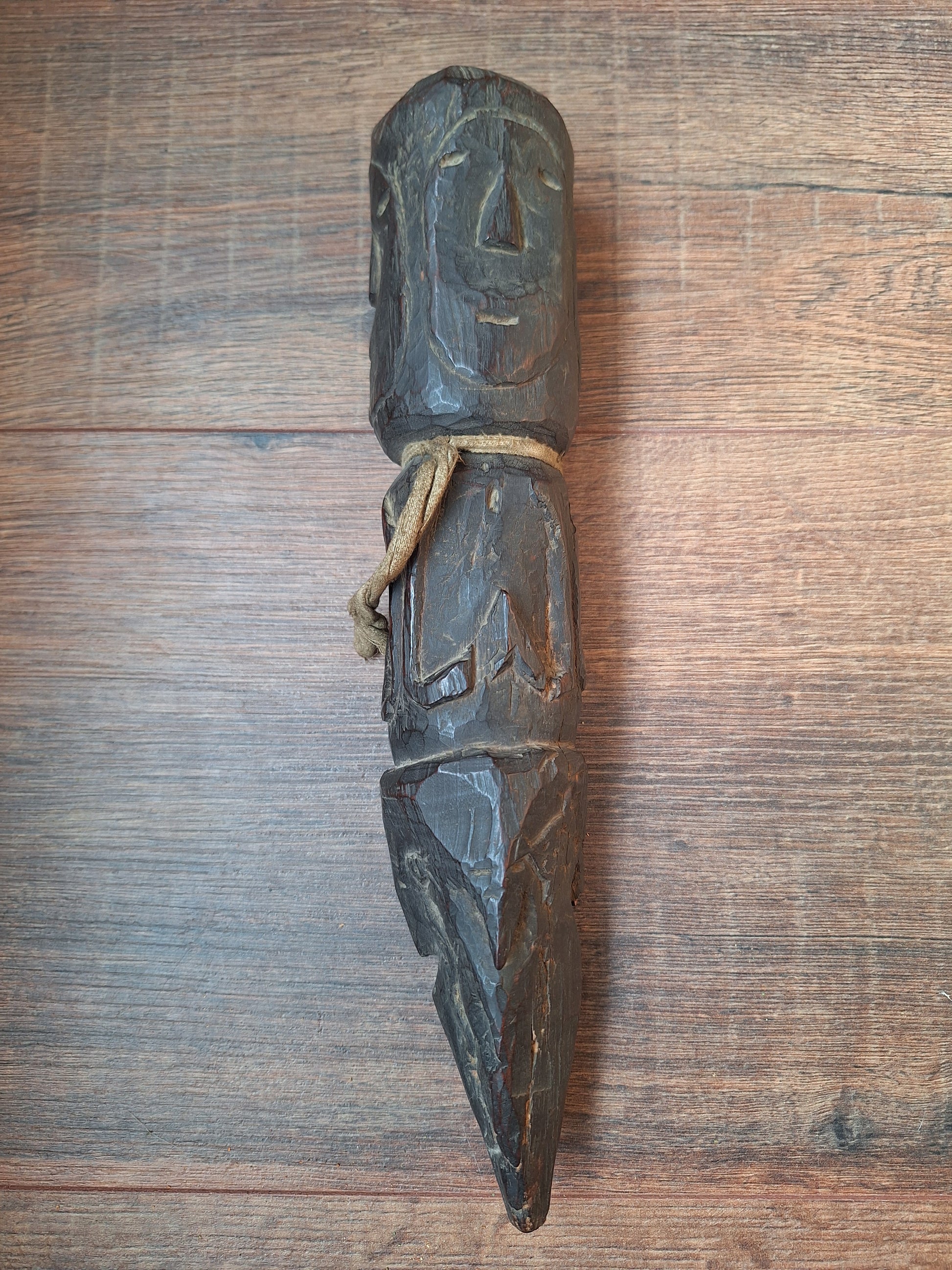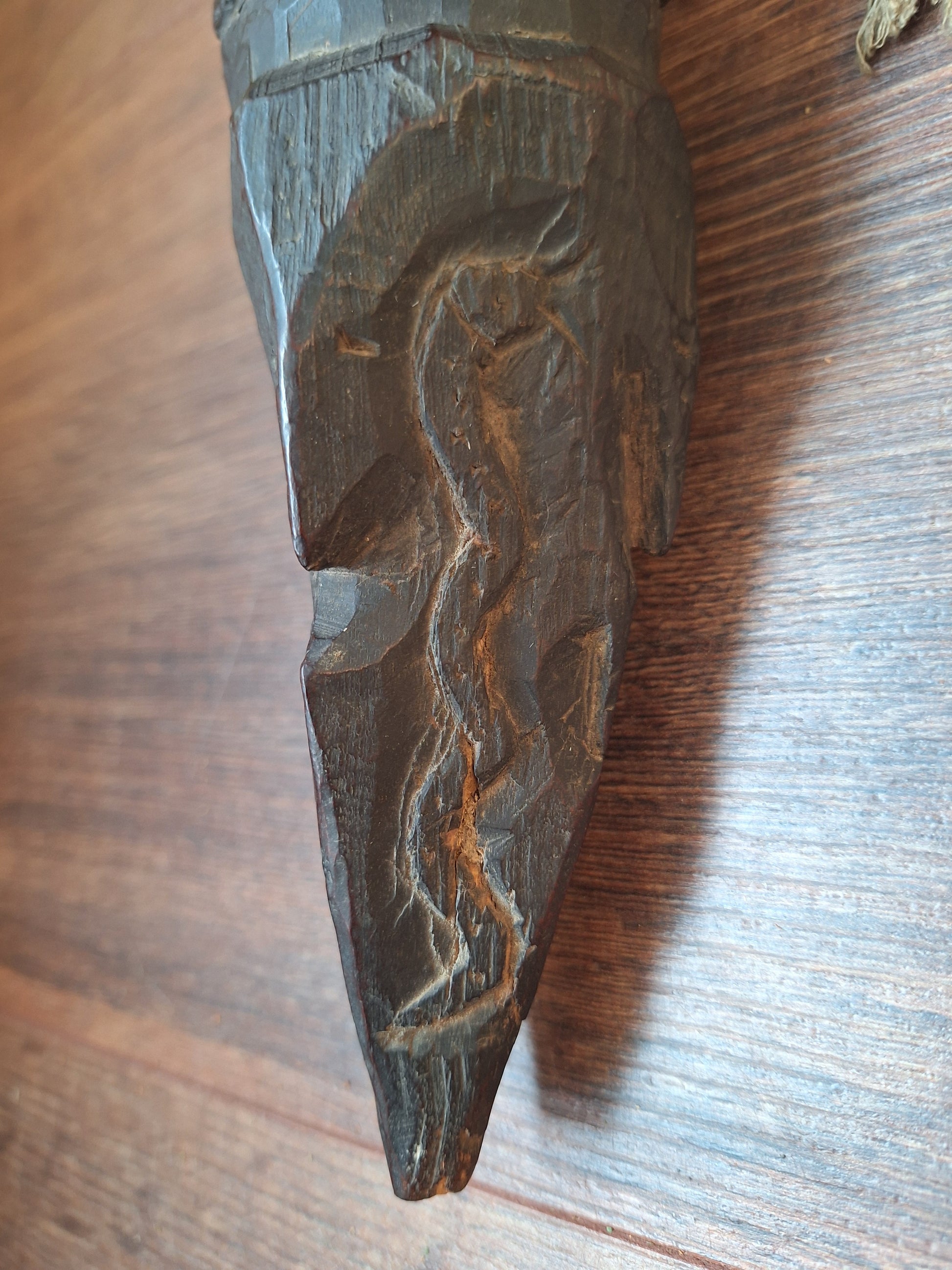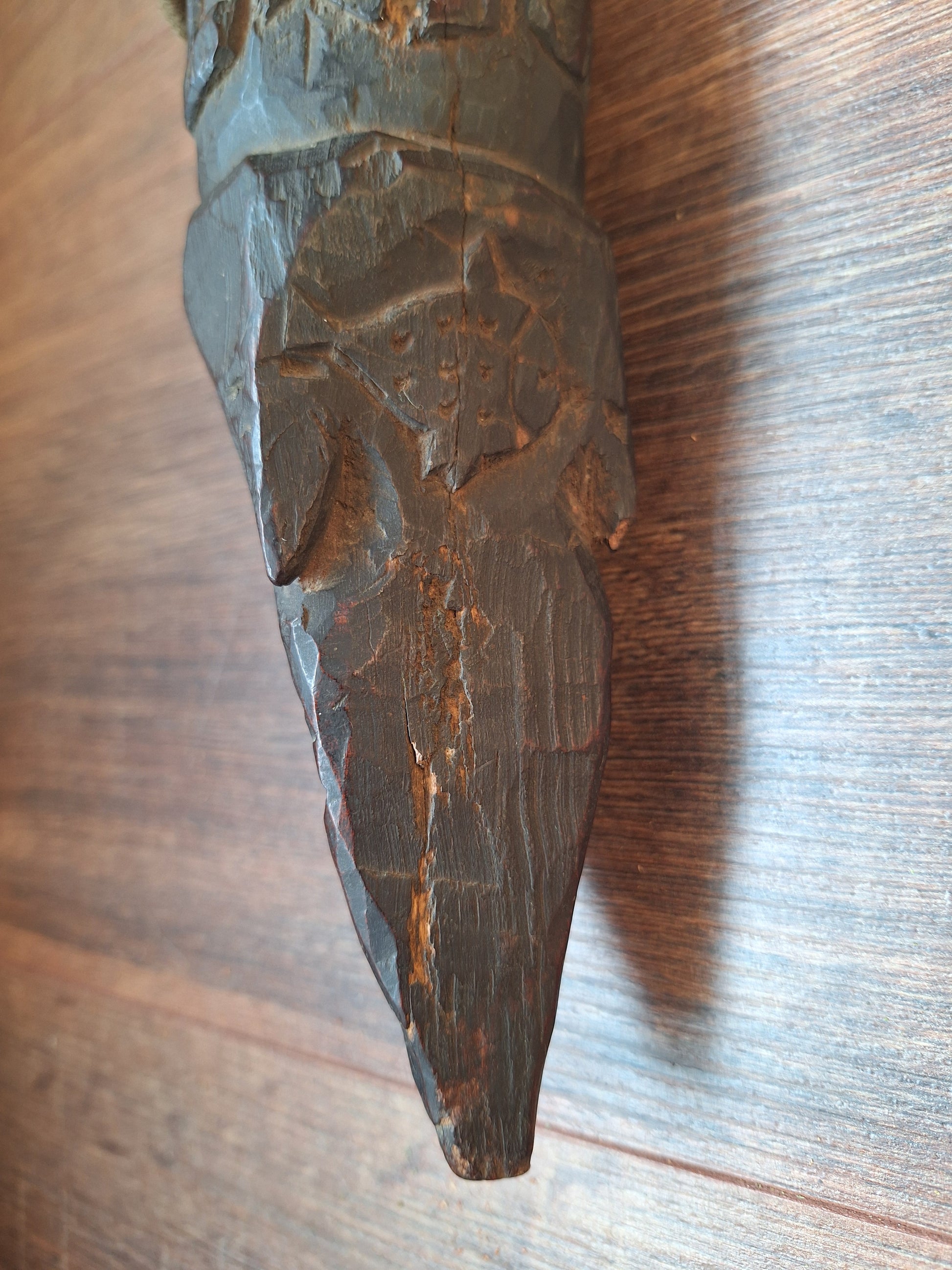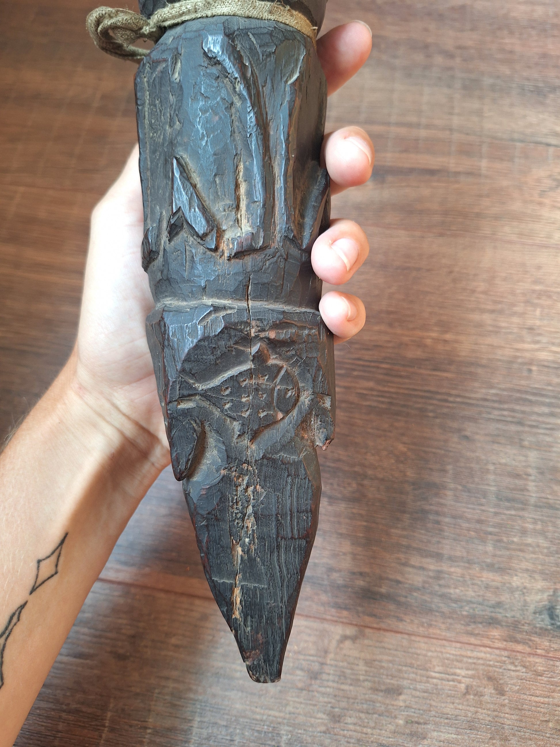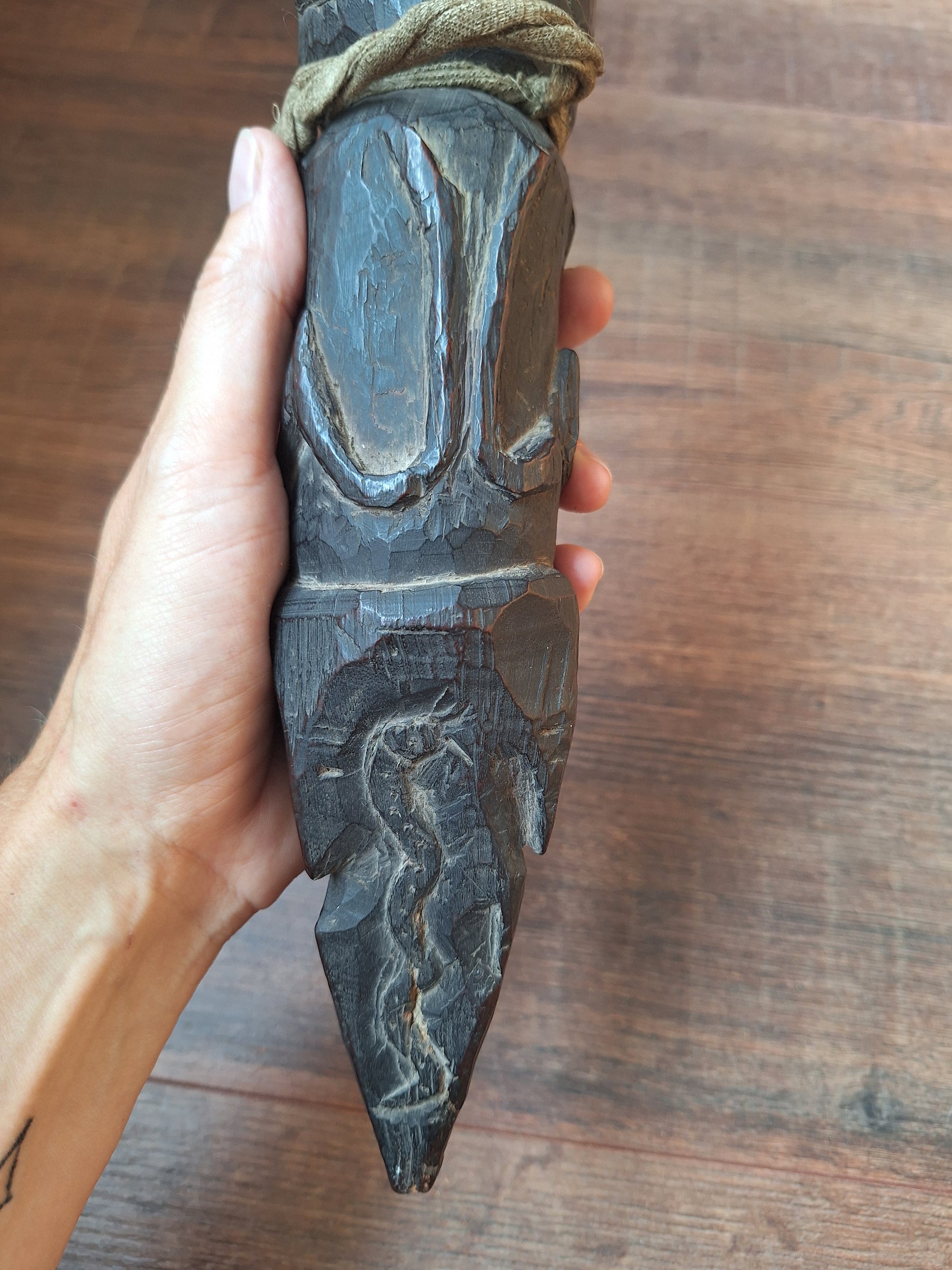 Very old wooden phurba from Nepal. Artisan handcarved in an ancient style. Please look closely at the pictures to observe the condition of this item; due to its age, this phurba shows some imperfections and damages, but overall, considering its very respectable age, still in good condition.