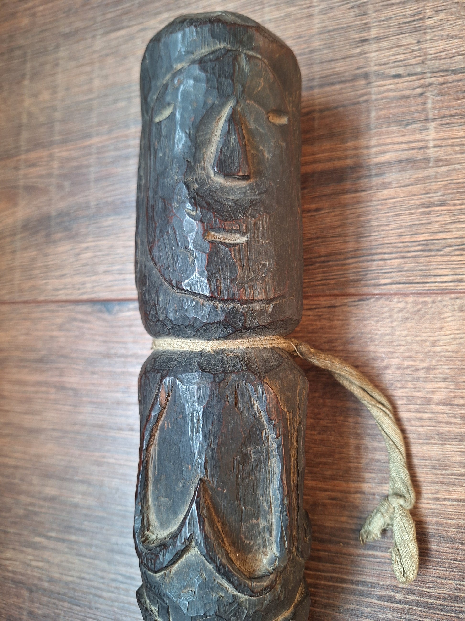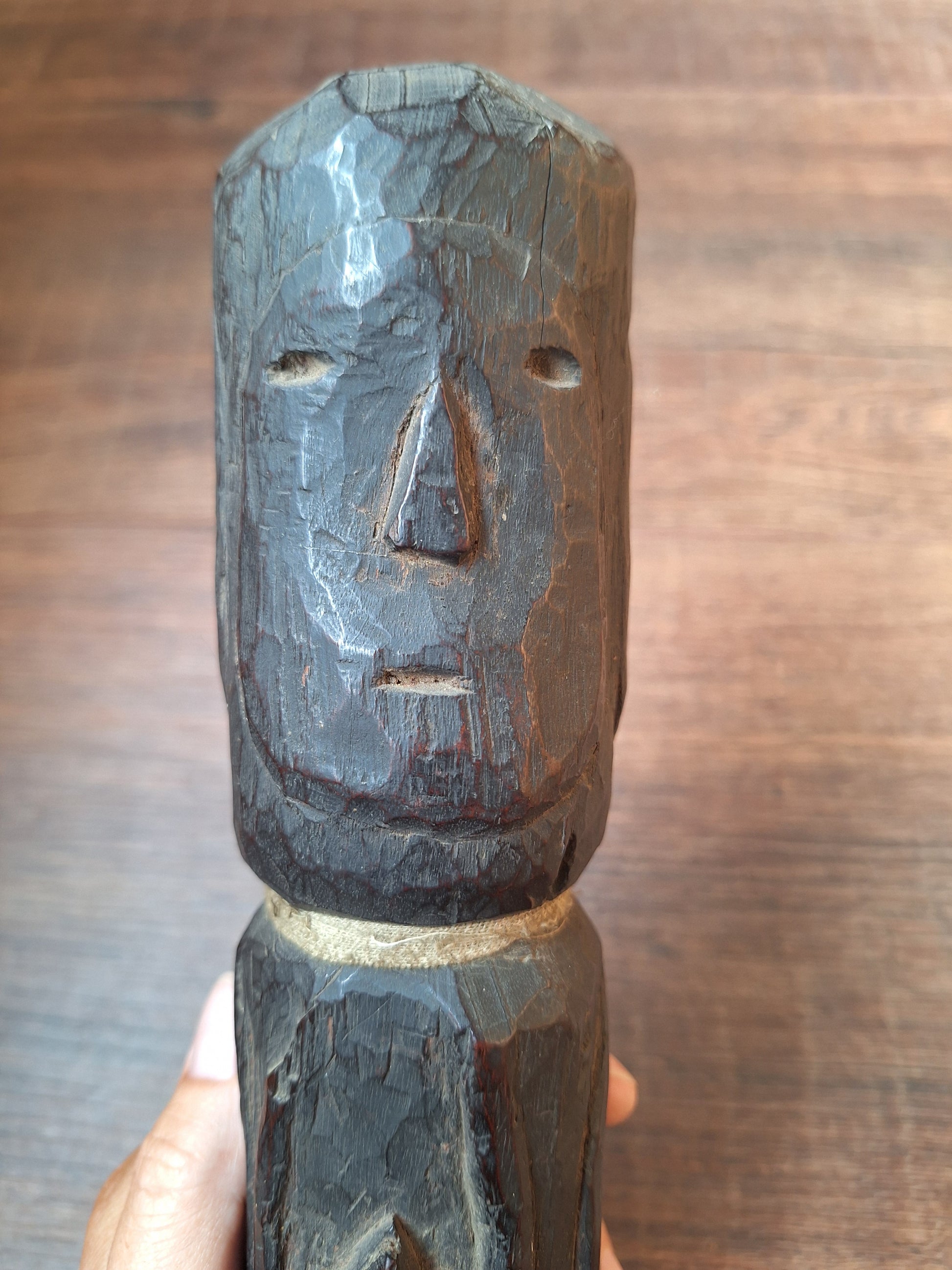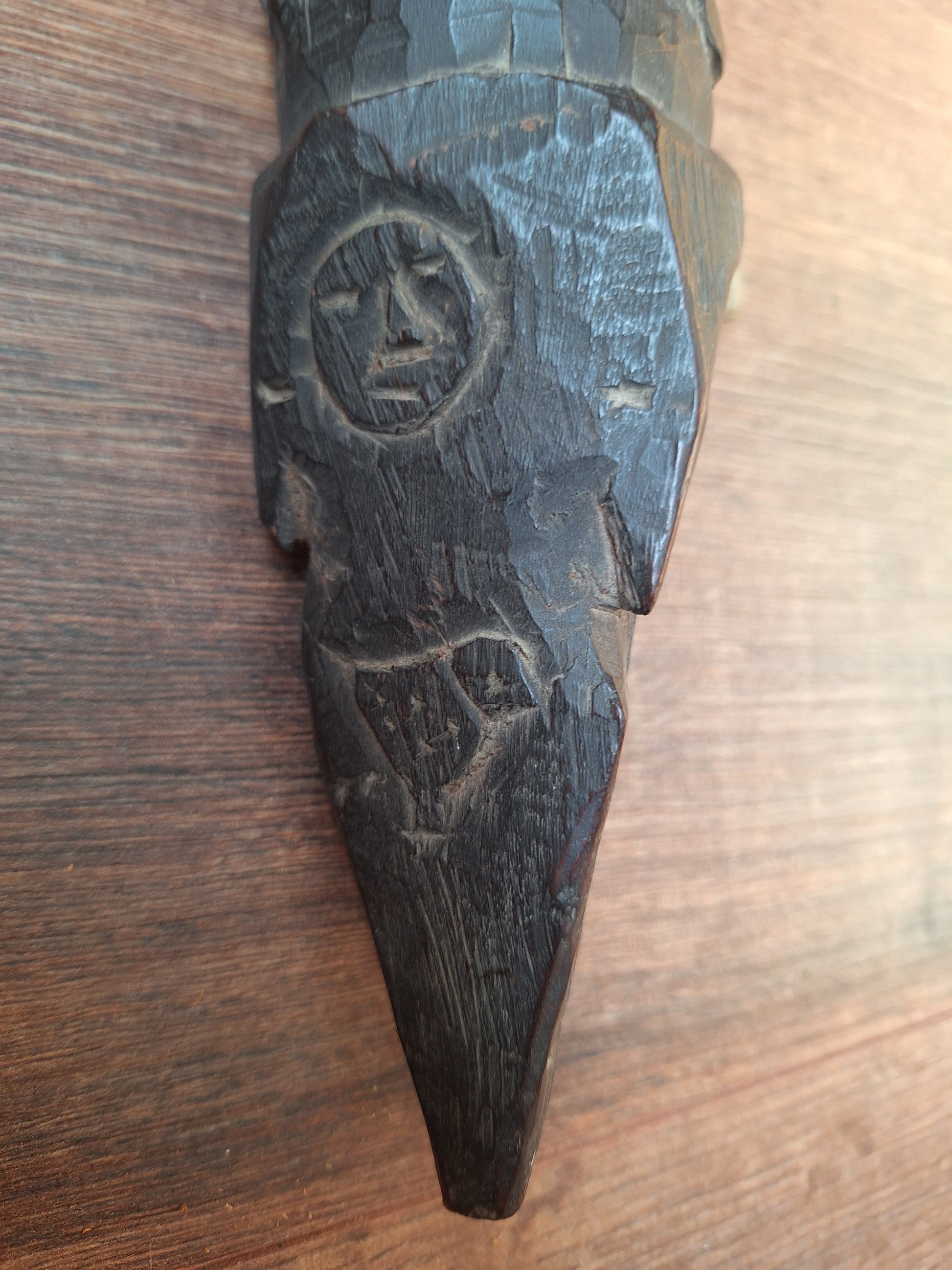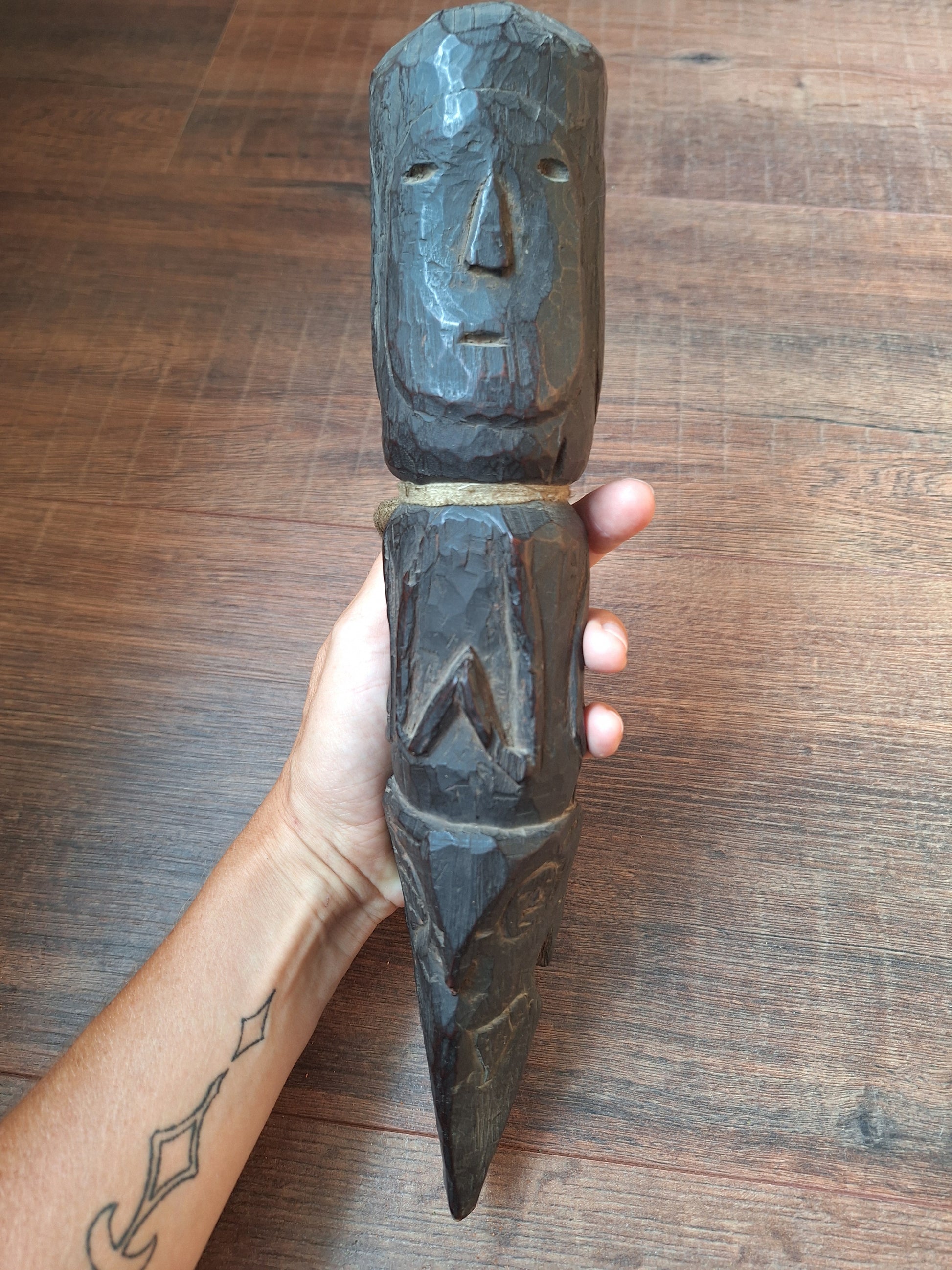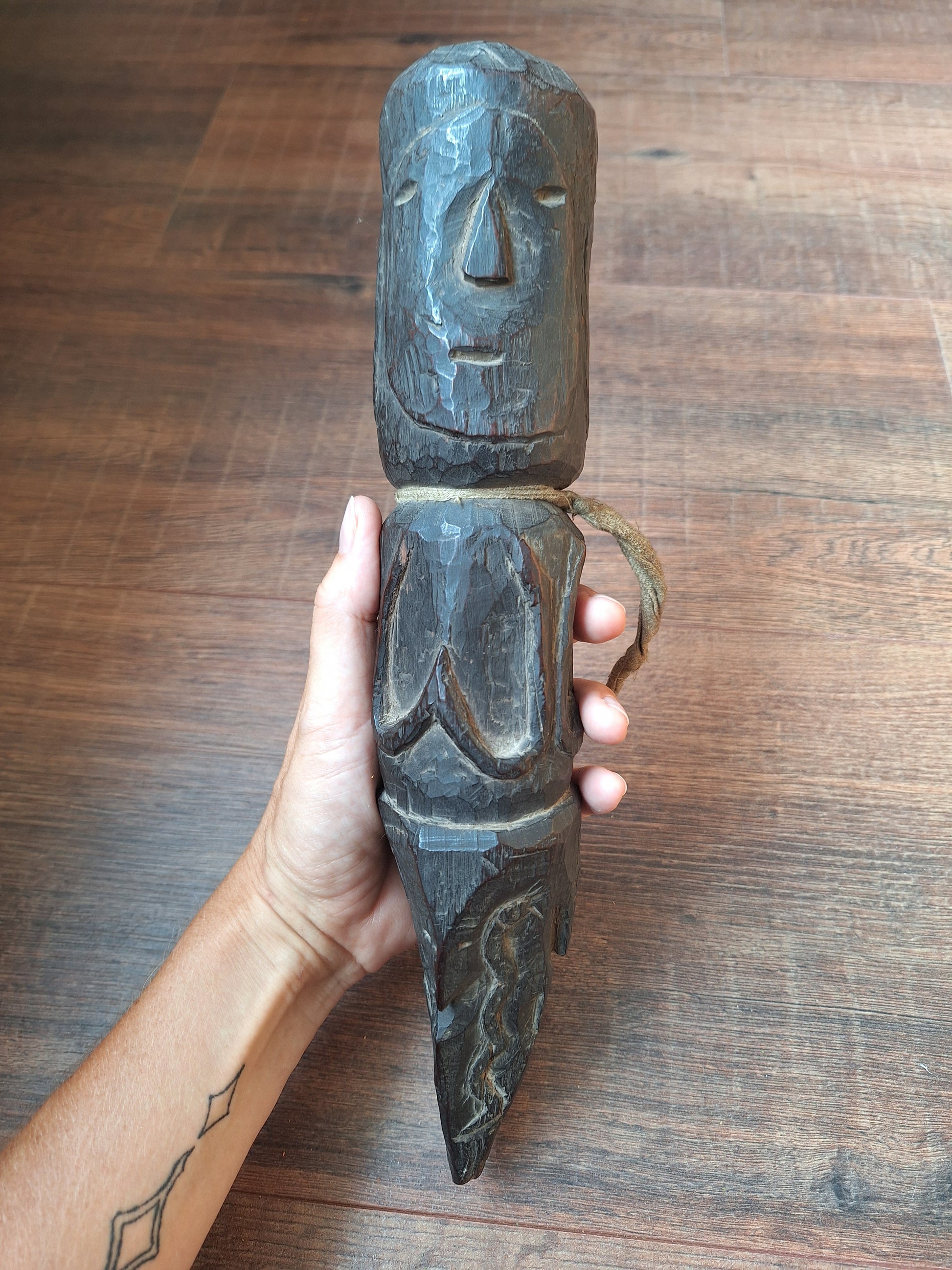 Very old wooden phurba from Nepal. Artisan handcarved in an ancient style. Please look closely at the pictures to observe the condition of this item; due to its age, this phurba shows some imperfections and damages, but overall, considering its very respectable age, still in good condition.