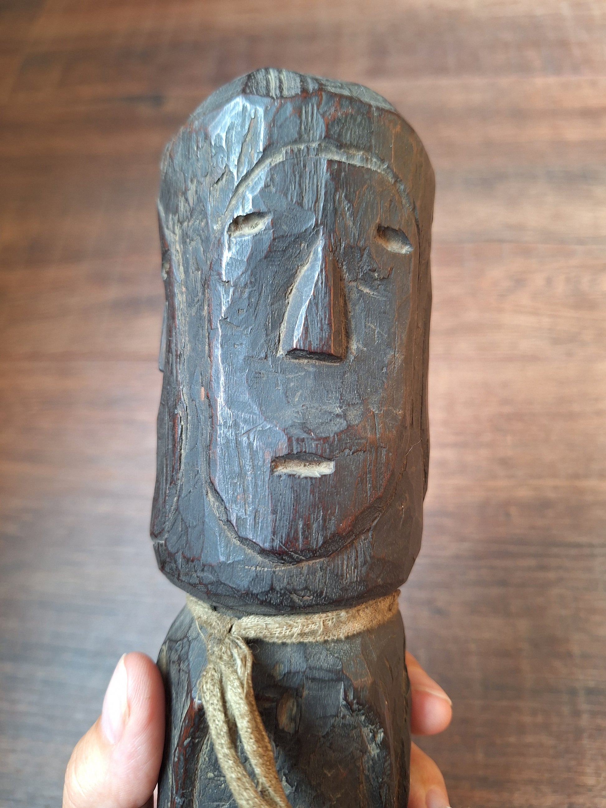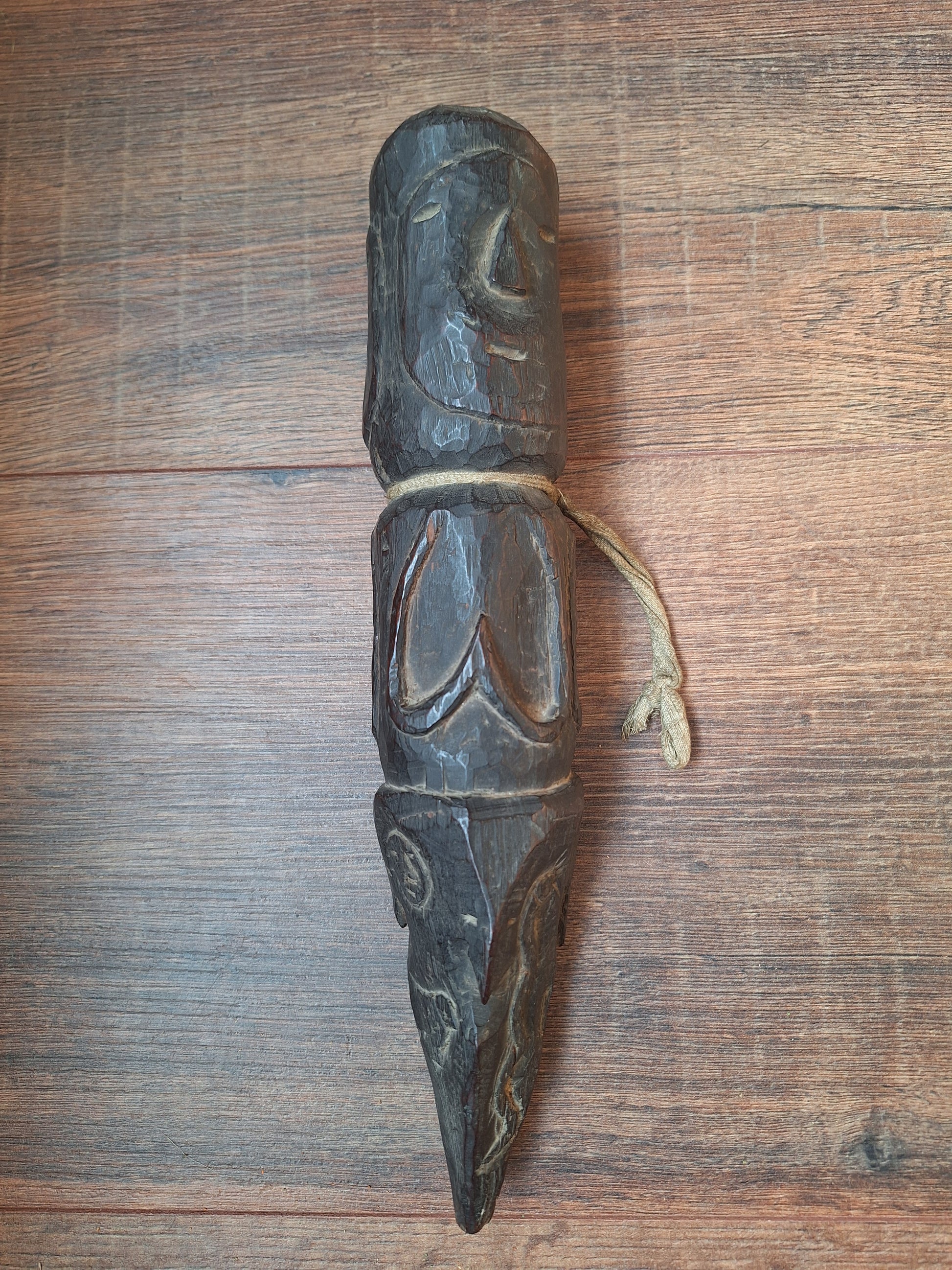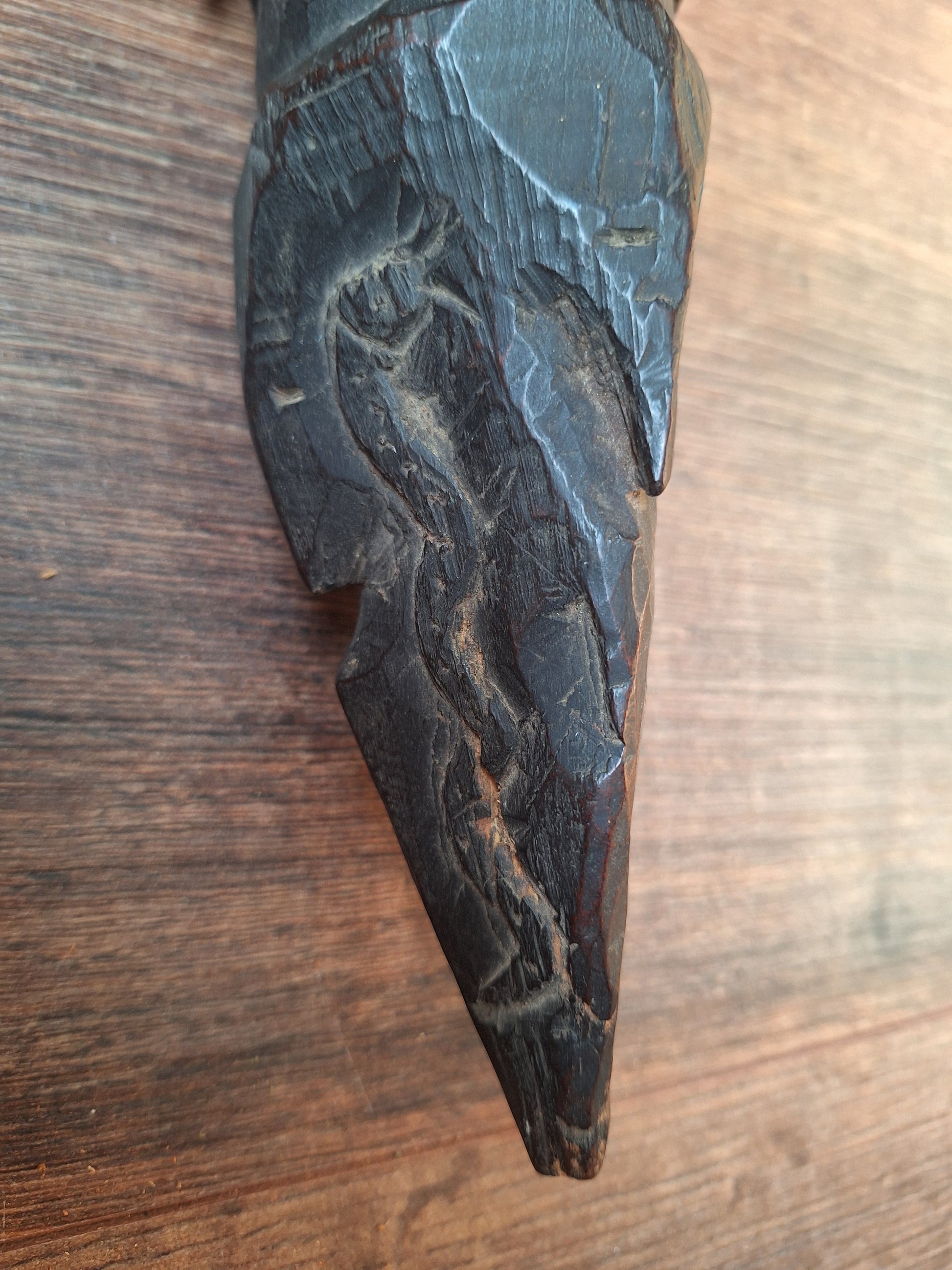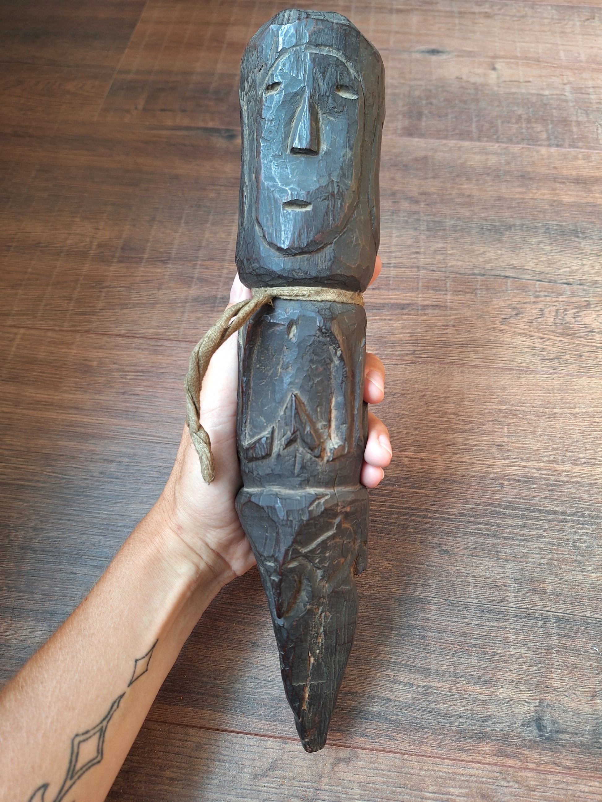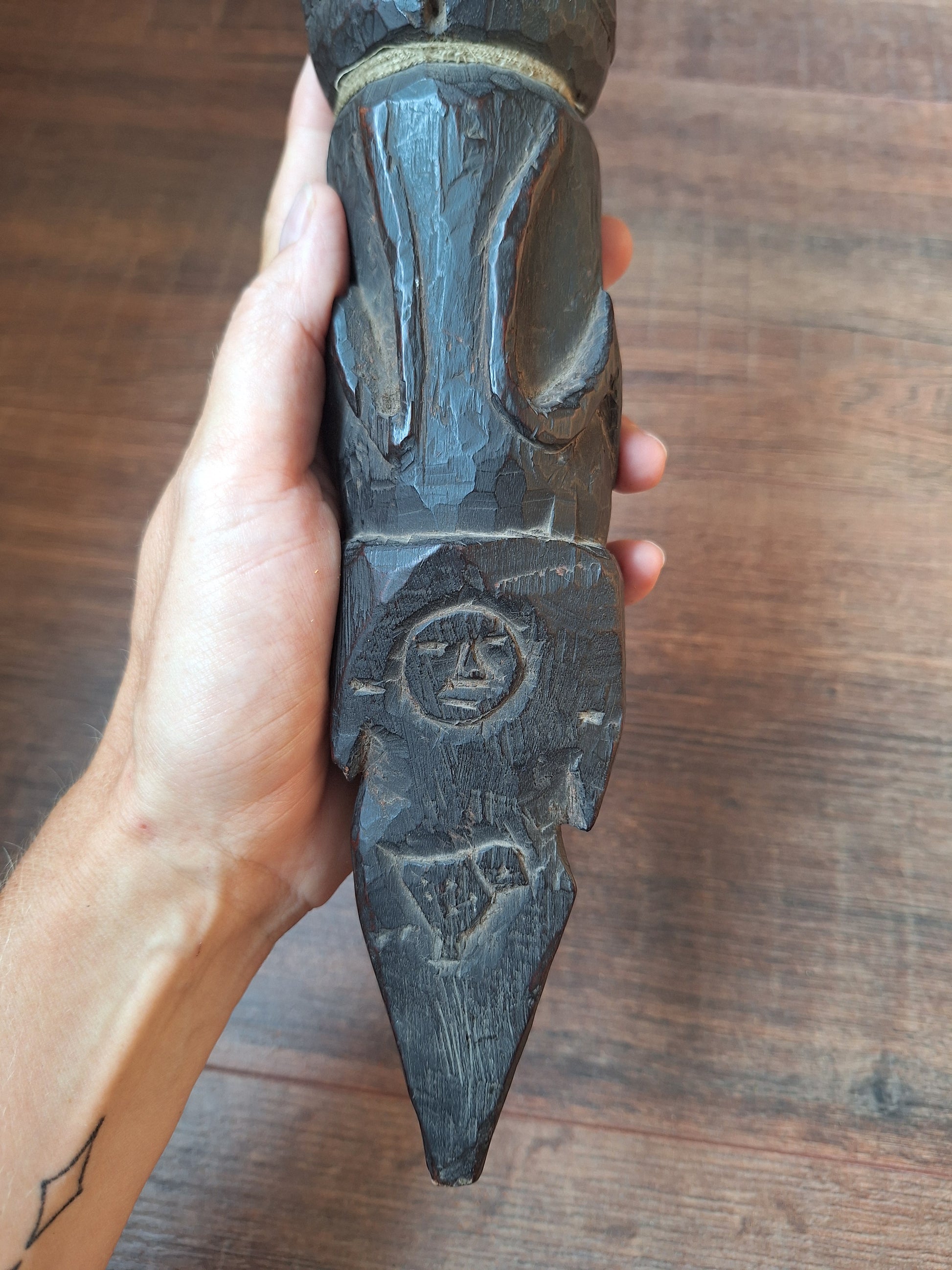 Very old wooden phurba from Nepal. Artisan handcarved in an ancient style. Please look closely at the pictures to observe the condition of this item; due to its age, this phurba shows some imperfections and damages, but overall, considering its very respectable age, still in good condition.